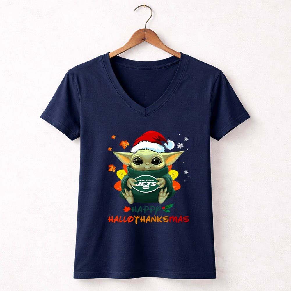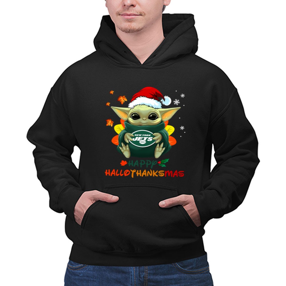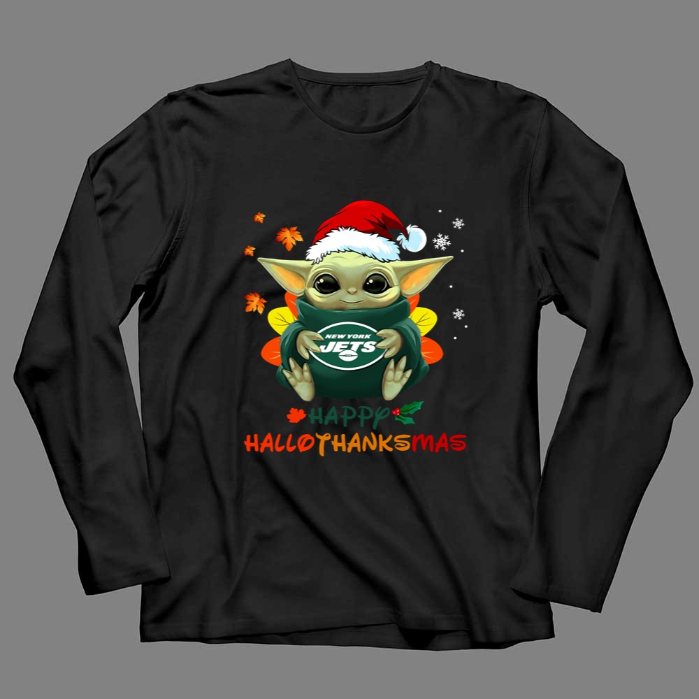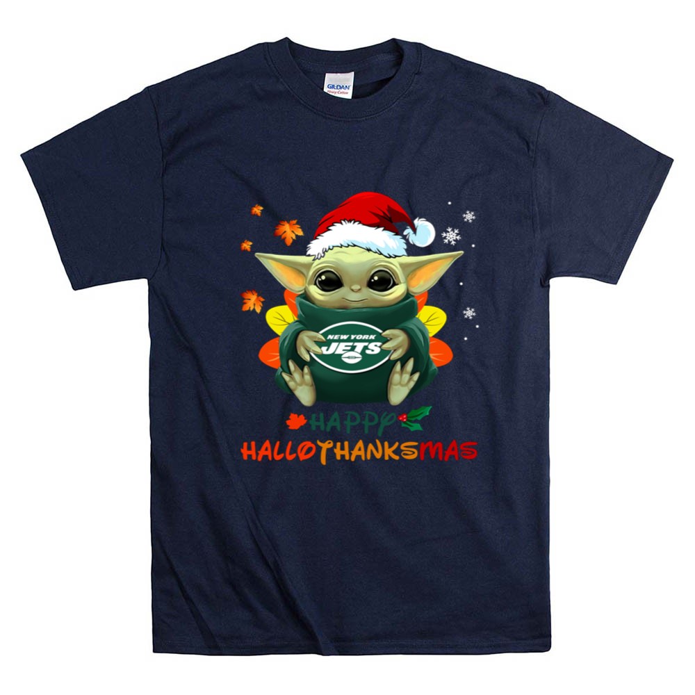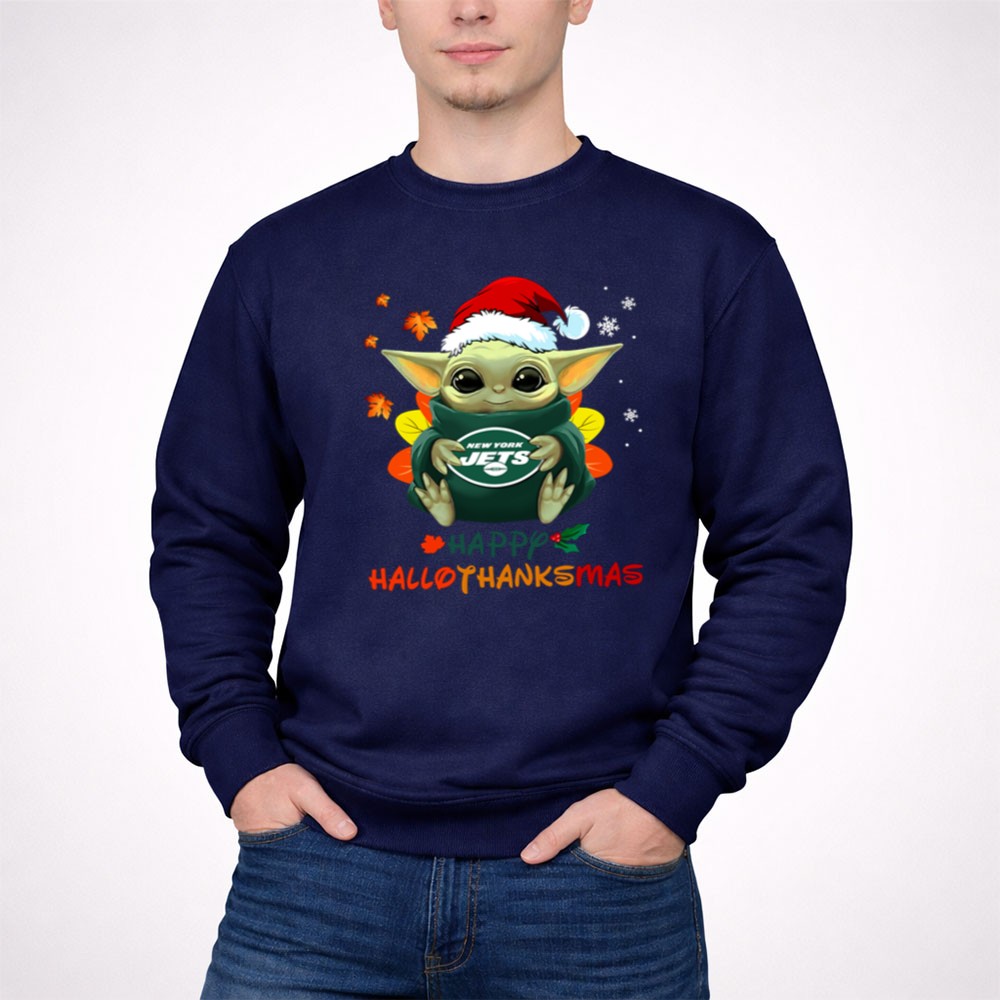 This design captures the whimsy of the holiday season, featuring Baby Yoda in a festive Santa hat, embodying the joy of family gatherings and the excitement of game day. With a New York Jets football in hand, it playfully combines fandom and holiday spirit, inviting fans to celebrate their team with a smile. The message ‘HAPPY HALLOTHANKSMAS’ encapsulates the warmth and togetherness of this special time of year.