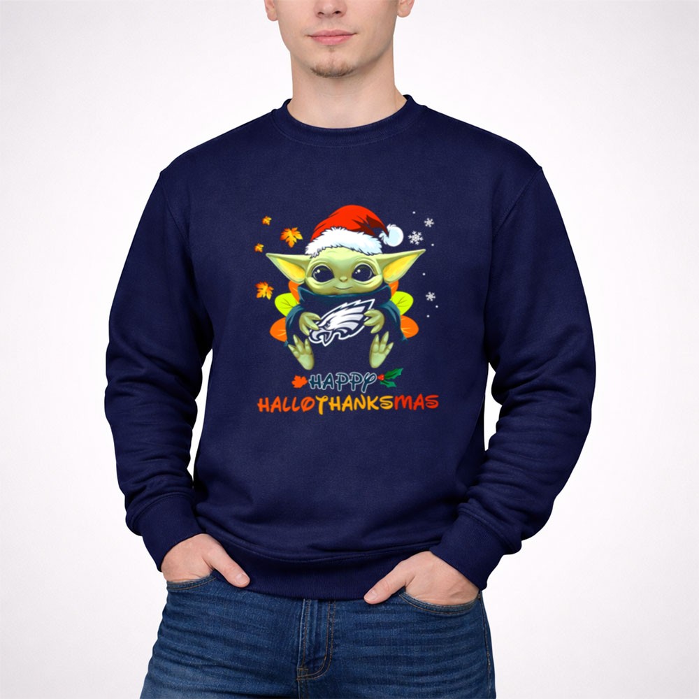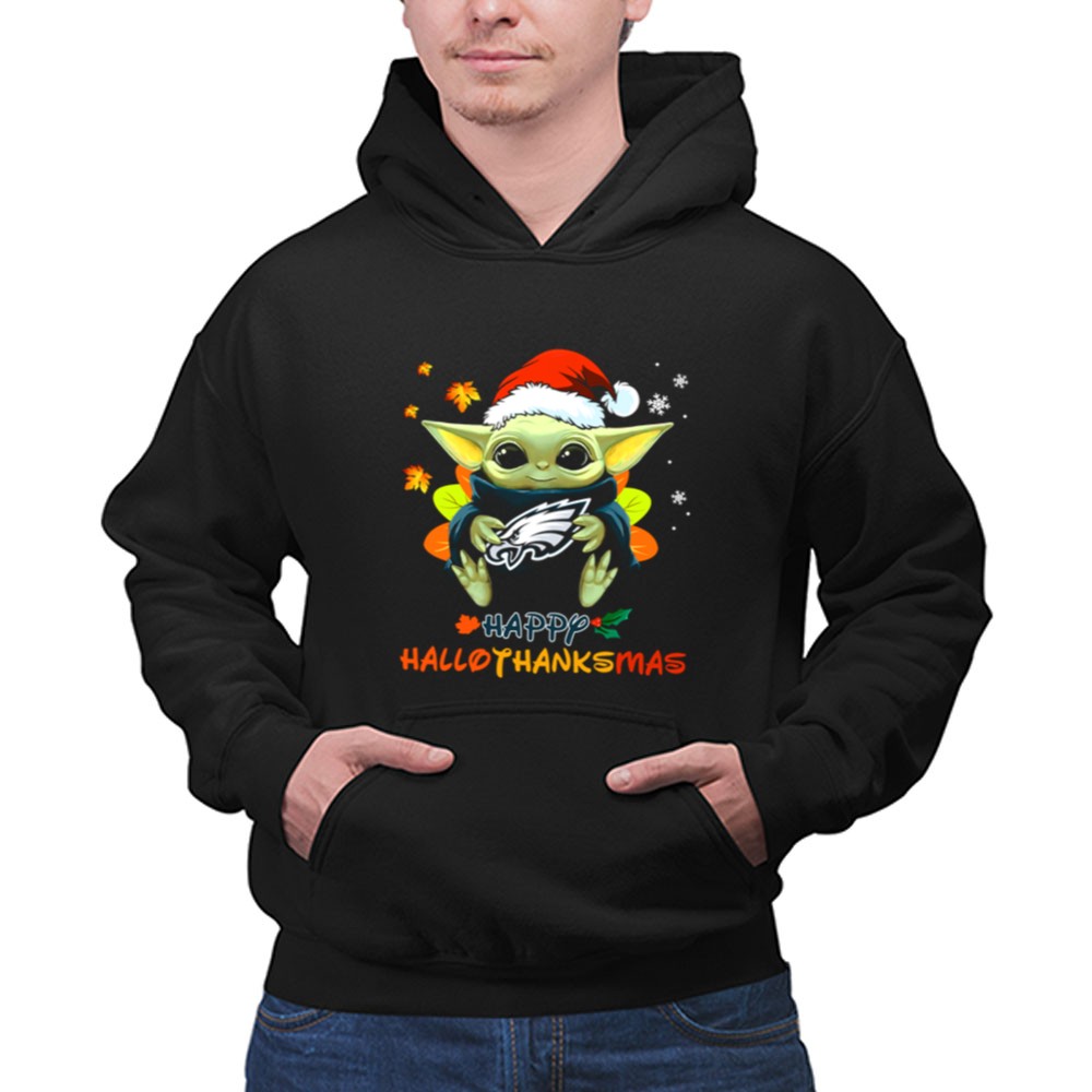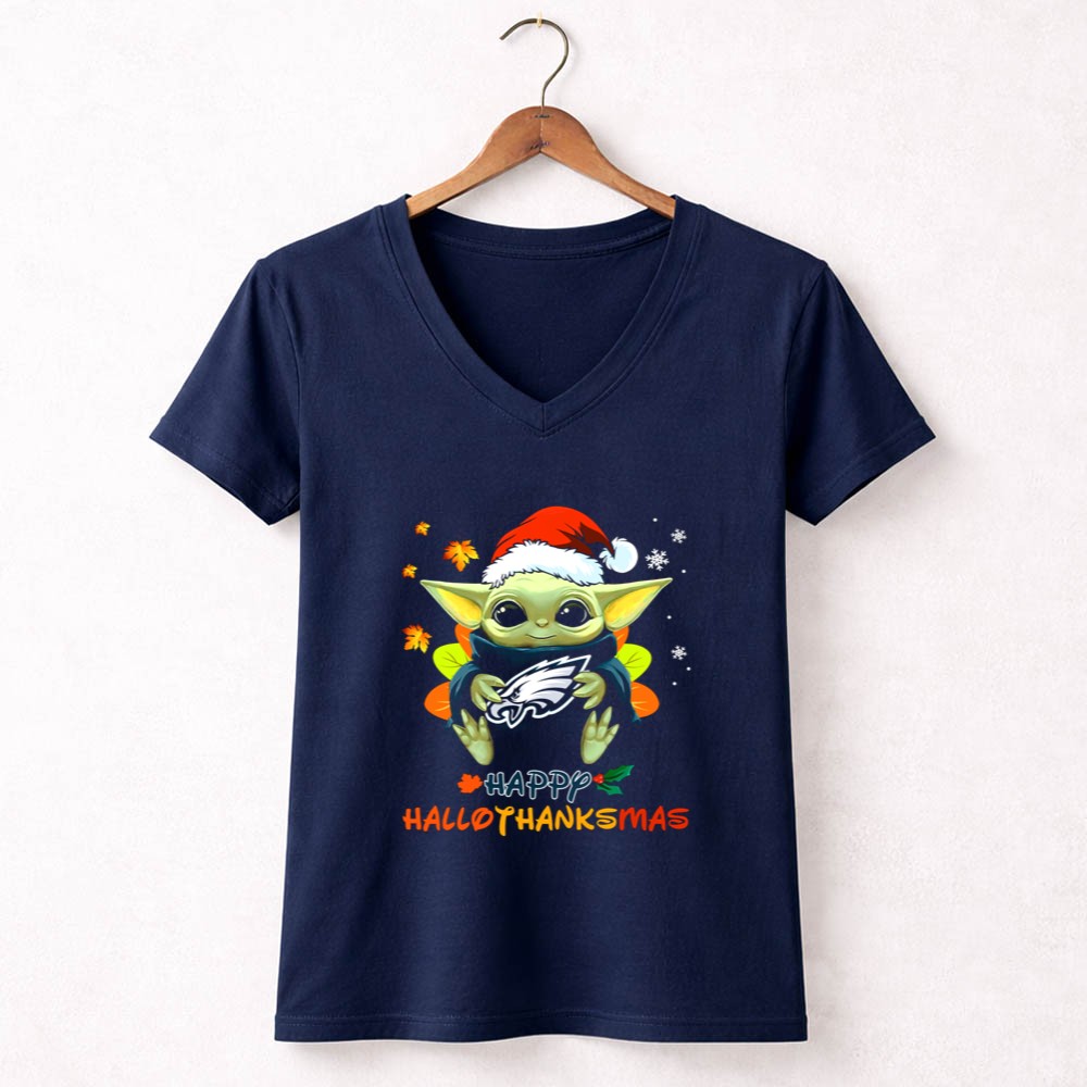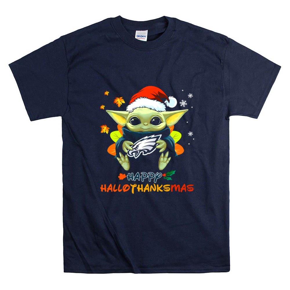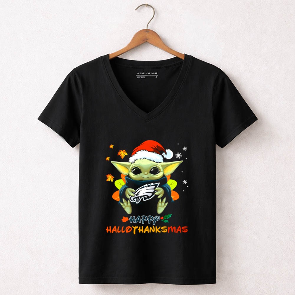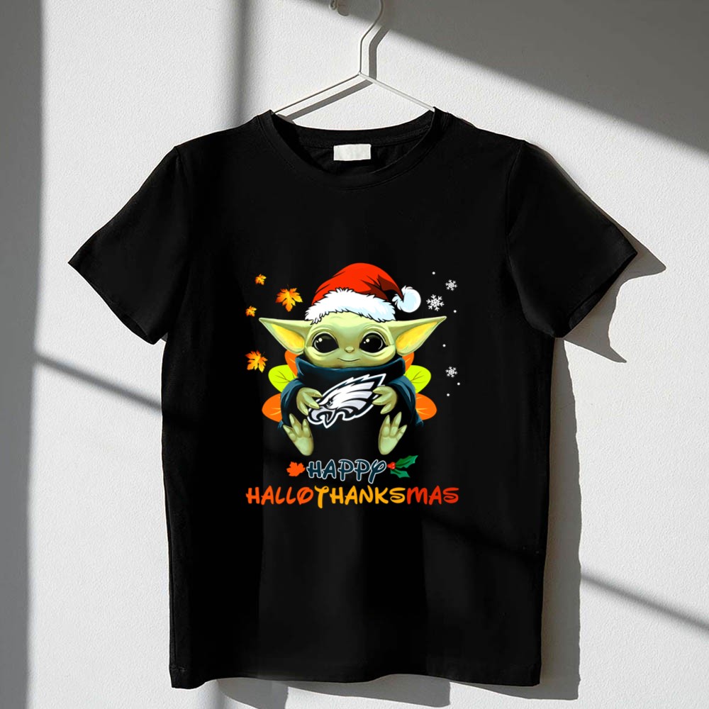 Philadelphia Eagles fan gear, Baby Yoda apparel, holiday sports shirt, festive Eagles t-shirt, Star Wars Christmas style, game day outfit, Eagles cheer, family-friendly fanwear