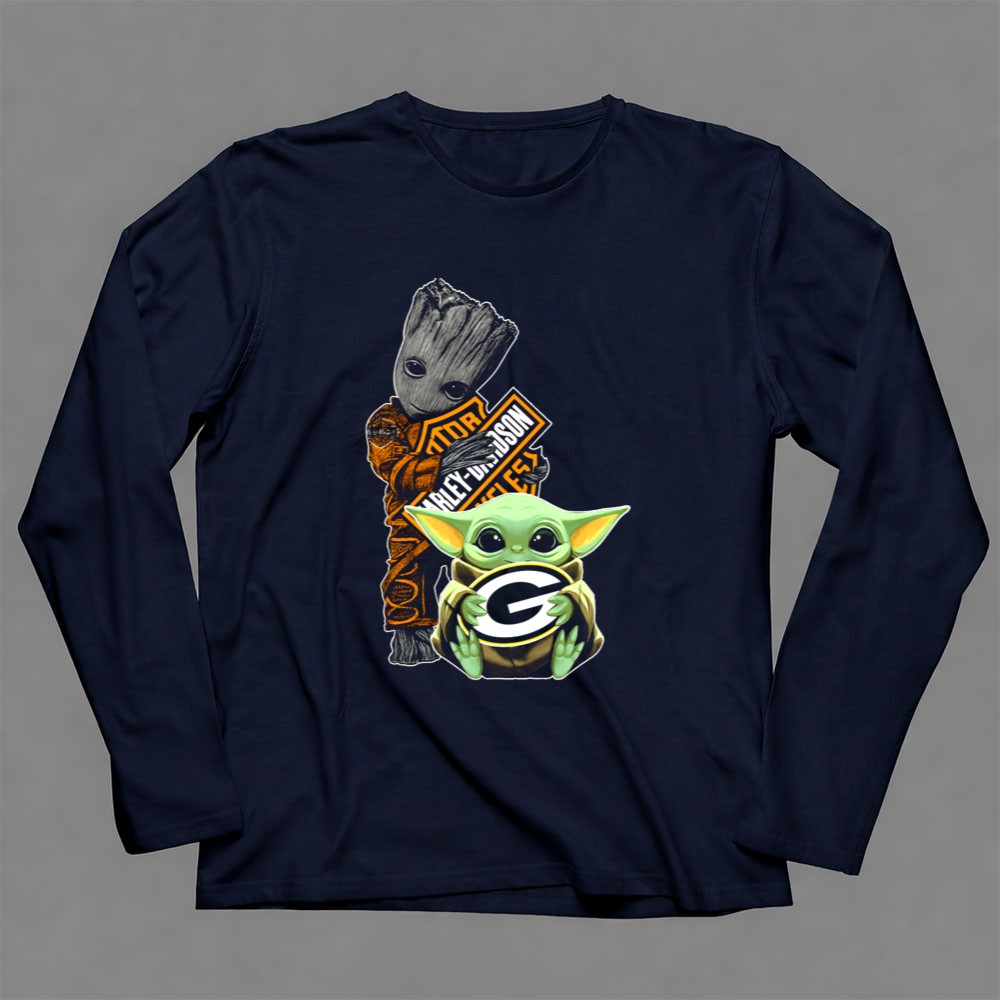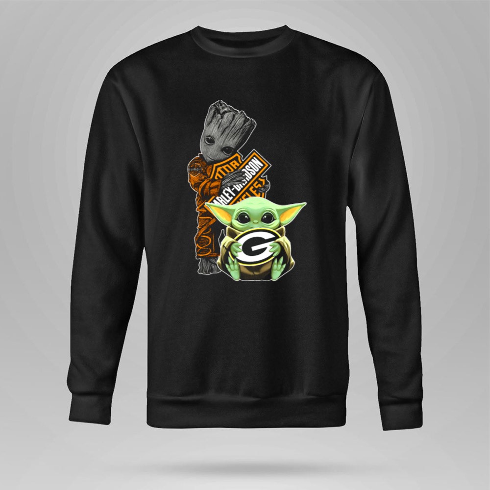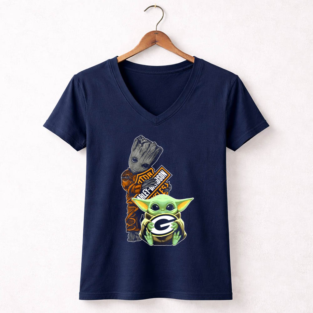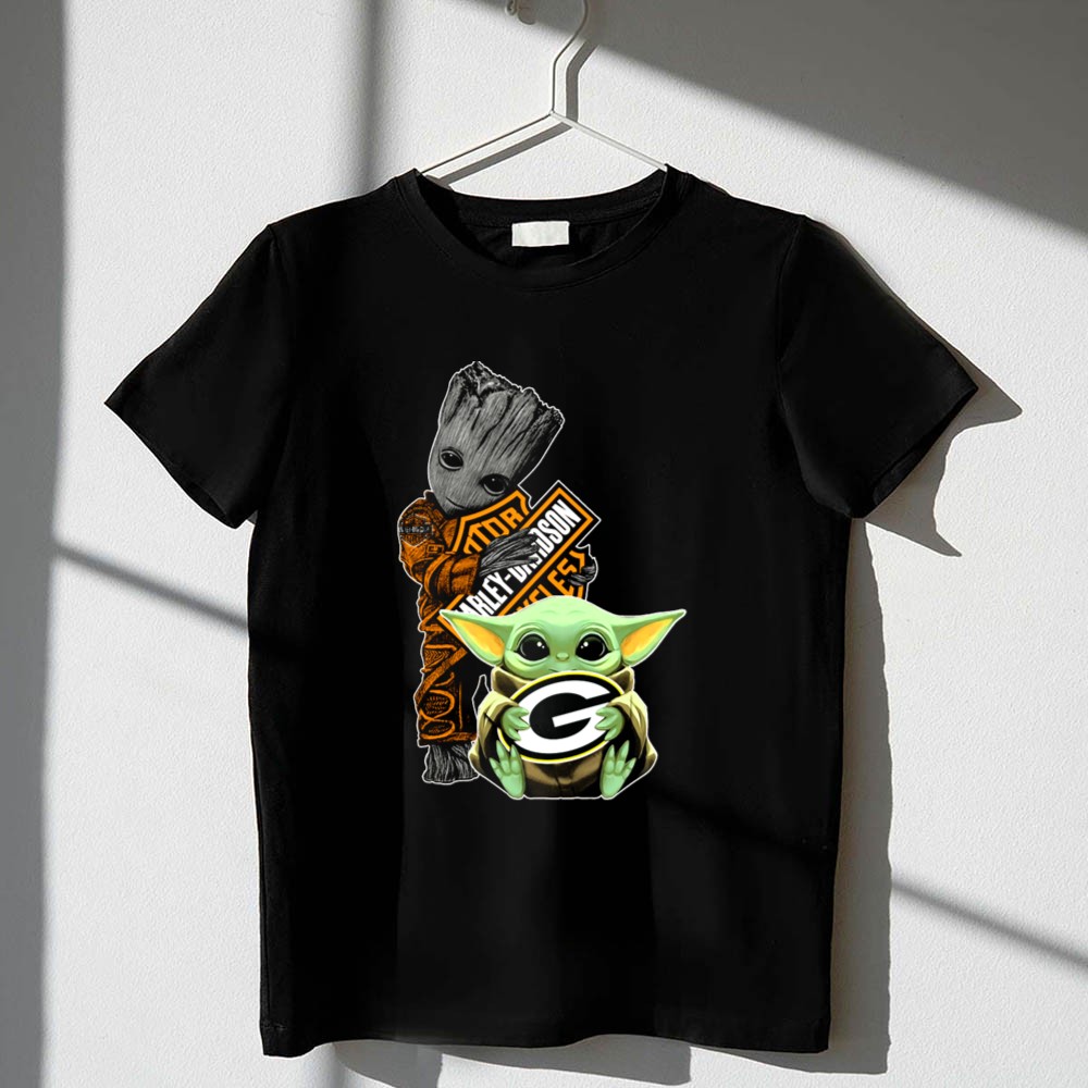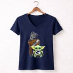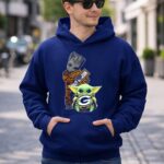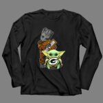 This design captures the playful fusion of two beloved universes, featuring Baby Yoda holding the Green Bay Packers logo, with Groot adding a dash of charm in the background. It embodies the spirit of camaraderie among fans, celebrating the joy of both sports and pop culture. The vibrant colors and geeky streetwear style make it a standout choice for those who cherish their interests.