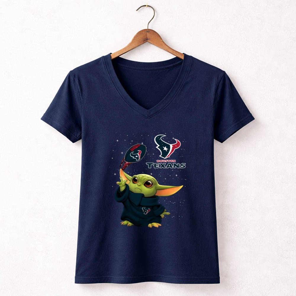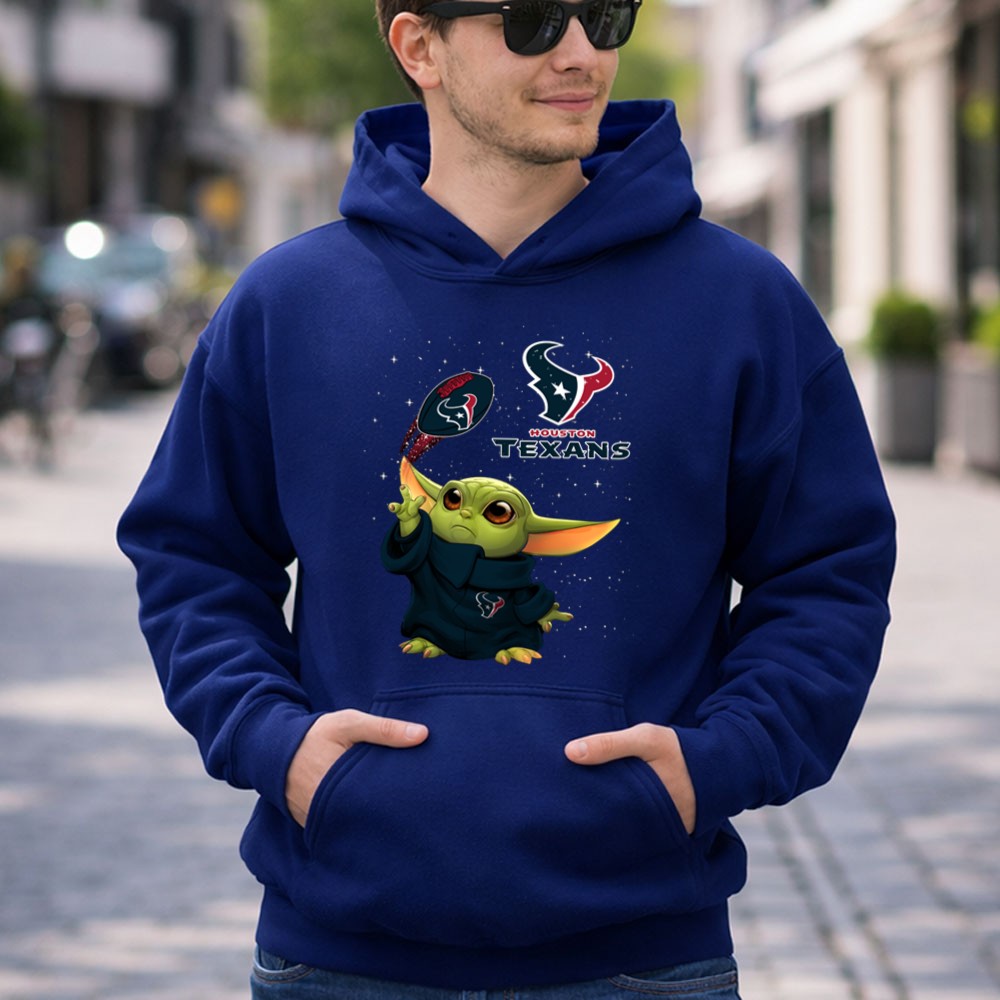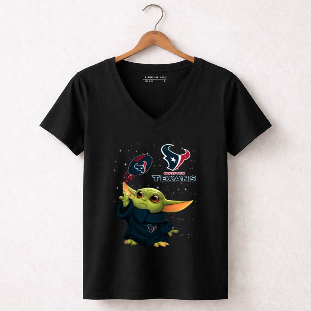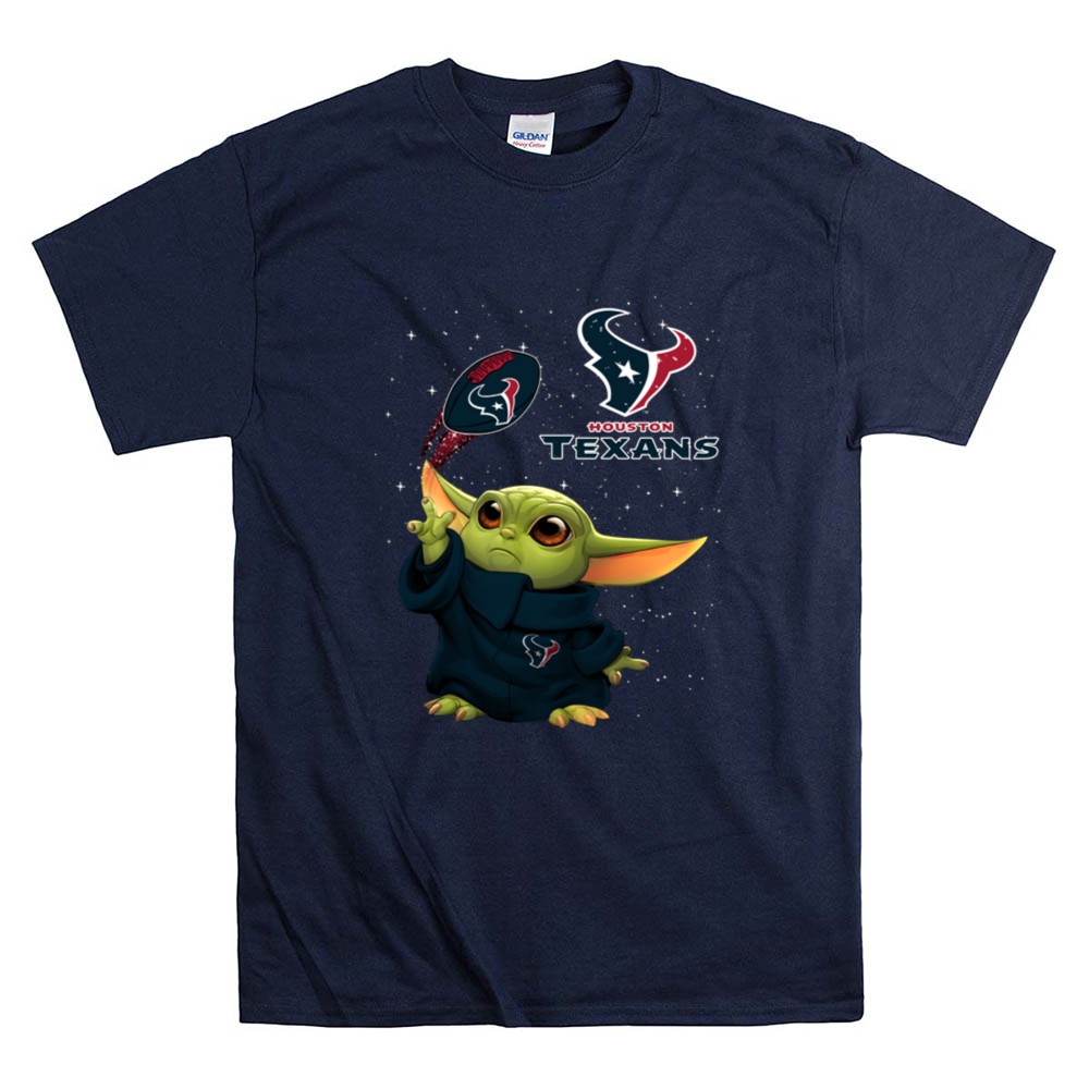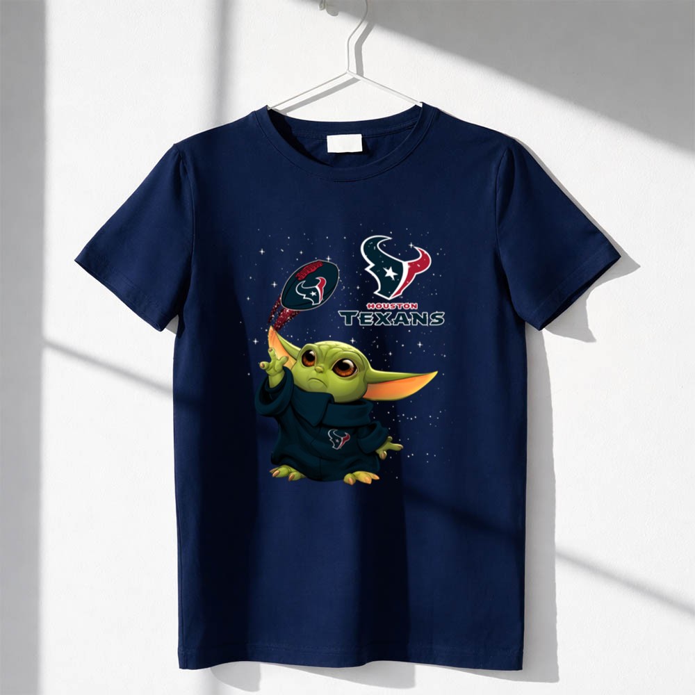 Houston Texans fan gear, Baby Yoda, NFL crossover apparel, Star Wars fandom, game day t-shirt, family-friendly sportswear, Houston football pride, unique gift for Texans fans
