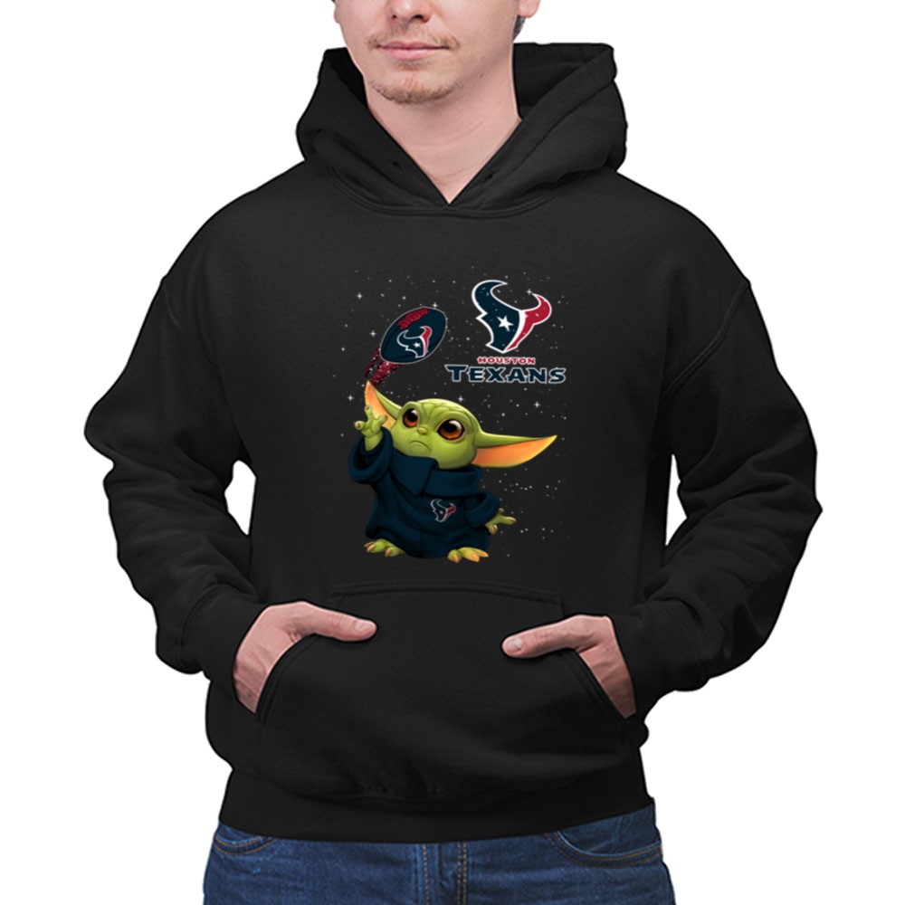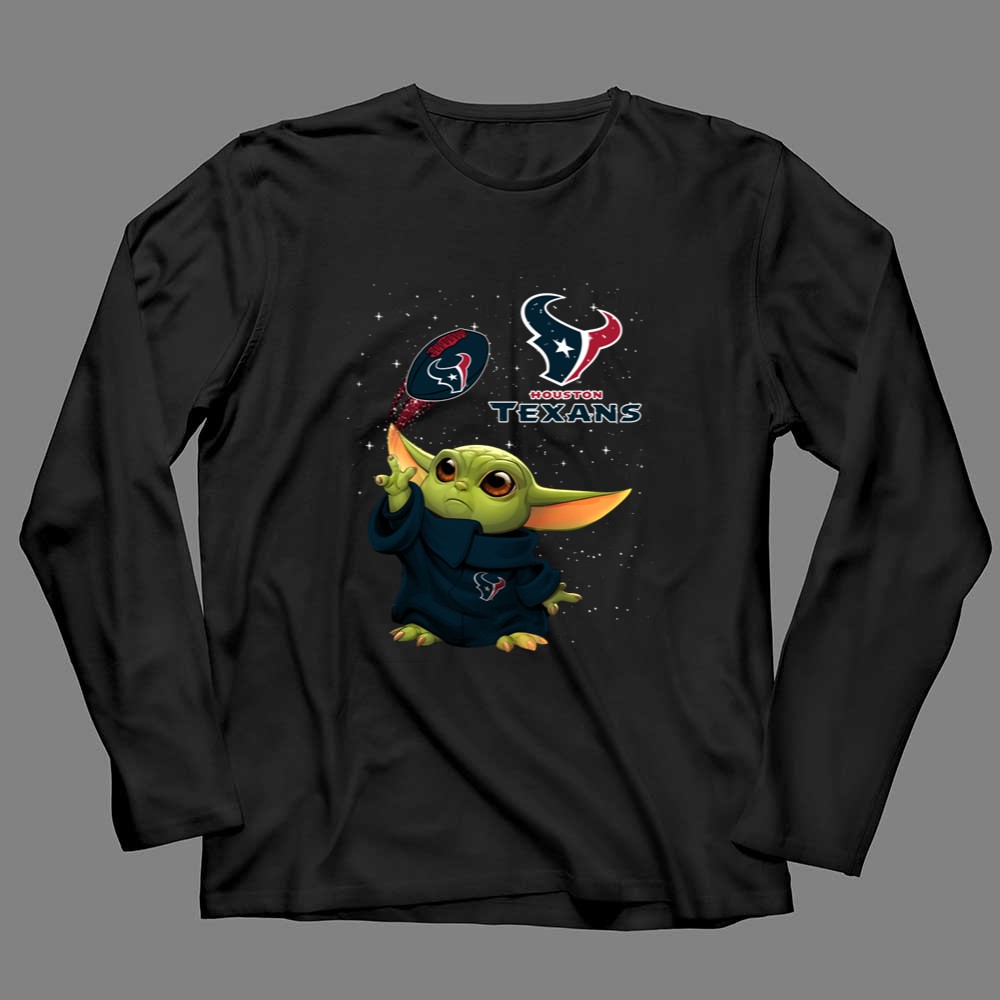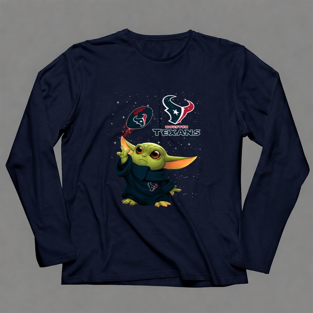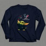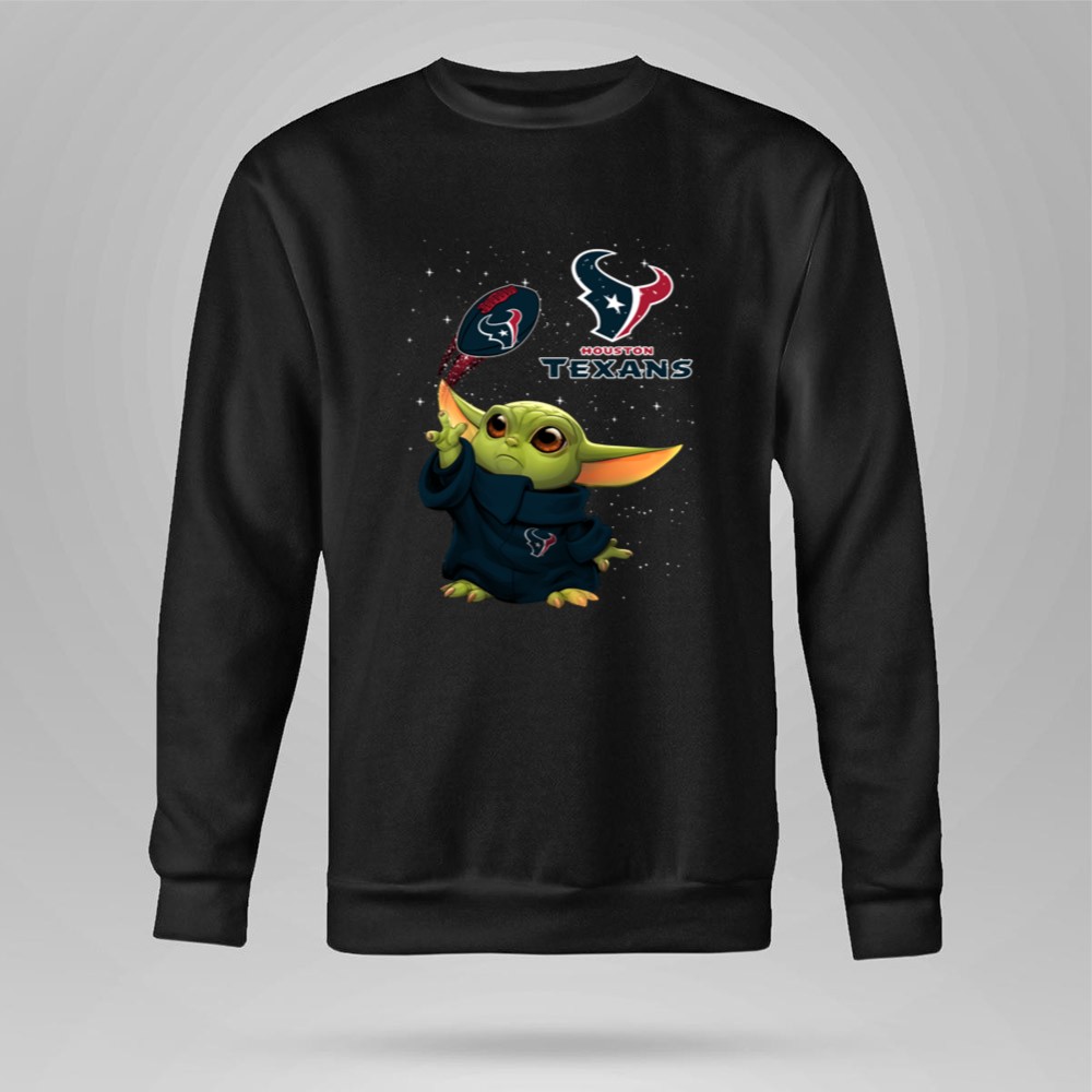 Houston Texans fan gear, Baby Yoda, NFL crossover apparel, Star Wars fandom, game day t-shirt, family-friendly sportswear, Houston football pride, unique gift for Texans fans