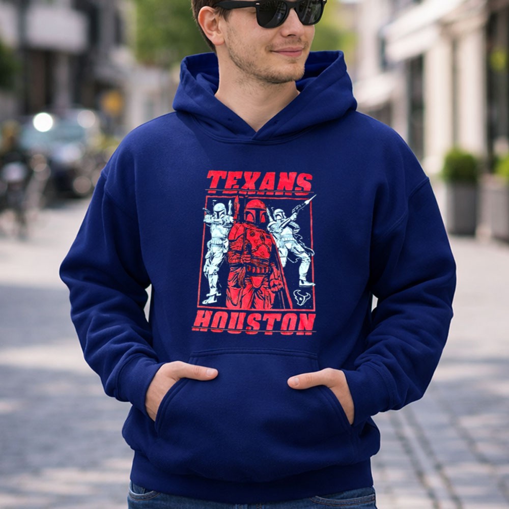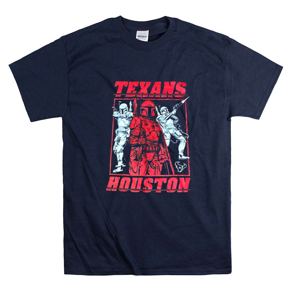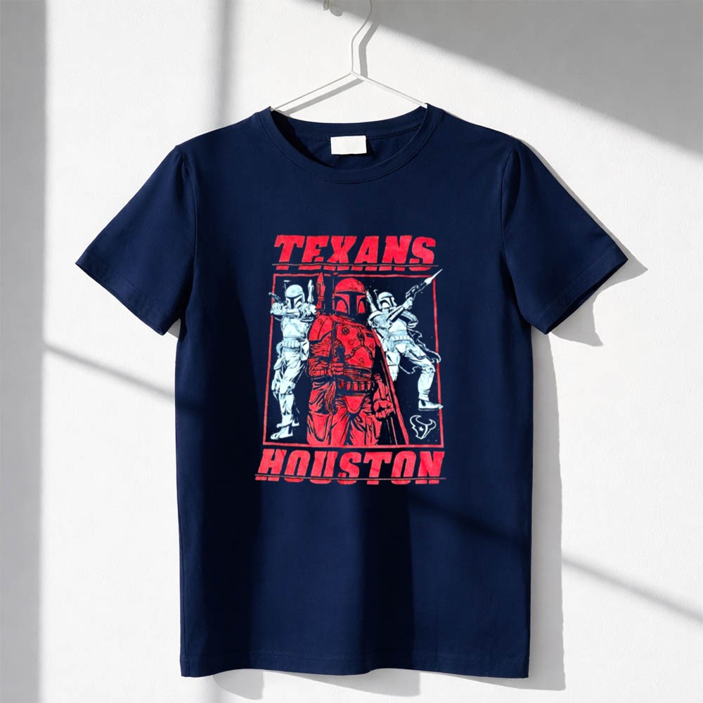 Houston Texans pride, Boba Fett graphic tee, NFL fan apparel, sci-fi sports crossover, game day shirt, Houston football culture, Star Wars merchandise, sci-fi fandom apparel