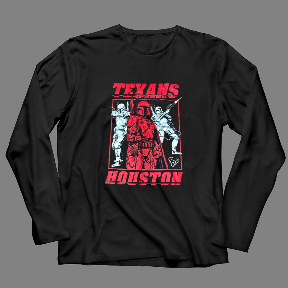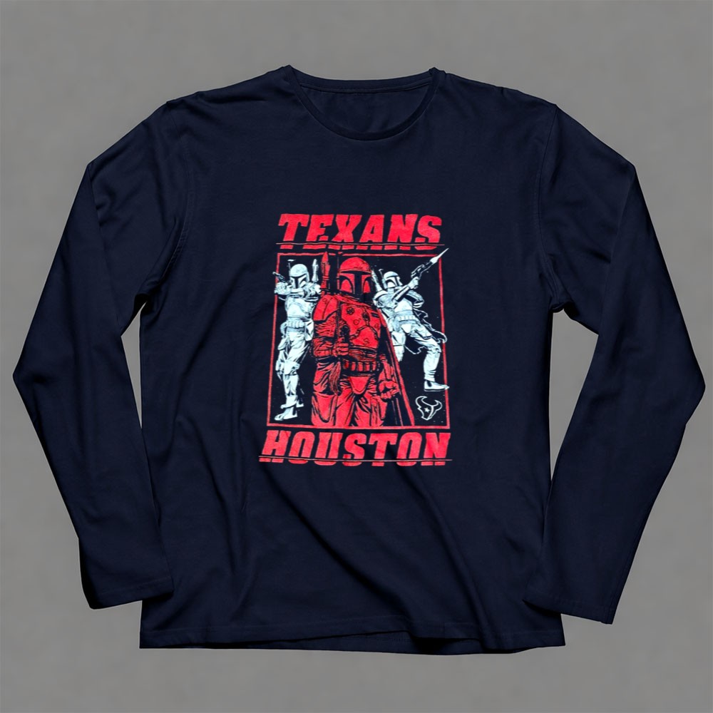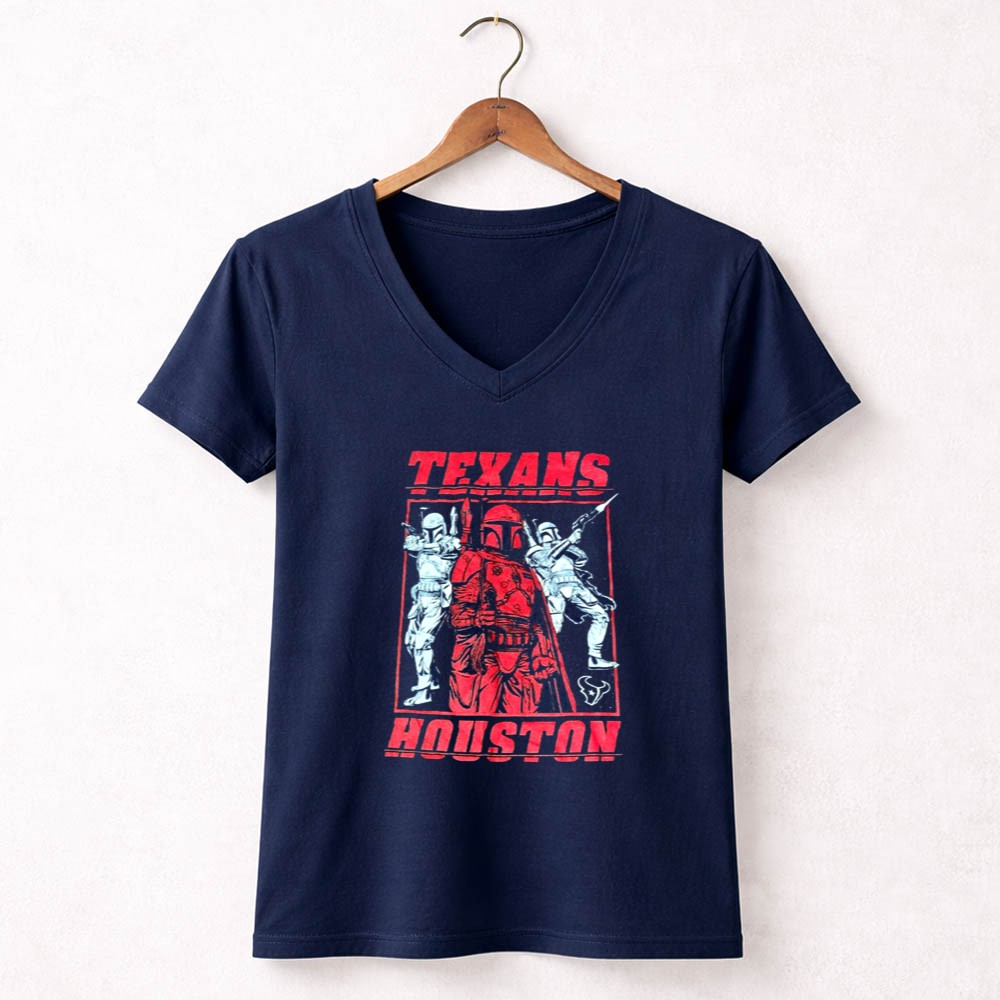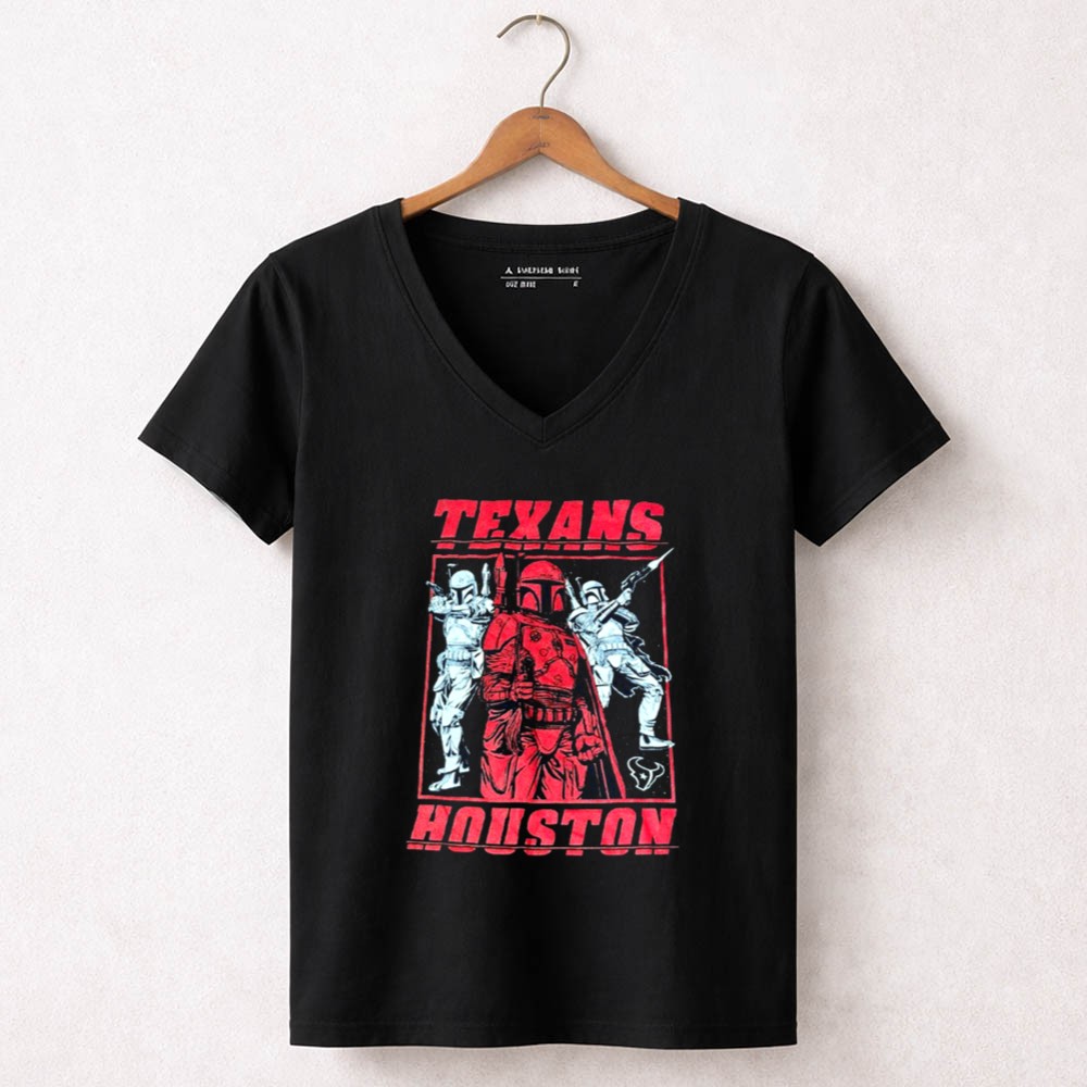 Houston Texans pride, Boba Fett graphic tee, NFL fan apparel, sci-fi sports crossover, game day shirt, Houston football culture, Star Wars merchandise, sci-fi fandom apparel