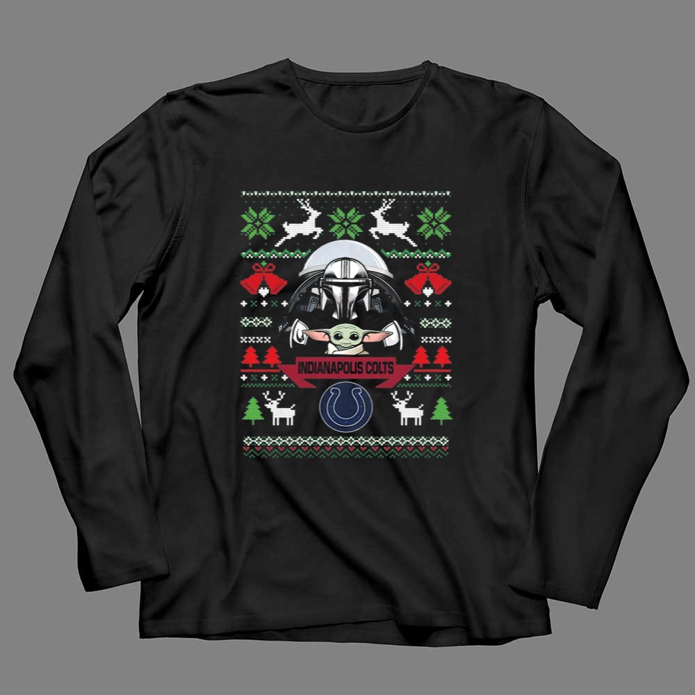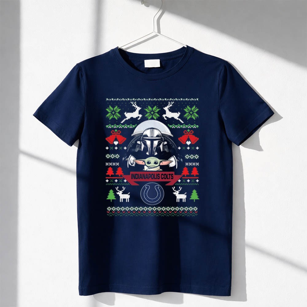 This design captures the festive spirit by bringing together the Indianapolis Colts logo and a charming depiction of Darth Vader cradling Baby Yoda. It’s a playful mashup that celebrates both the joy of football and the magic of the holiday season, inviting fans to share laughter and cheer with loved ones. The vibrant holiday theme evokes a sense of nostalgia for iconic pop culture moments, making it a treasured addition to any festive wardrobe.