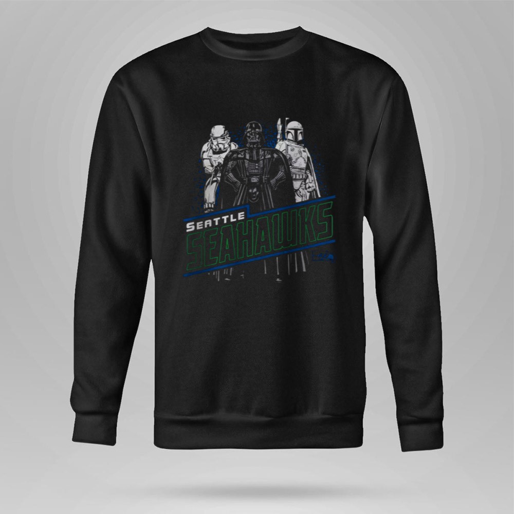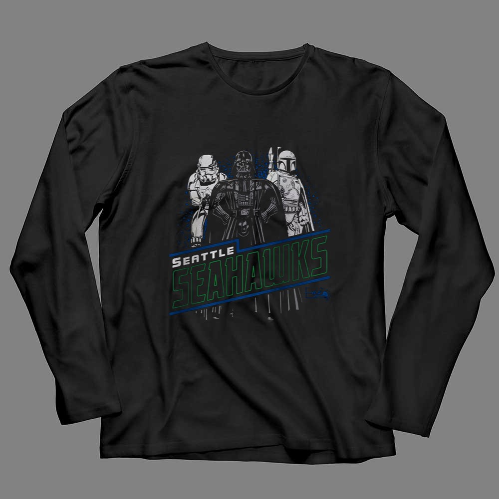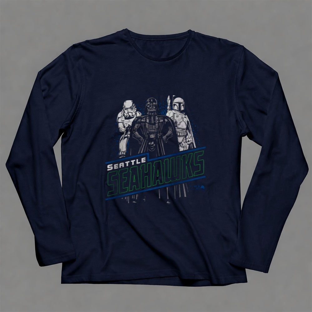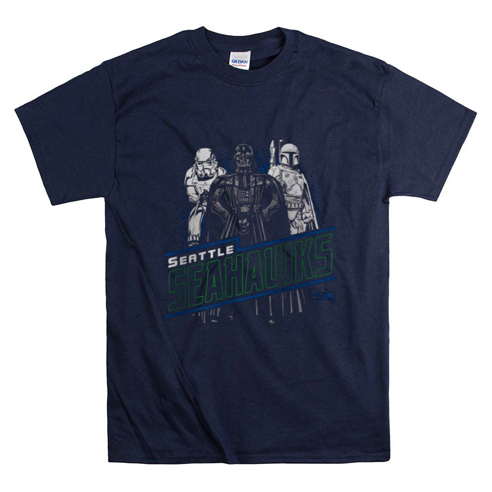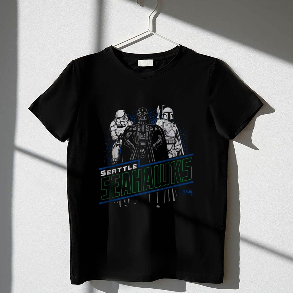 Seattle sports pride, Seahawks fandom, Star Wars mashup, game day apparel, iconic characters, NFL fan gear, sci-fi sports shirt, premium cotton tee