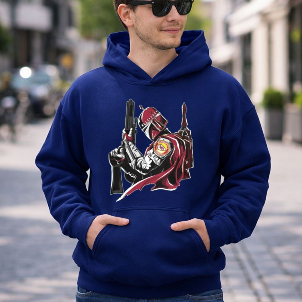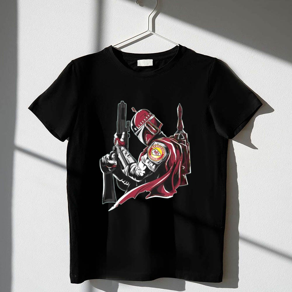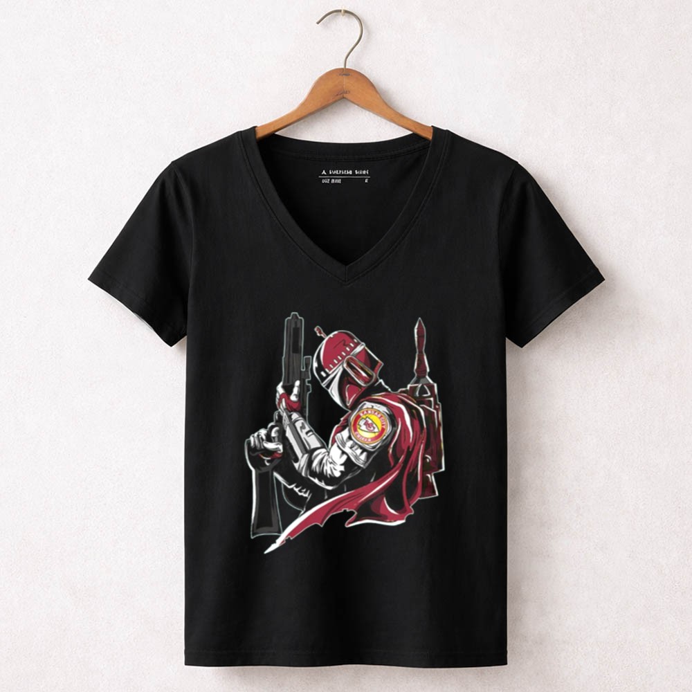 This design encapsulates the excitement of game day and the allure of sci-fi, merging the iconic Kansas City Chiefs logo with the Mandalorian’s fierce weaponry. It celebrates the unique bond between sports enthusiasts and Star Wars fans, inviting wearers to honor their passions in a bold, artistic way.