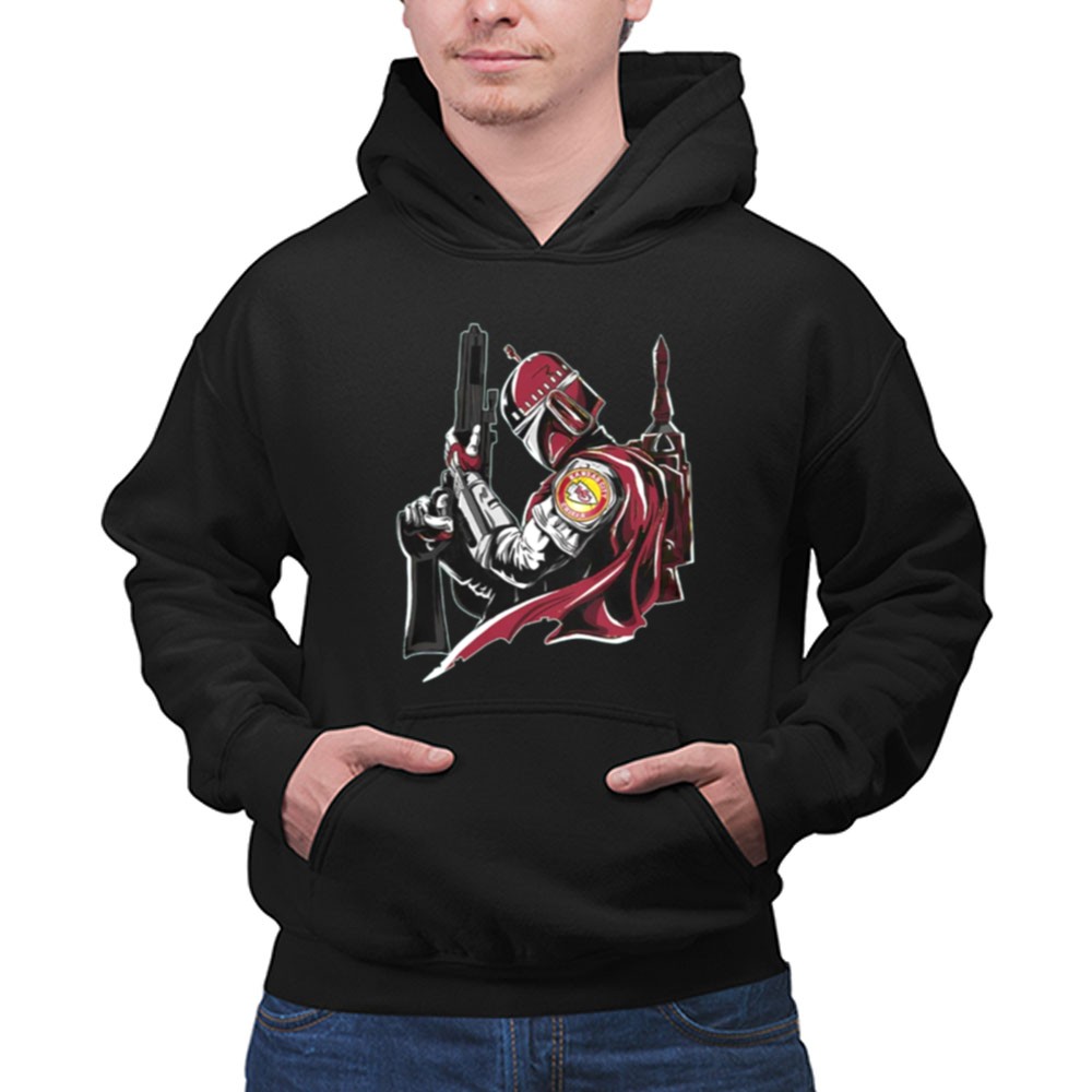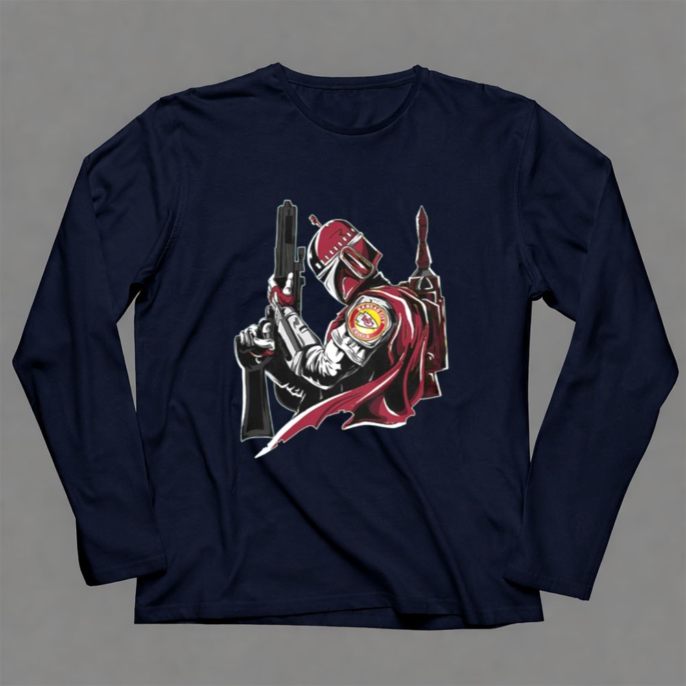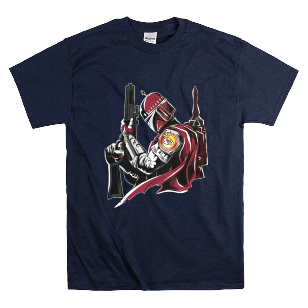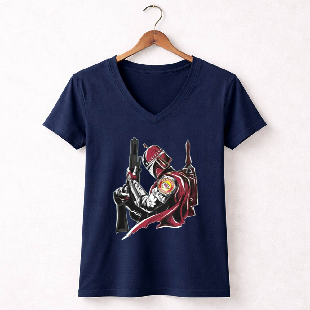 This design encapsulates the excitement of game day and the allure of sci-fi, merging the iconic Kansas City Chiefs logo with the Mandalorian’s fierce weaponry. It celebrates the unique bond between sports enthusiasts and Star Wars fans, inviting wearers to honor their passions in a bold, artistic way.