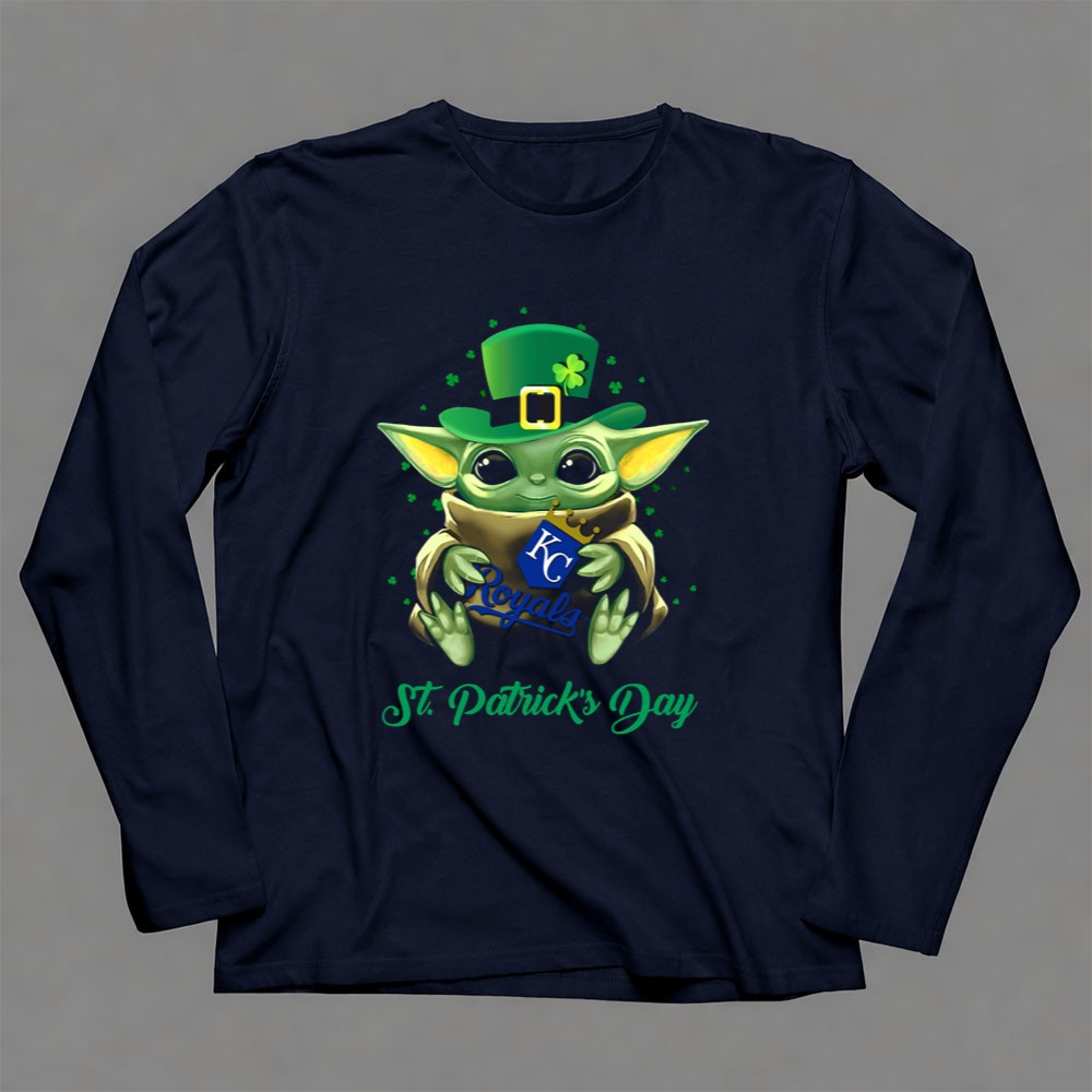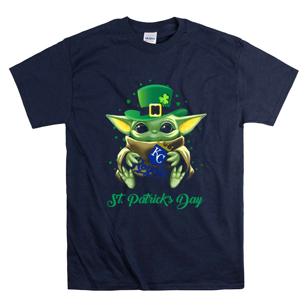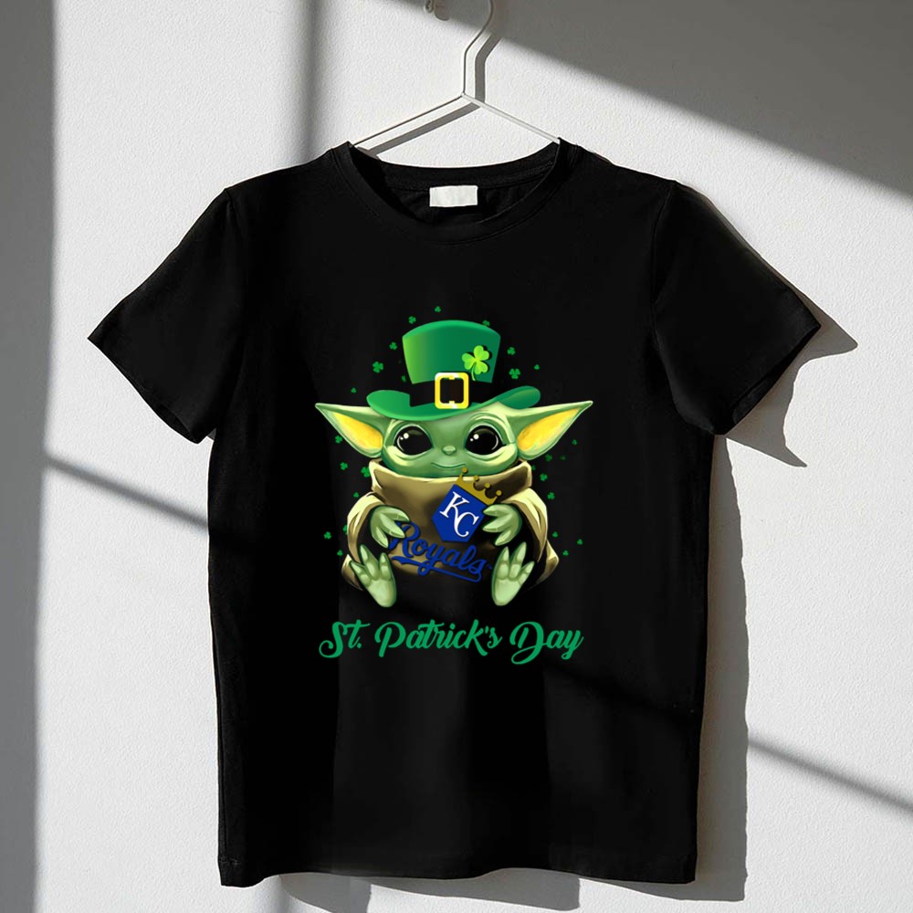 Kansas City Royals, St. Patrick's Day apparel, Baby Yoda fan gear, MLB team pride, festive sports t-shirt, Kansas City culture, playful sports merchandise, youth-friendly designs
