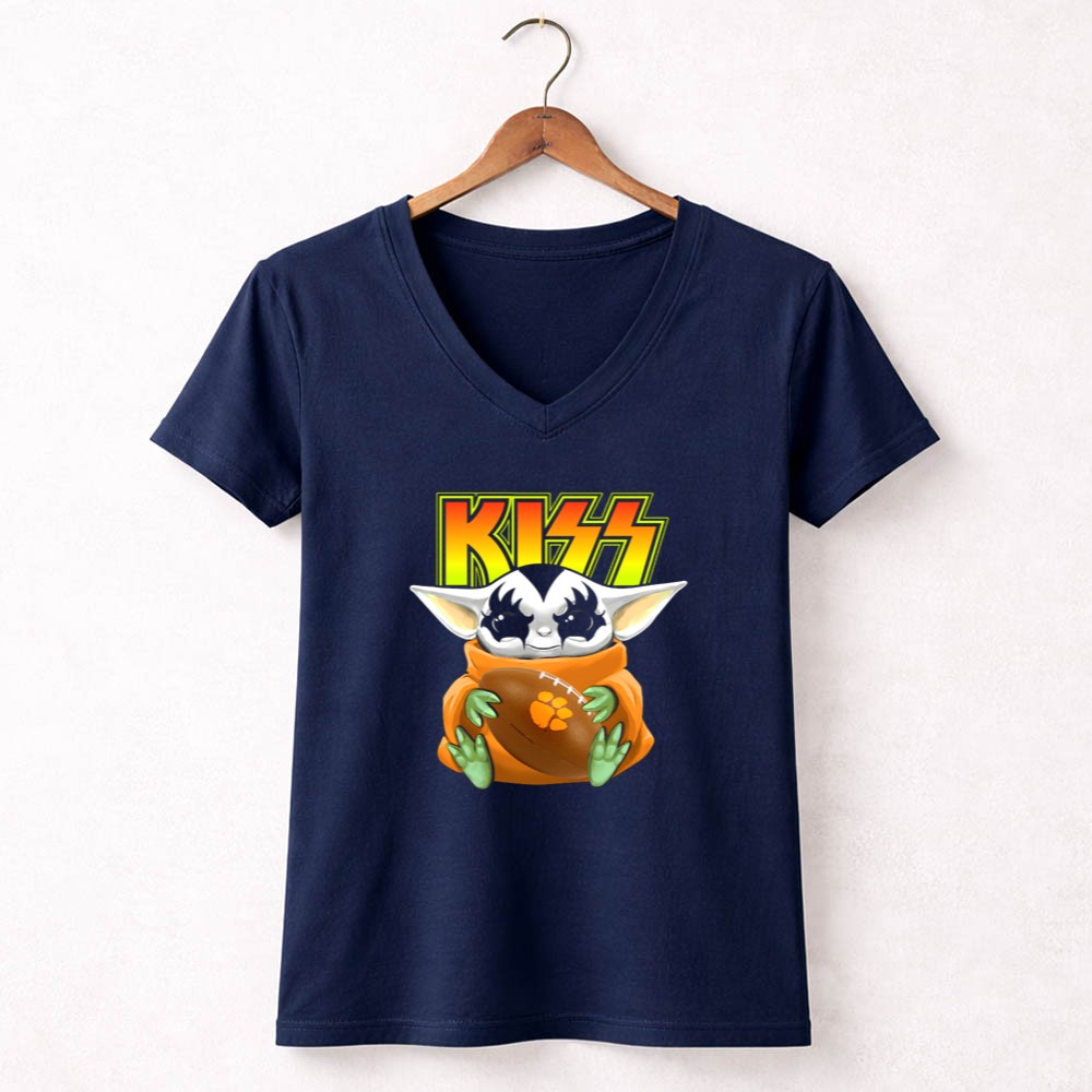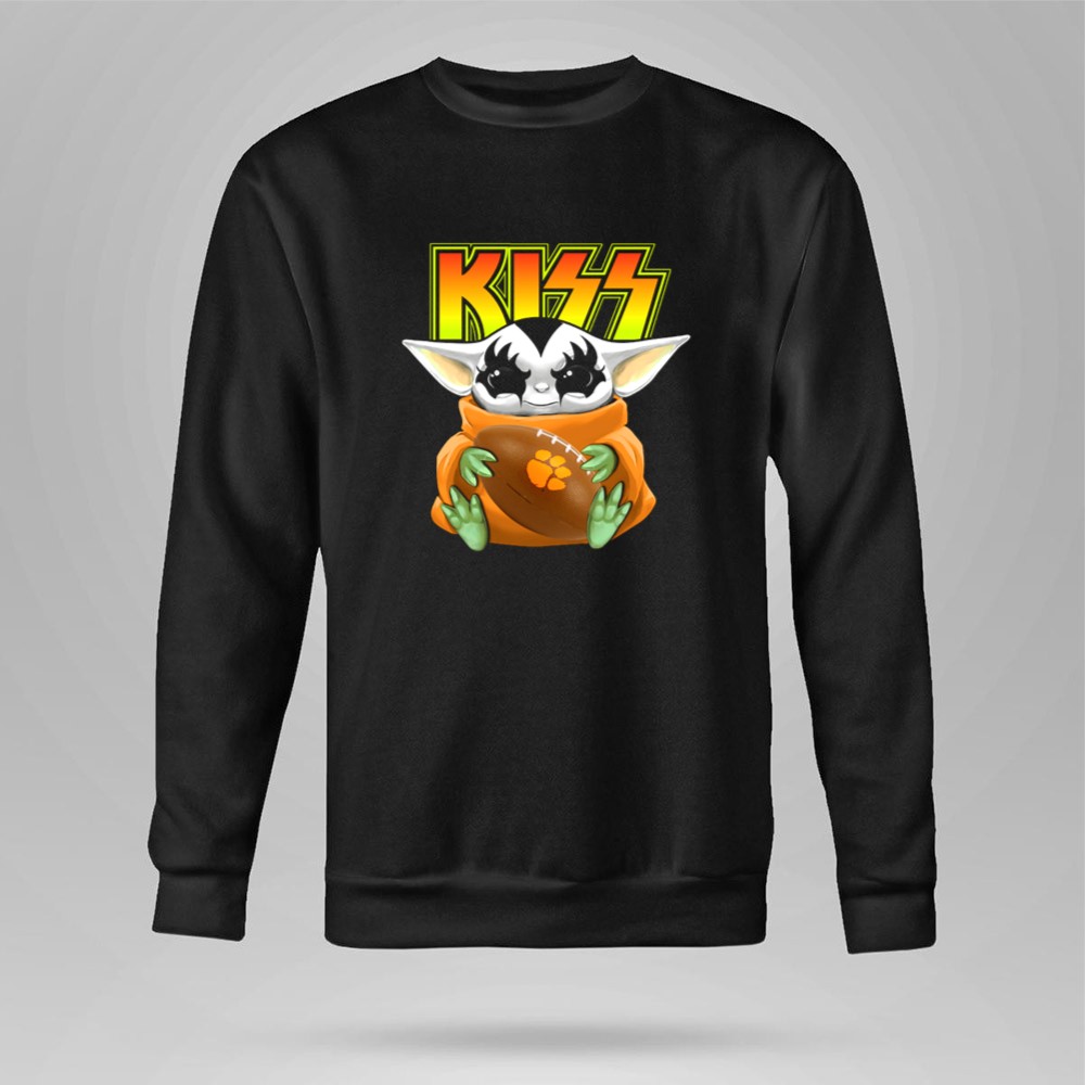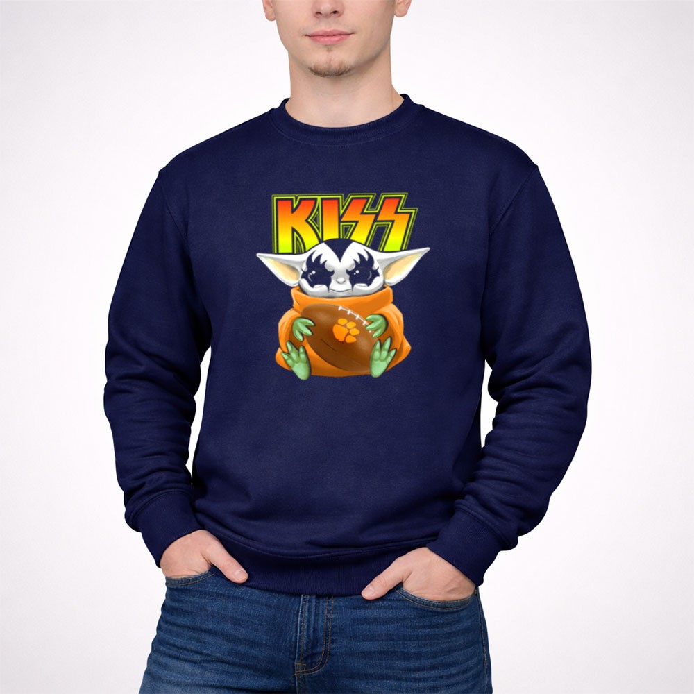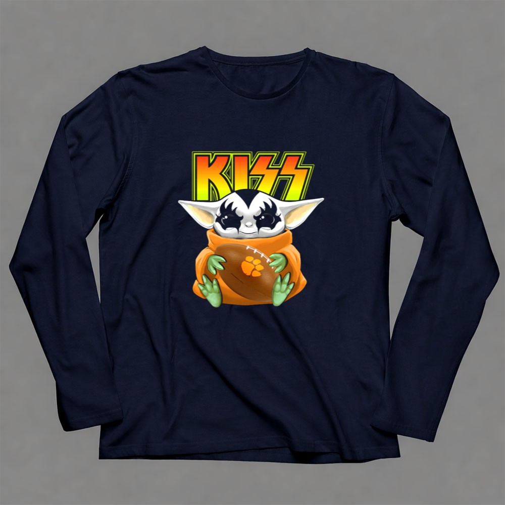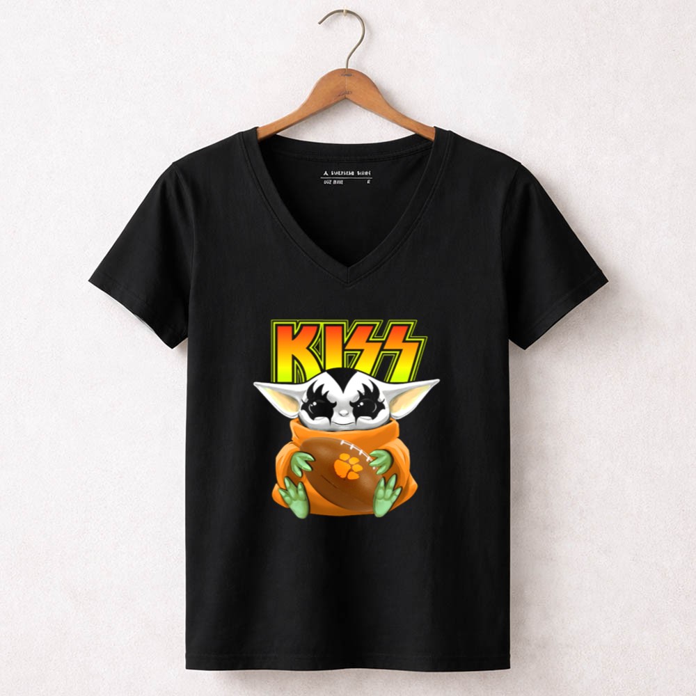 Clemson Tigers pride, KISS band fan apparel, Baby Yoda merchandise, college football gear, pop culture sports fusion, game day shirt, premium cotton t-shirt, fun sports gift