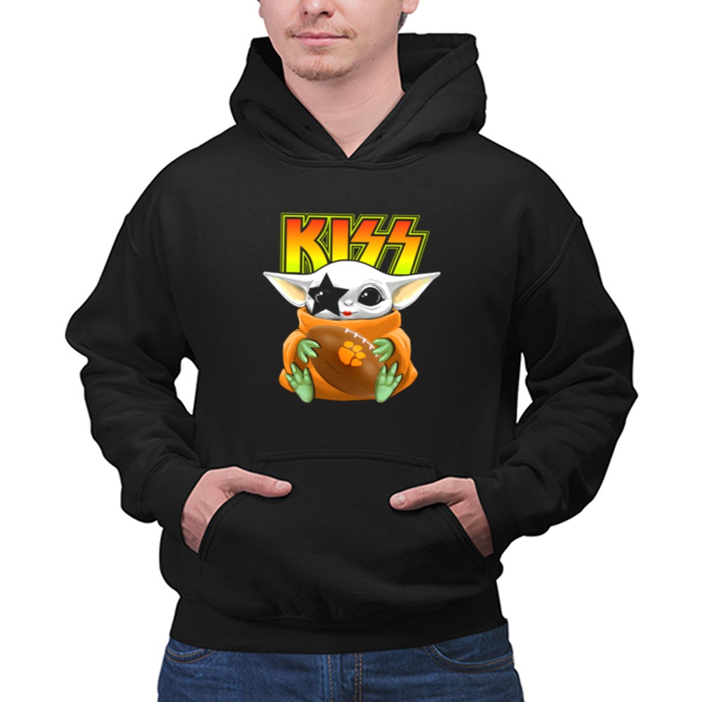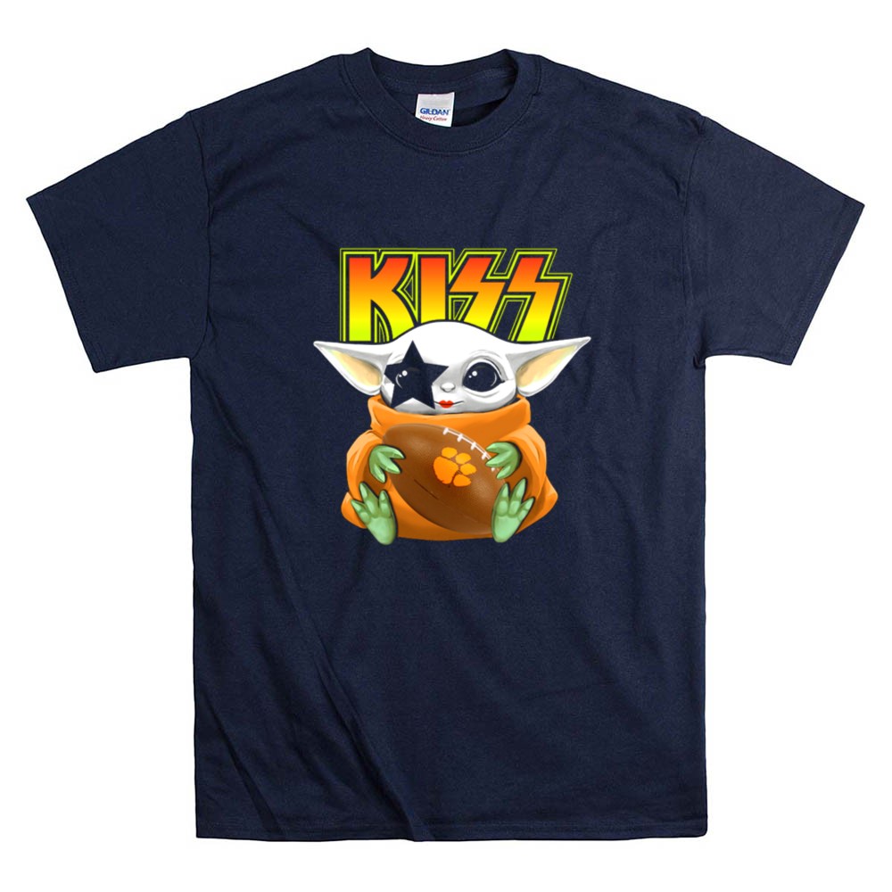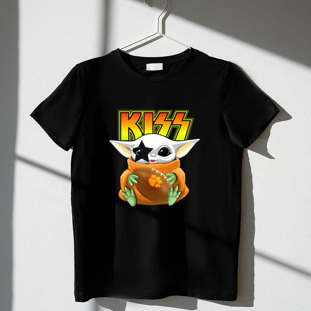 Clemson Tigers pride, Baby Yoda football shirt, KISS band merchandise, college football apparel, pop culture mashup, Star Wars fan gear, tailgating essentials, premium quality t-shirt