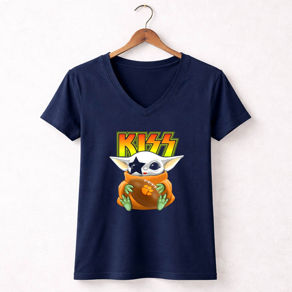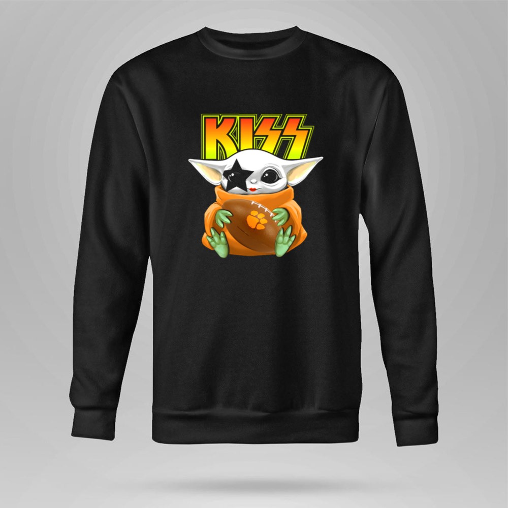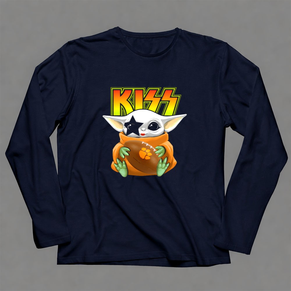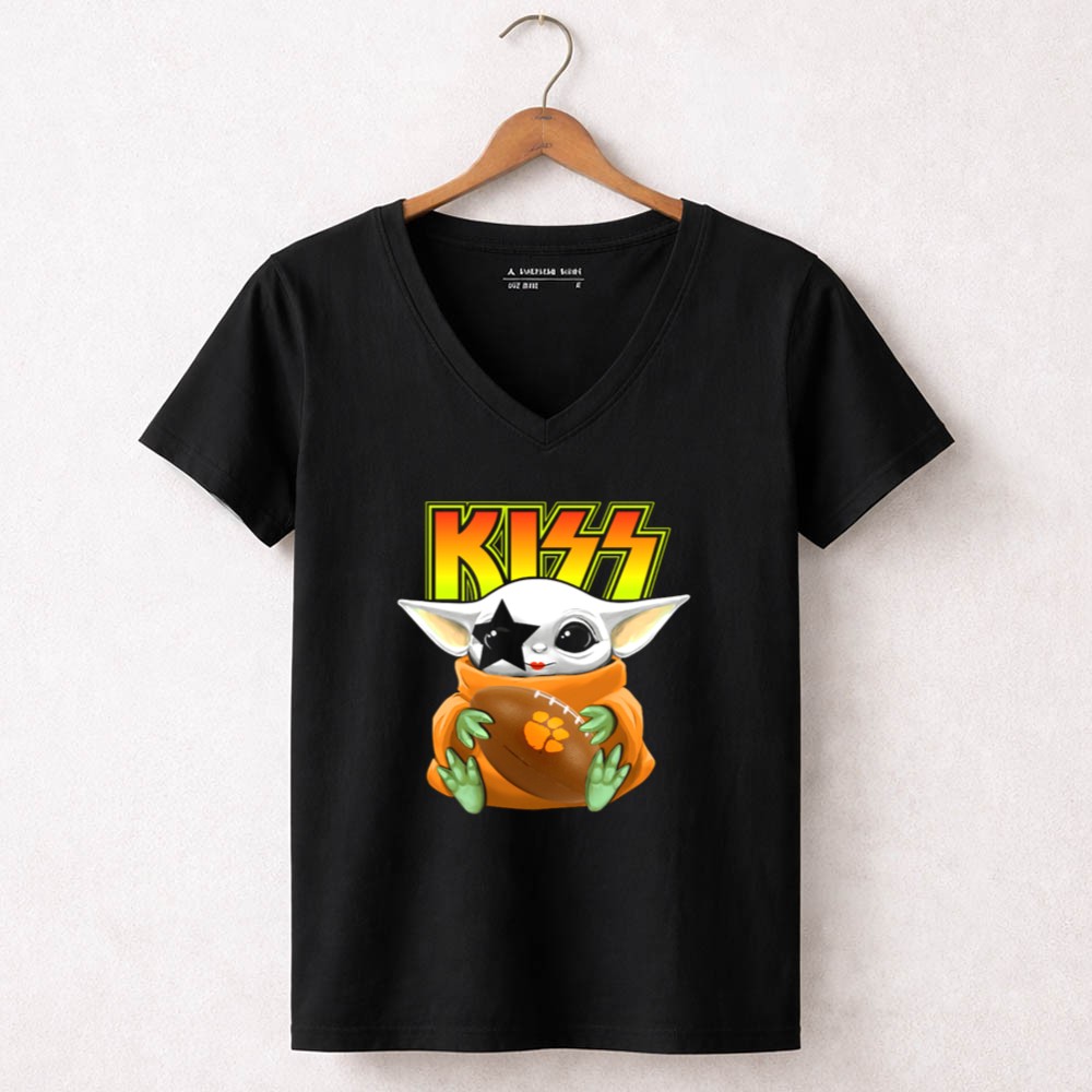 Clemson Tigers pride, Baby Yoda football shirt, KISS band merchandise, college football apparel, pop culture mashup, Star Wars fan gear, tailgating essentials, premium quality t-shirt