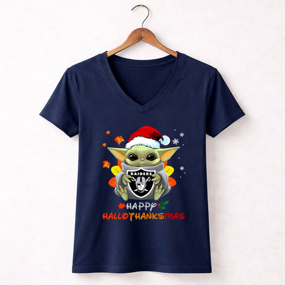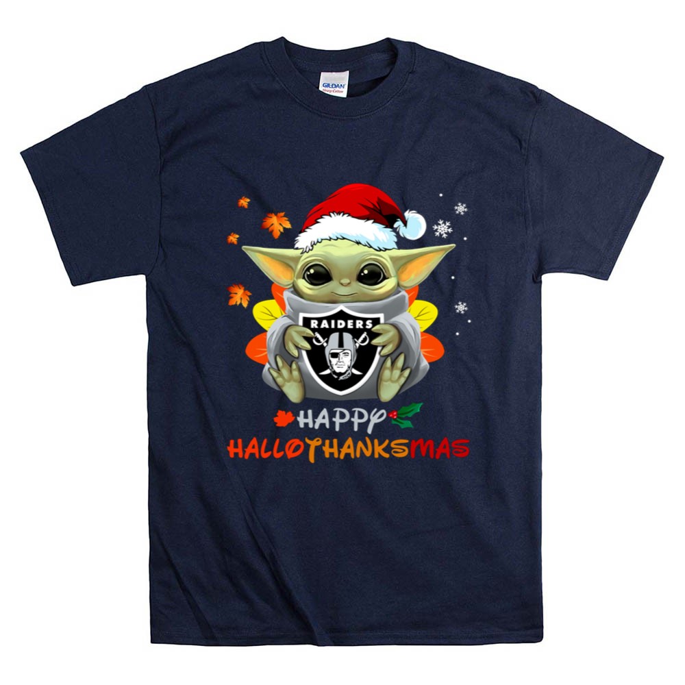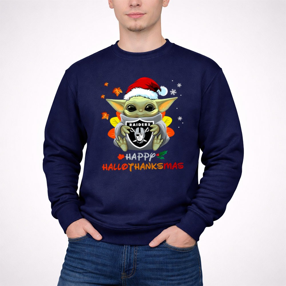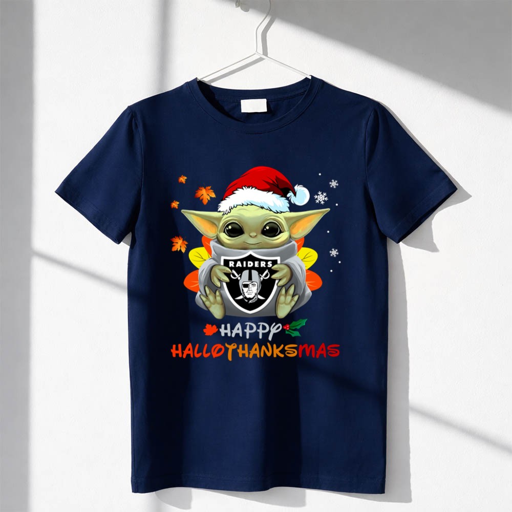 Las Vegas Raiders holiday apparel, Baby Yoda Christmas shirt, NFL fan t-shirt, festive game day wear, Star Wars Raiders mashup, holiday cheer for football fans, unique sports gifts, playful Thanksgiving Christmas blend