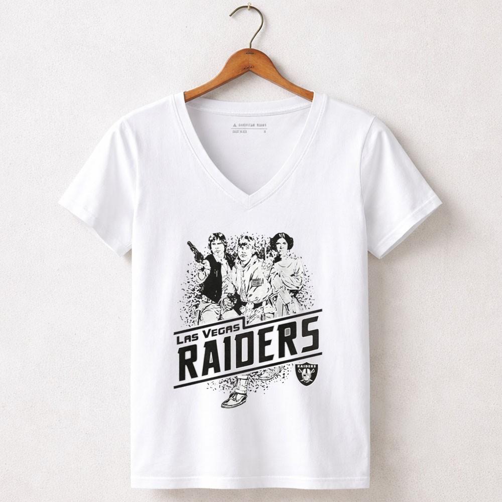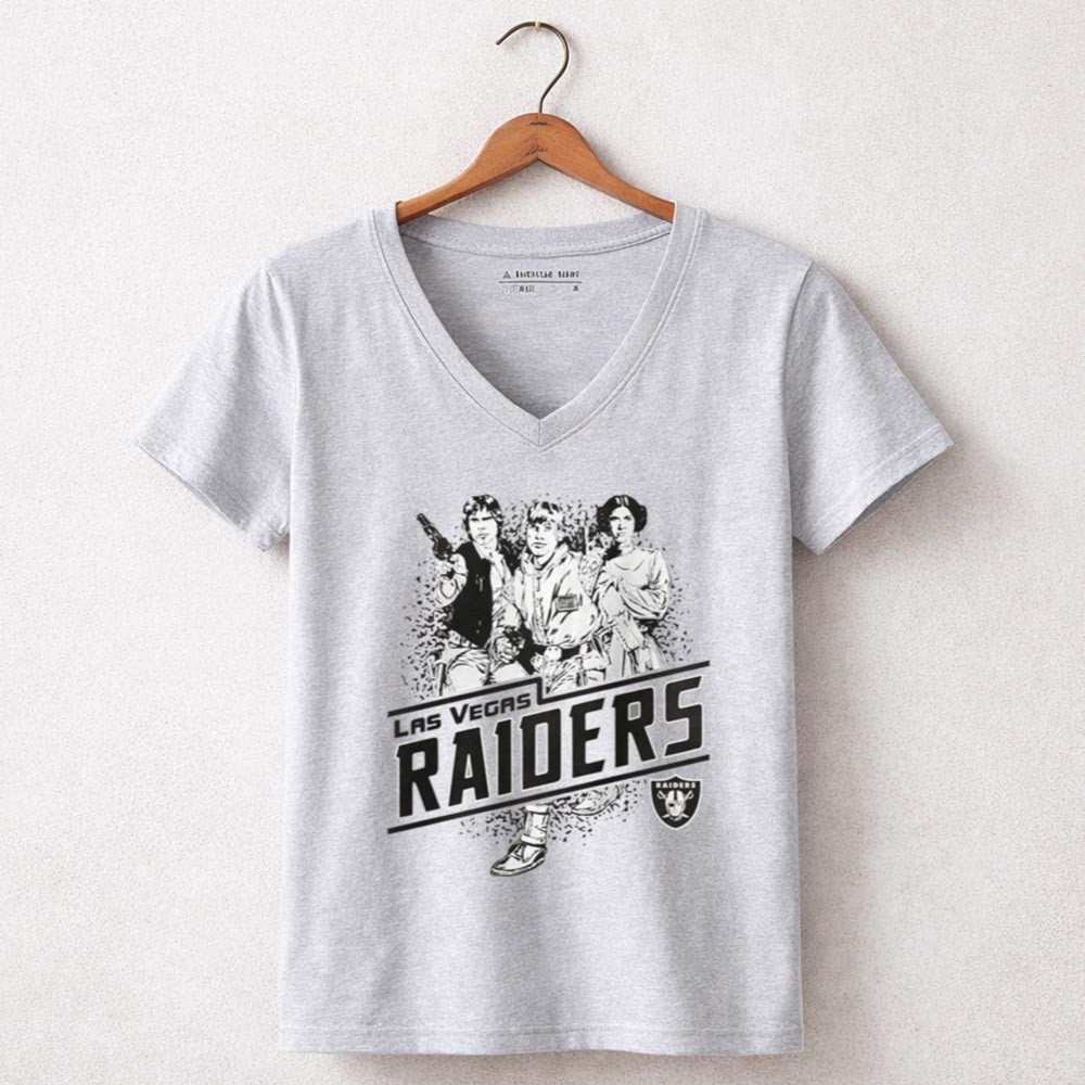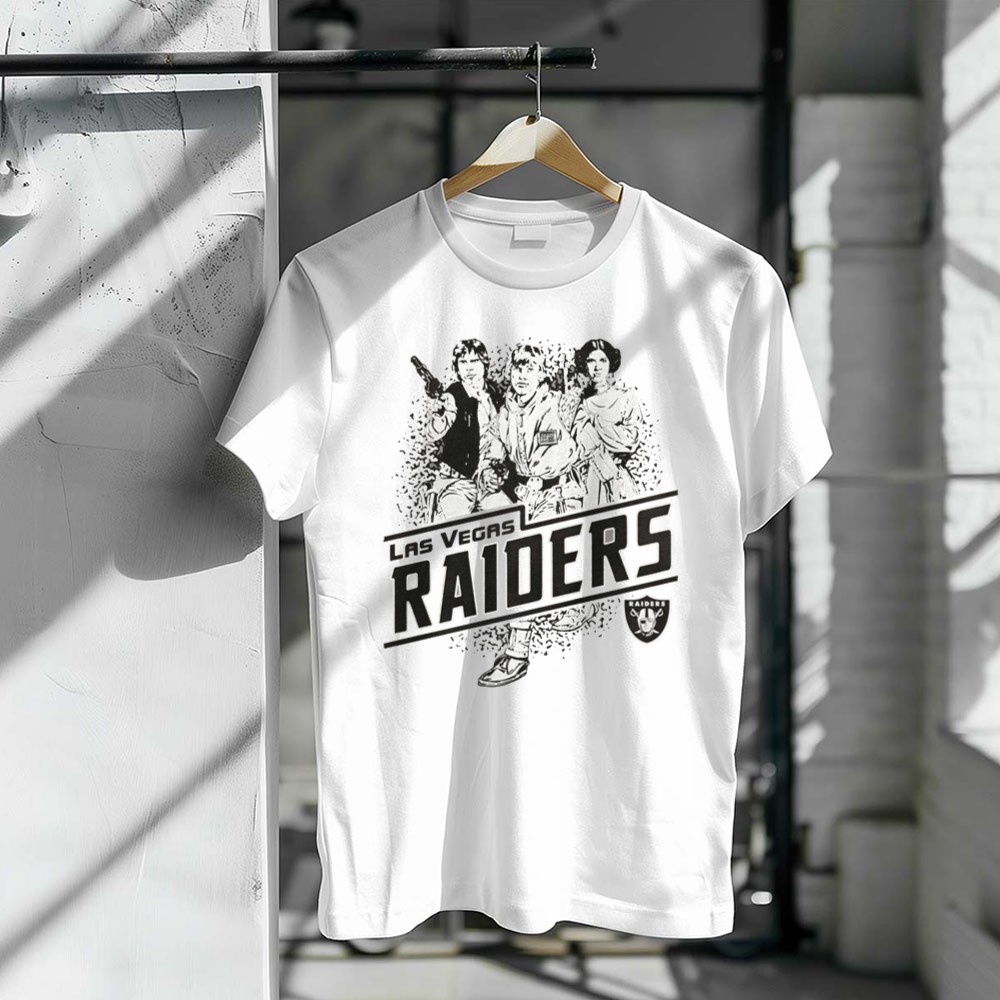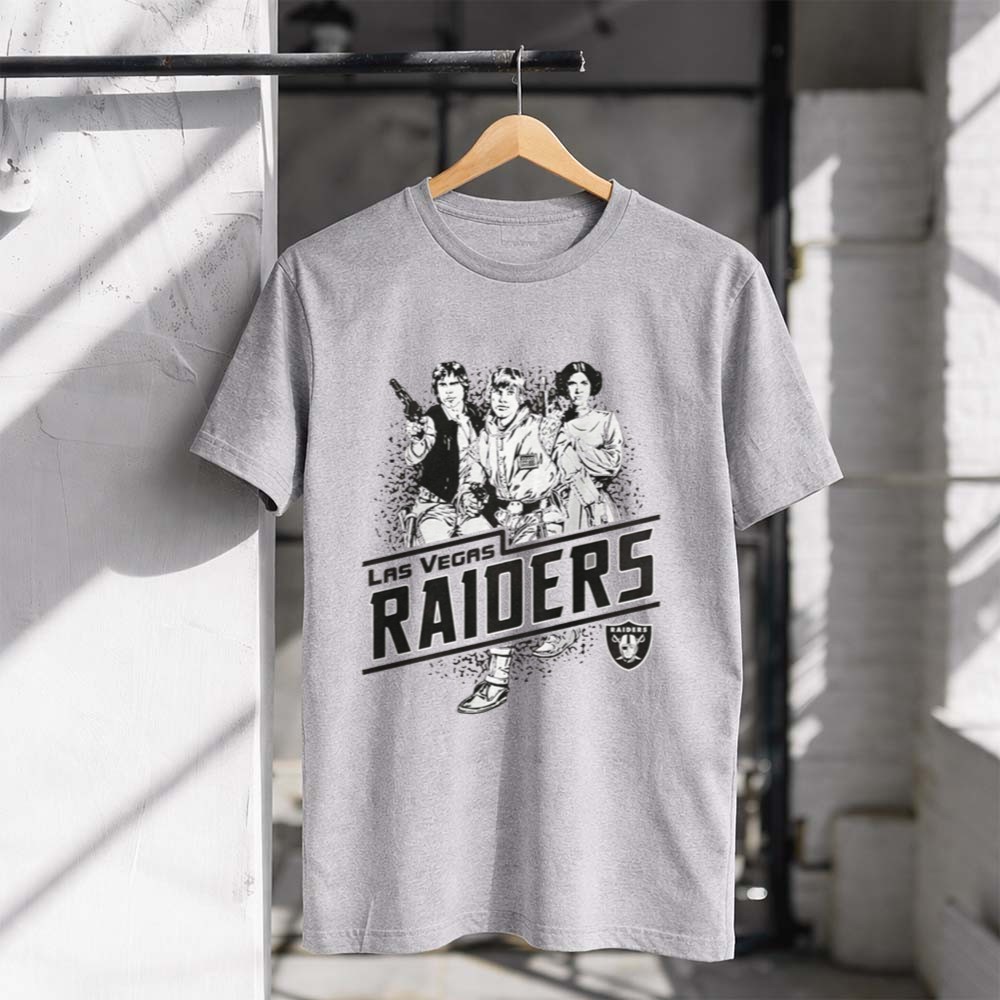 Raiders pride, Las Vegas sports apparel, Star Wars fan gear, iconic characters, game day t-shirt, vintage style, fandom crossover, premium cotton tee