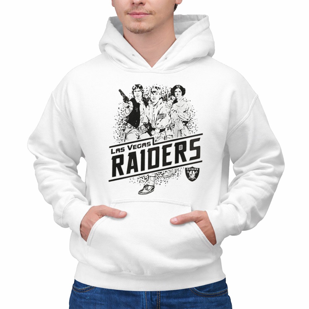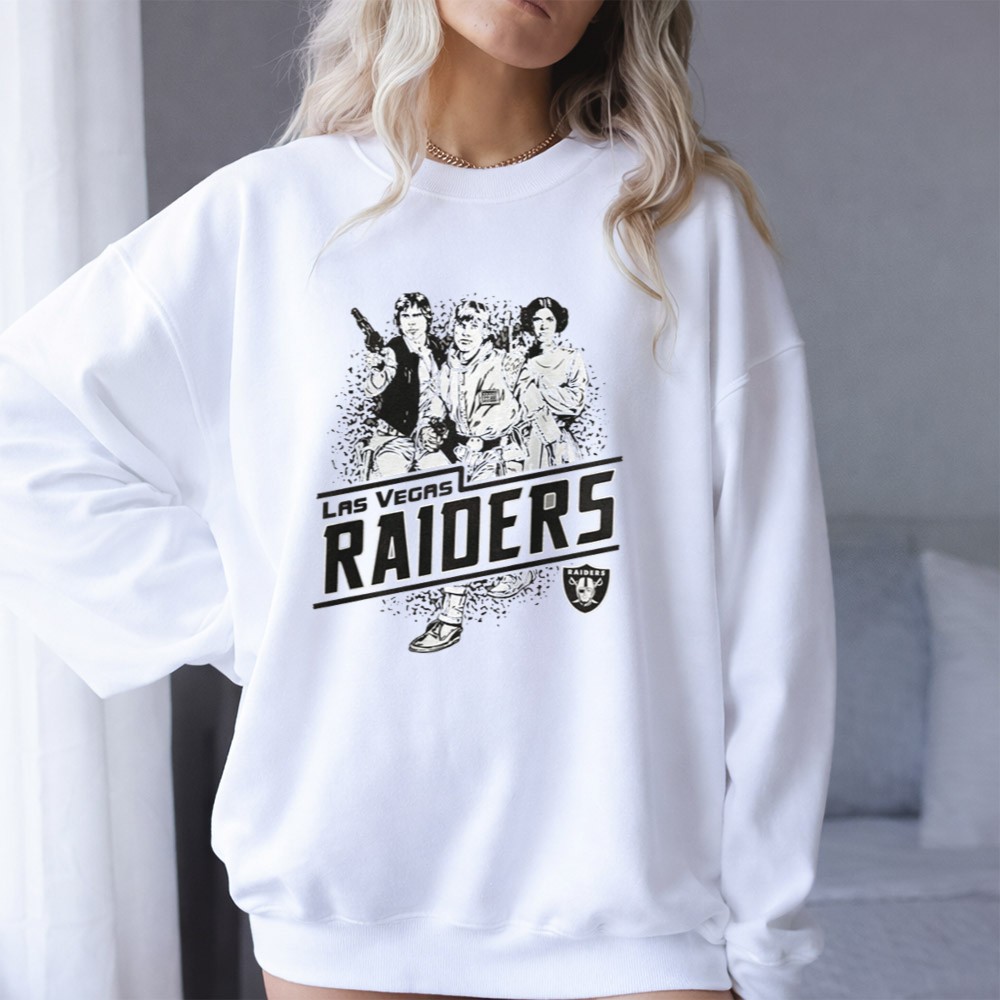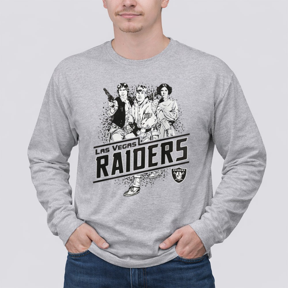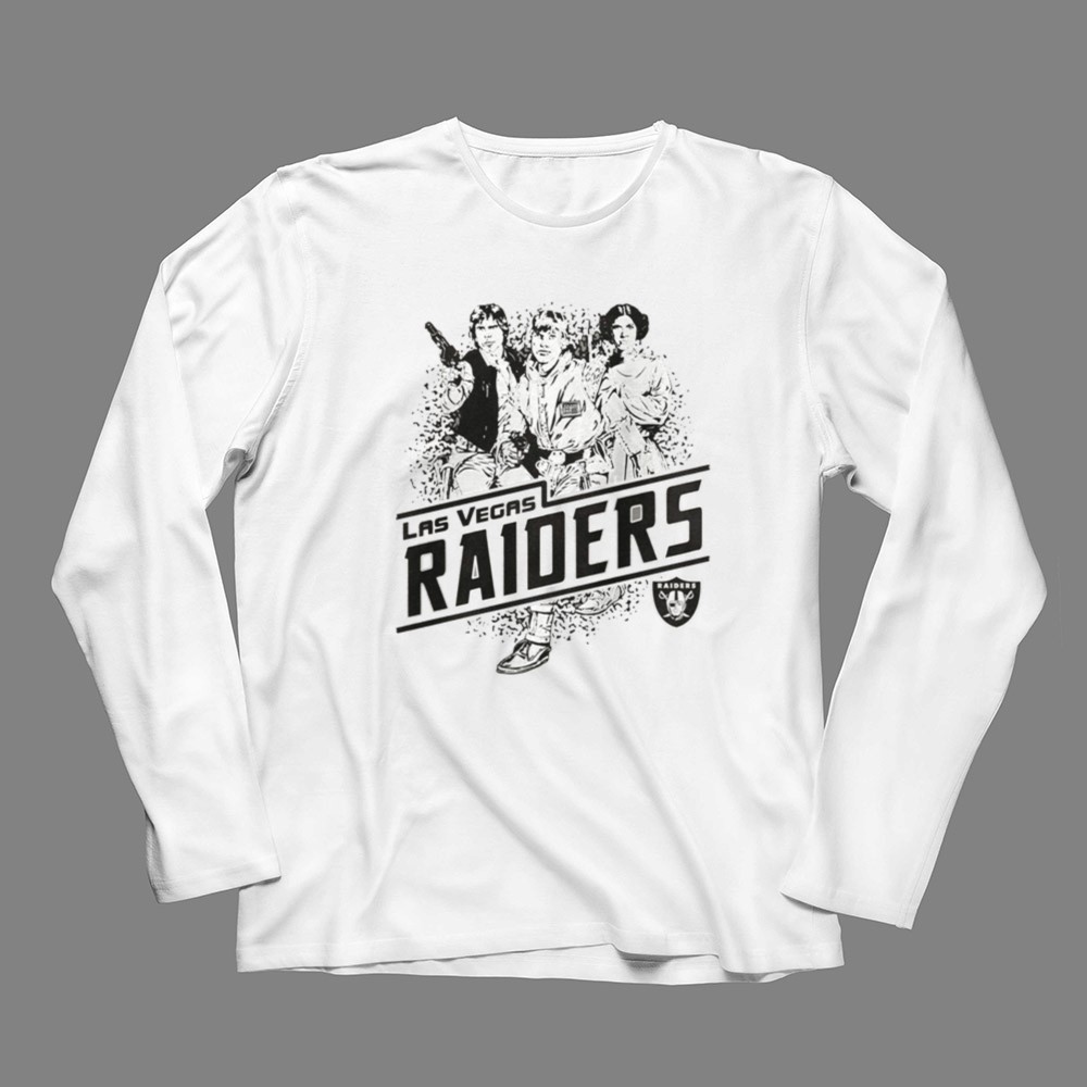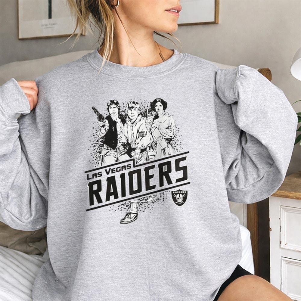 Raiders pride, Las Vegas sports apparel, Star Wars fan gear, iconic characters, game day t-shirt, vintage style, fandom crossover, premium cotton tee