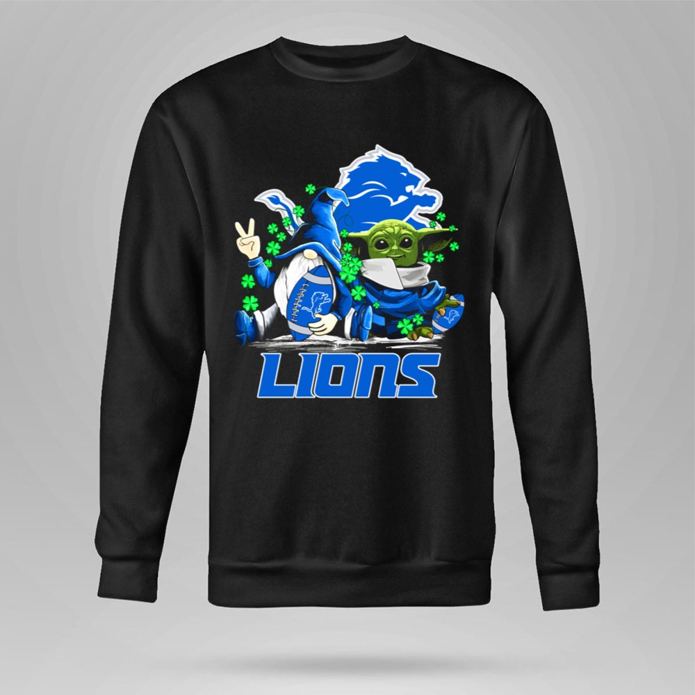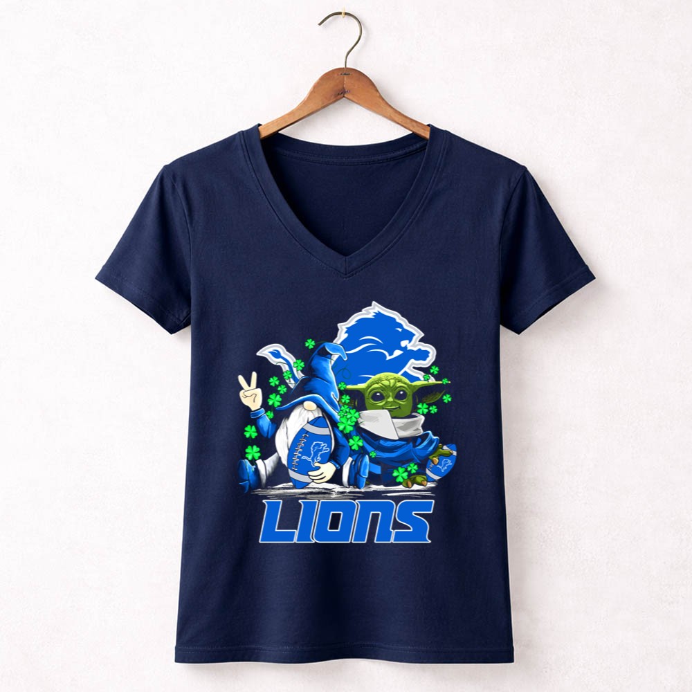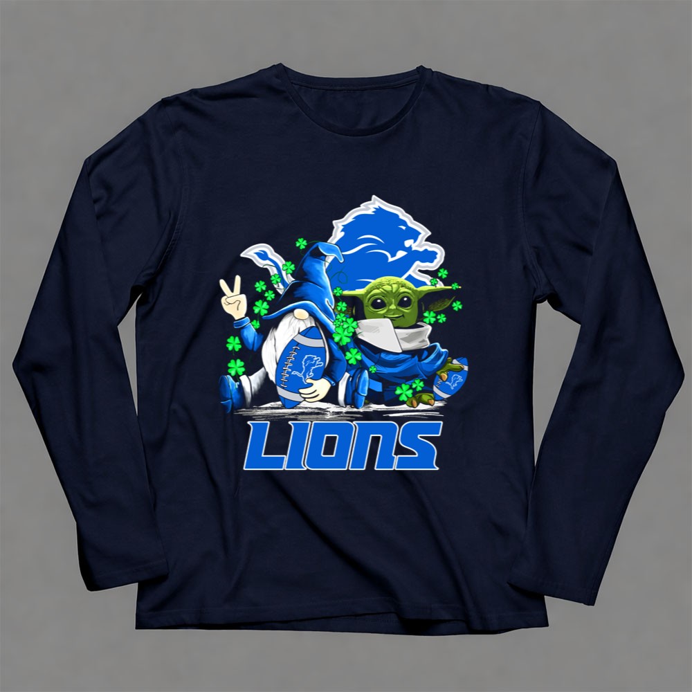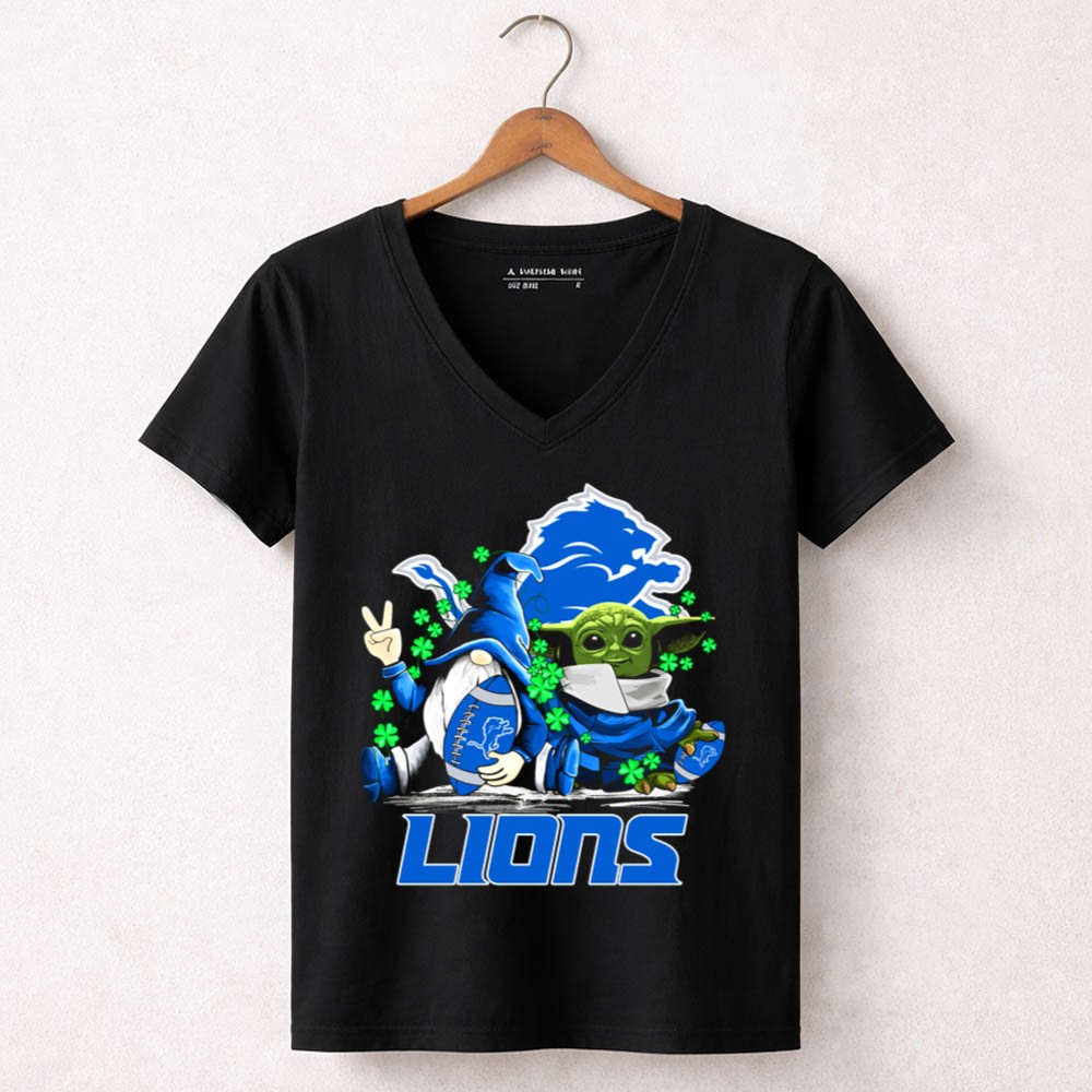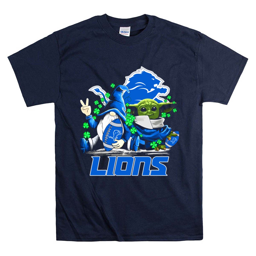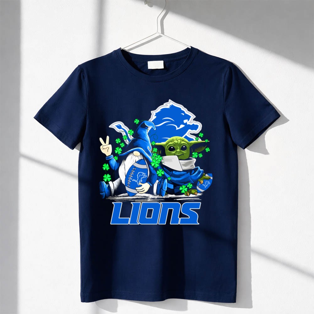Detroit Lions apparel, St. Patrick's Day t-shirt, Baby Yoda merchandise, NFL fan gear, gnome football fans, Clover-themed sports shirt, game day apparel, Detroit sports pride