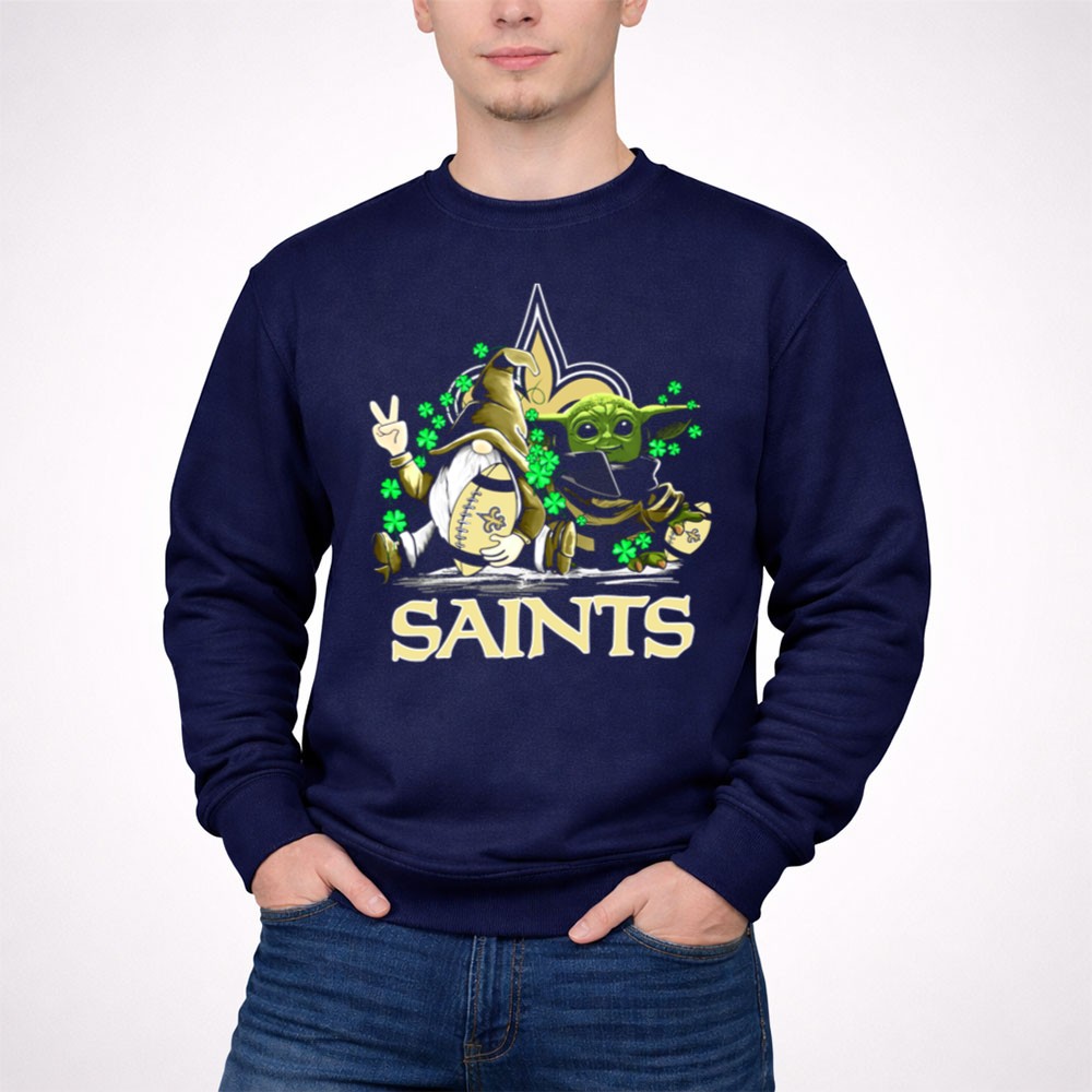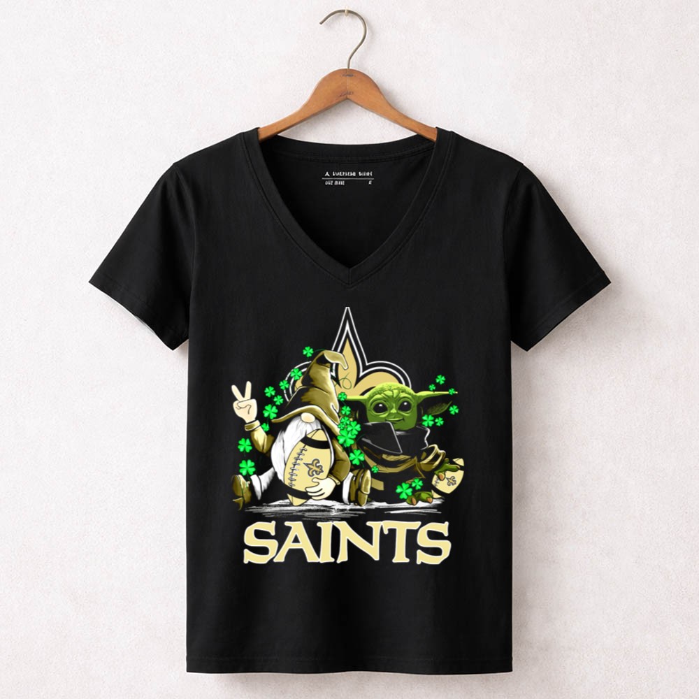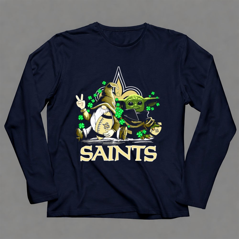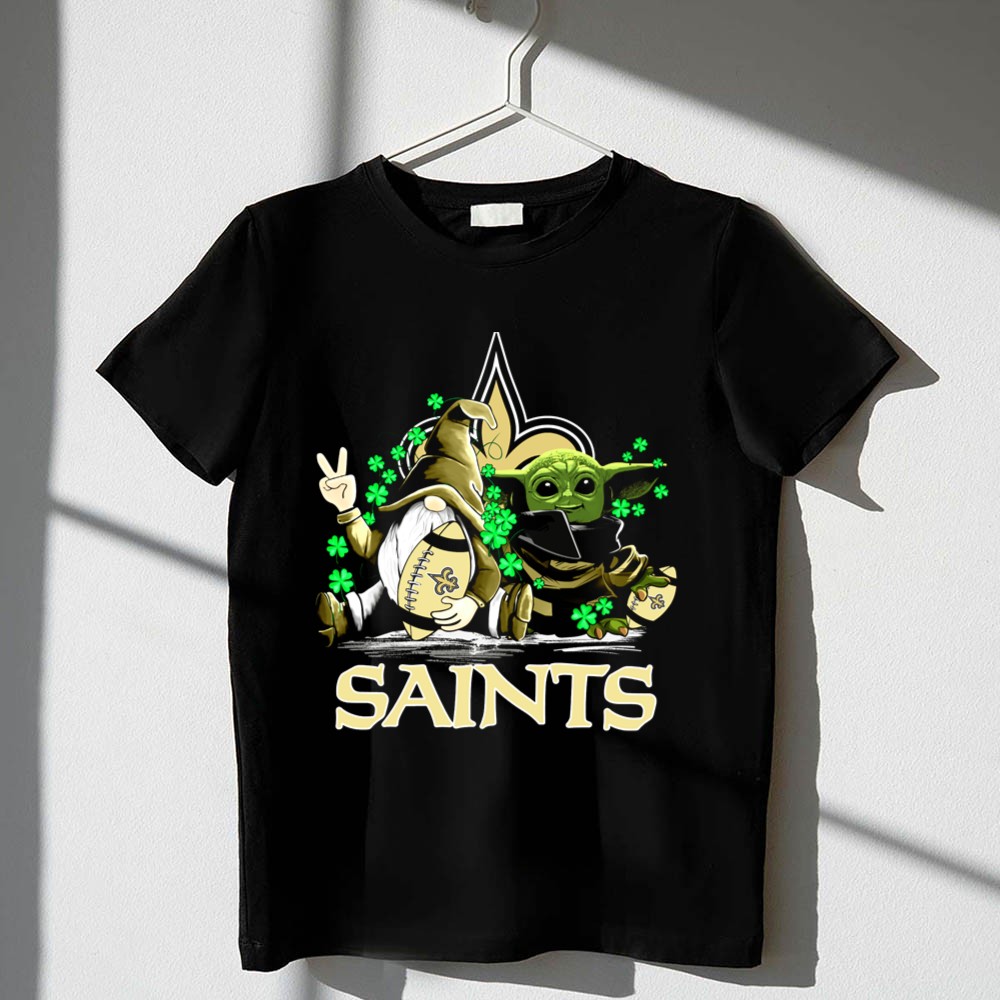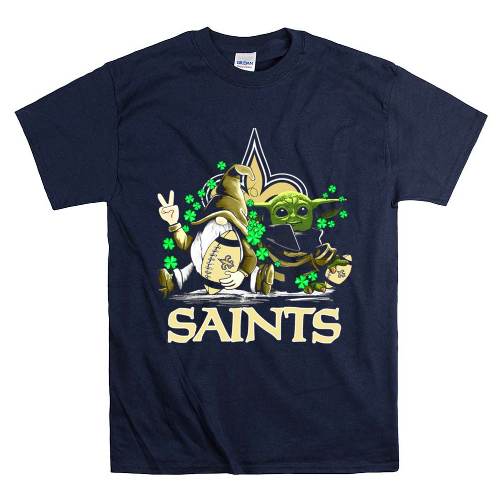 New Orleans Saints pride, St. Patrick's Day celebration, football gnomes, Baby Yoda fan apparel, NFL gnome design, game day humor, festive sports shirt, shamrock-themed merchandise
