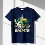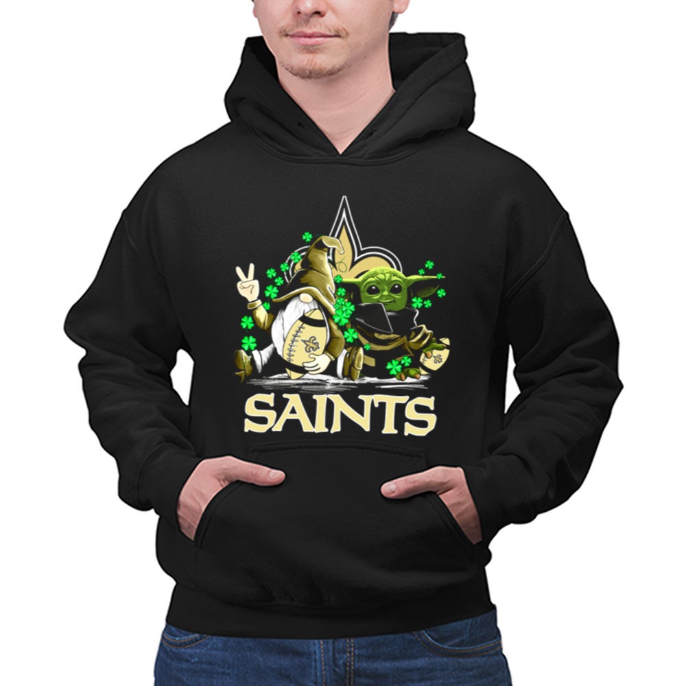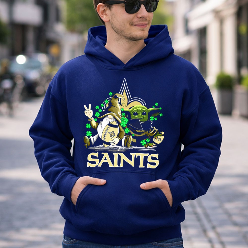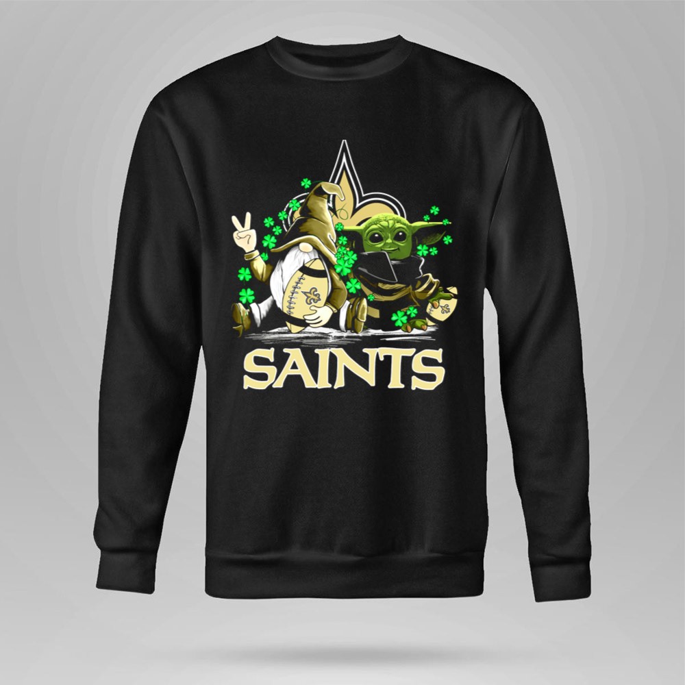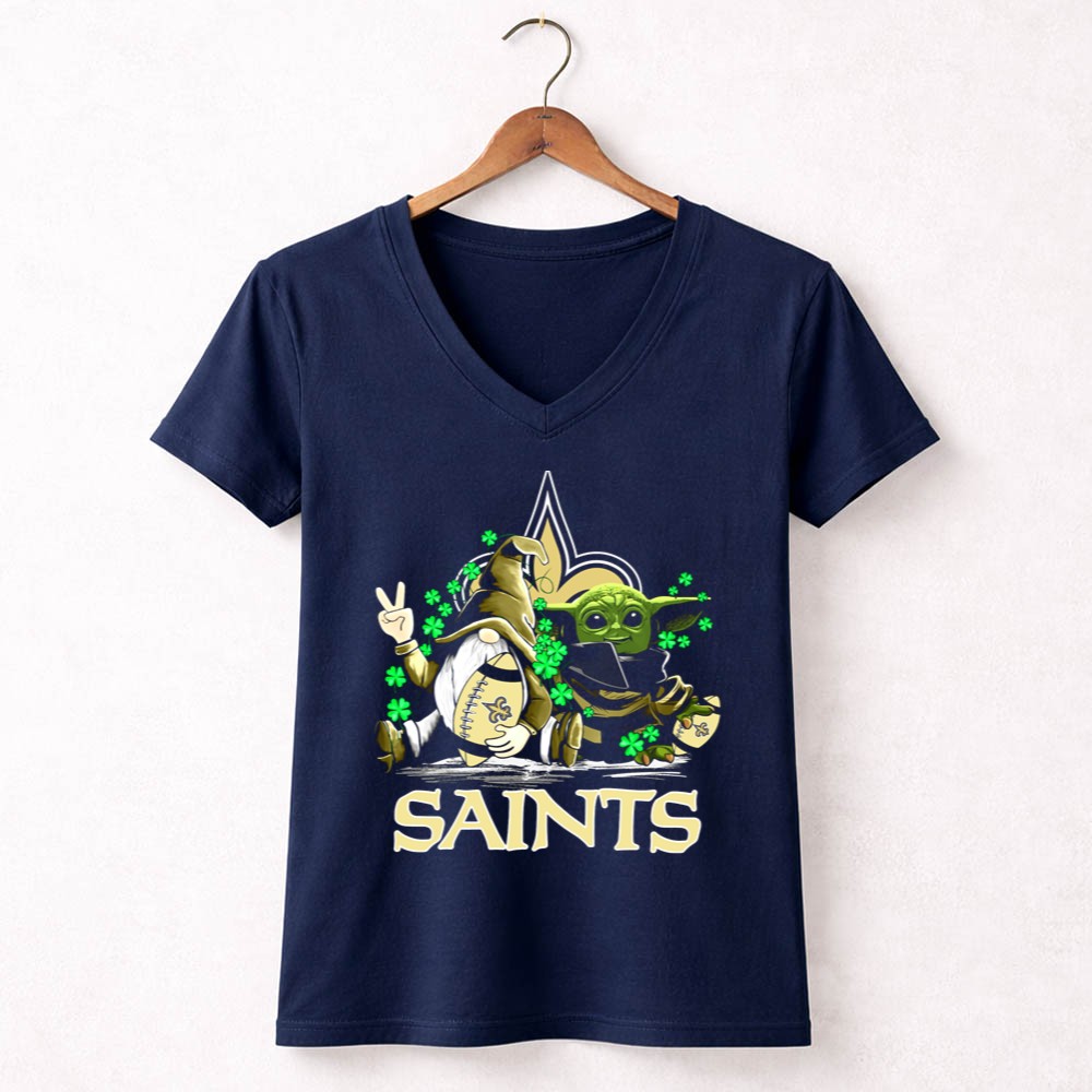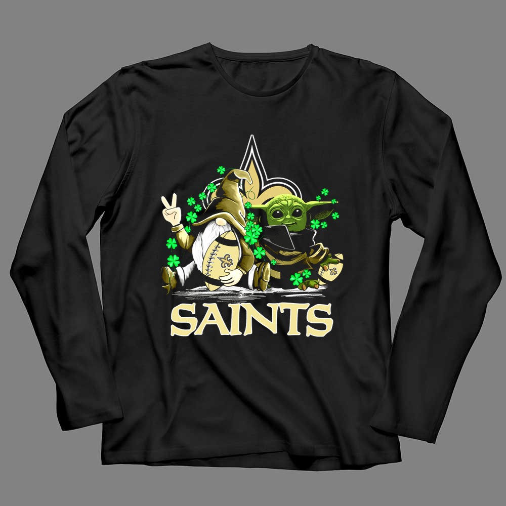 New Orleans Saints pride, St. Patrick's Day celebration, football gnomes, Baby Yoda fan apparel, NFL gnome design, game day humor, festive sports shirt, shamrock-themed merchandise