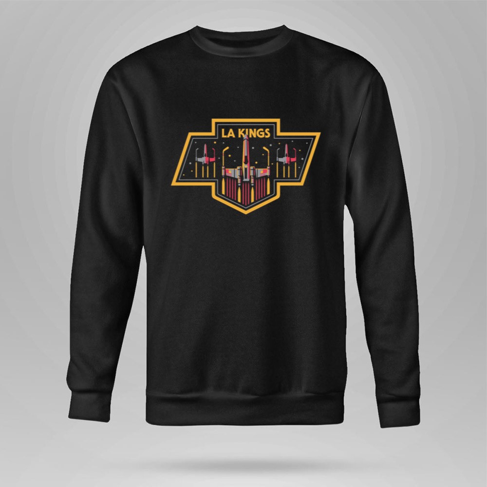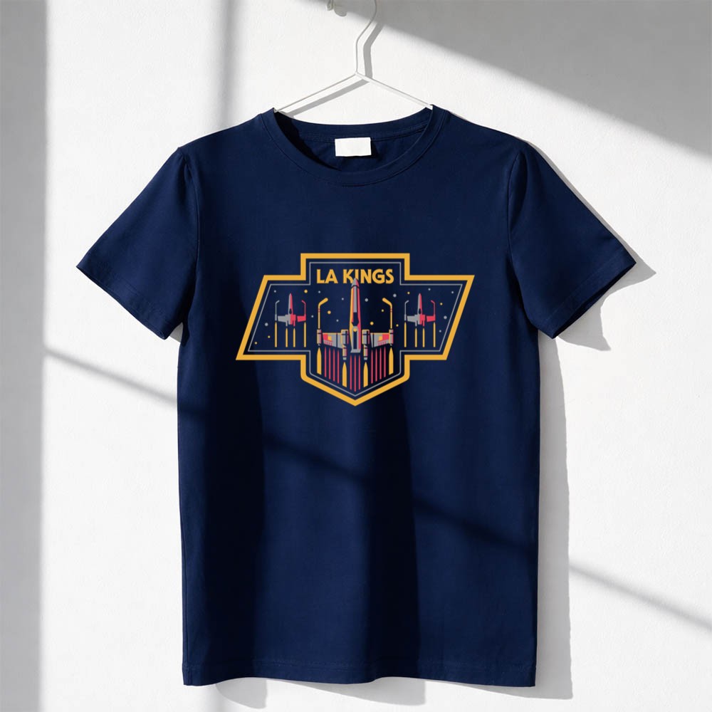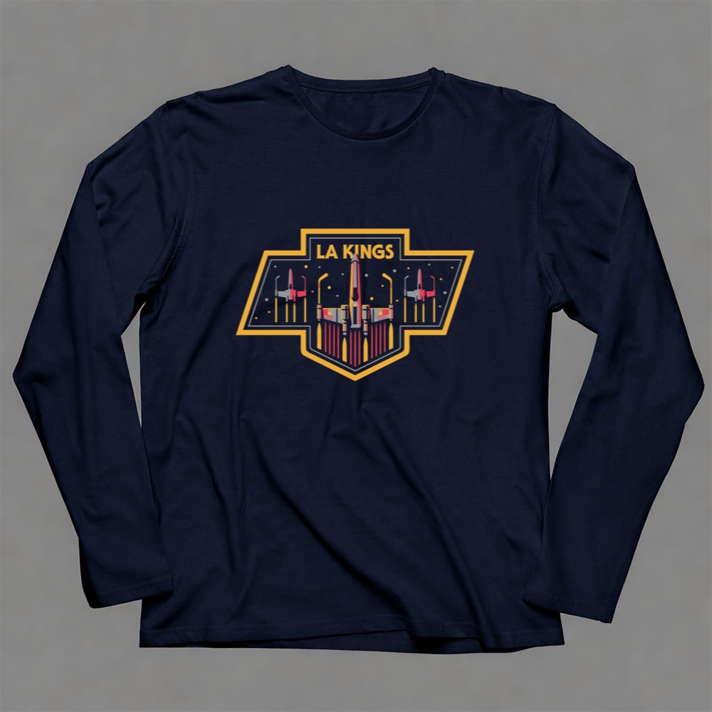 This design embodies the dynamic spirit of Los Angeles, where hockey pride meets the thrill of the Star Wars universe. Featuring the iconic LA KINGS logo alongside Rebel X-Wing fighter jets, it captures the essence of urban streetwear while celebrating fandom. It’s a heartfelt tribute for those who honor their city and its legendary teams.