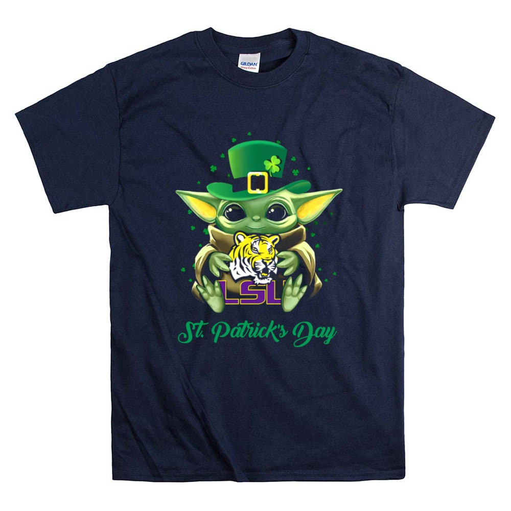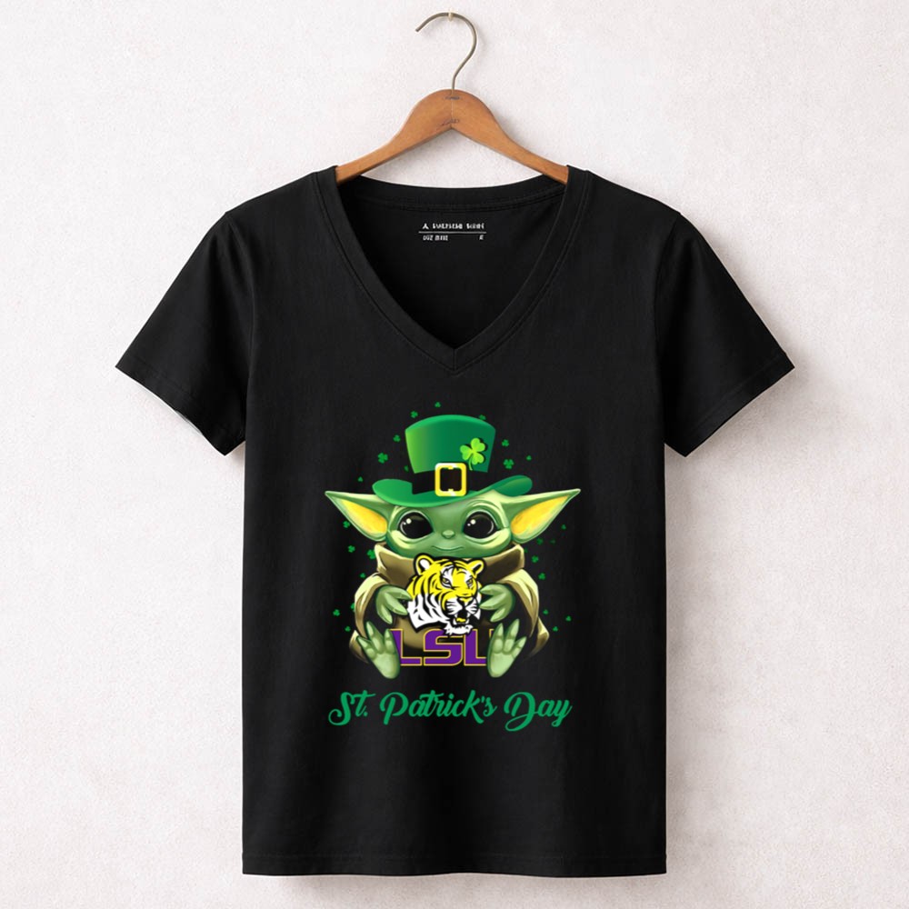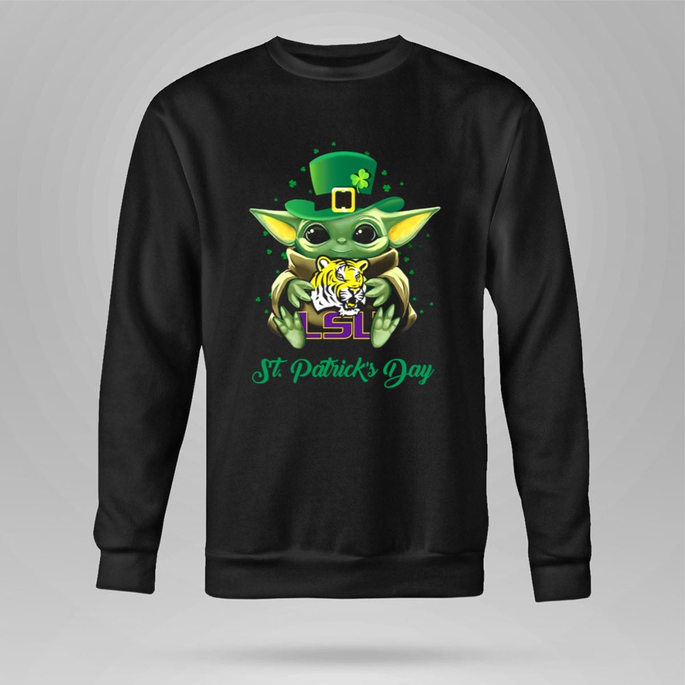 LSU Tigers, Baby Yoda, St. Patrick's Day apparel, Louisiana sports pride, festive green t-shirt, college football fans, pop culture crossover, gift for LSU fans