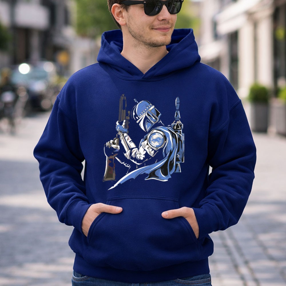 Embrace your fandom with a bold mashup of Detroit Lions spirit and Mandalorian flair.