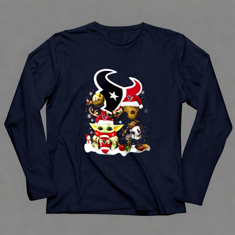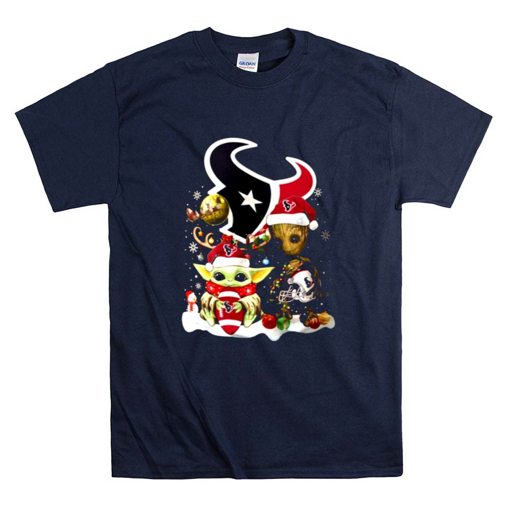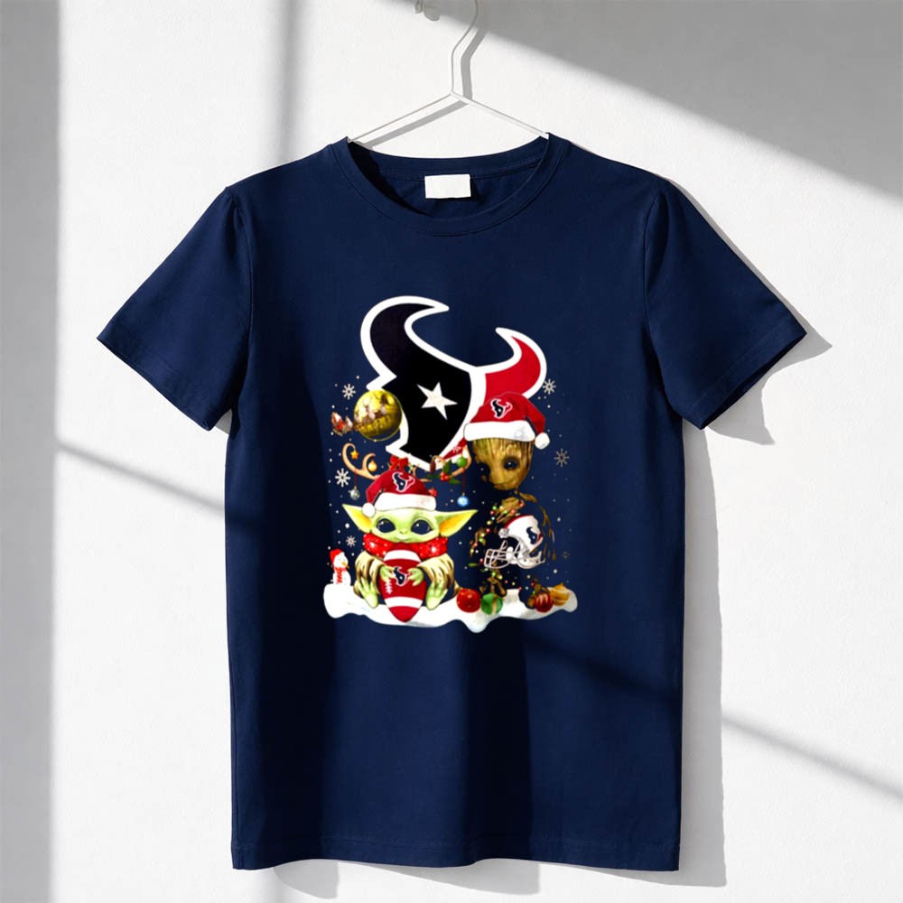 Houston Texans Christmas apparel, Baby Yoda Christmas shirt, Groot holiday design, festive game day tee, holiday spirit for Texans fans, Star Wars mashup, NFL Christmas gift, playful fan gear