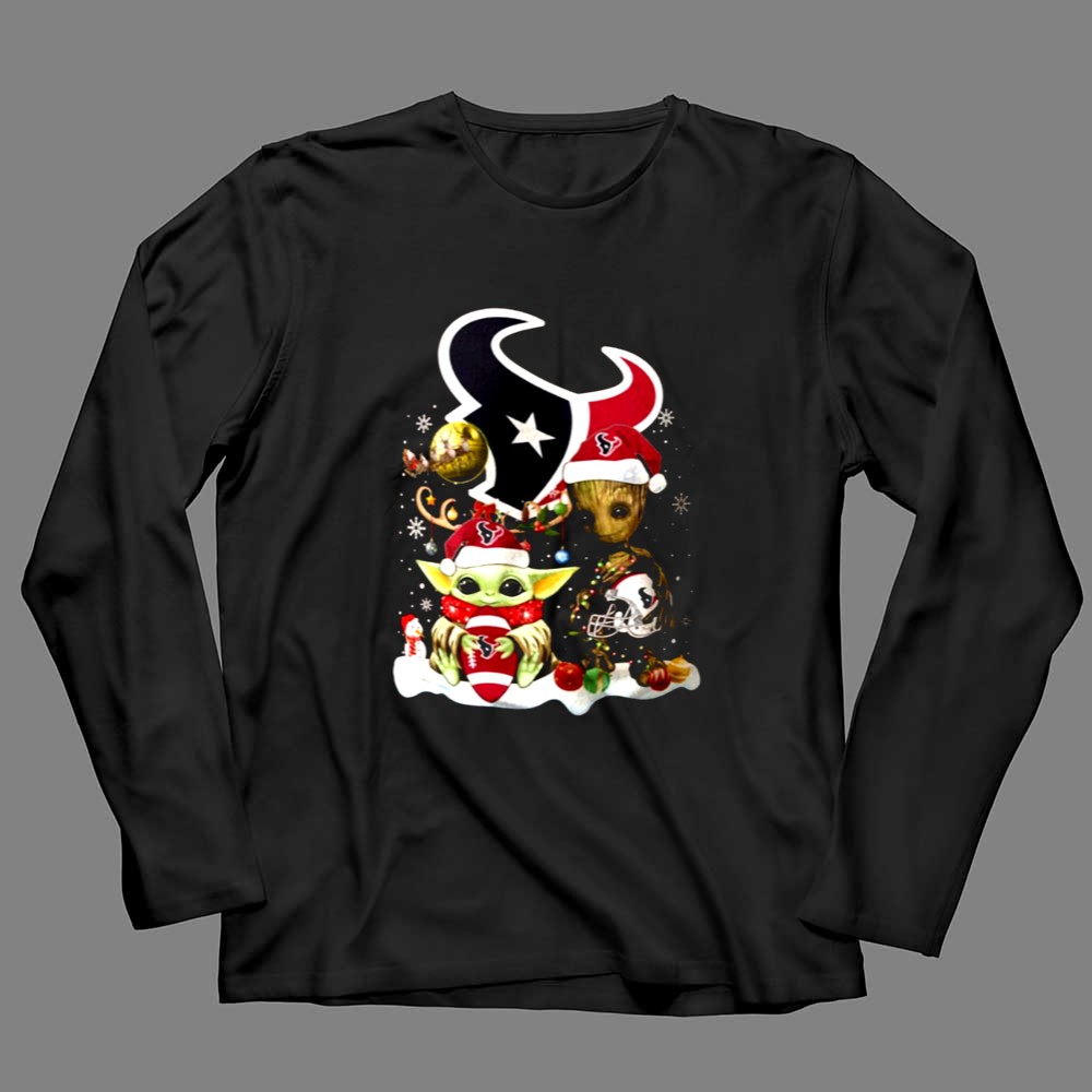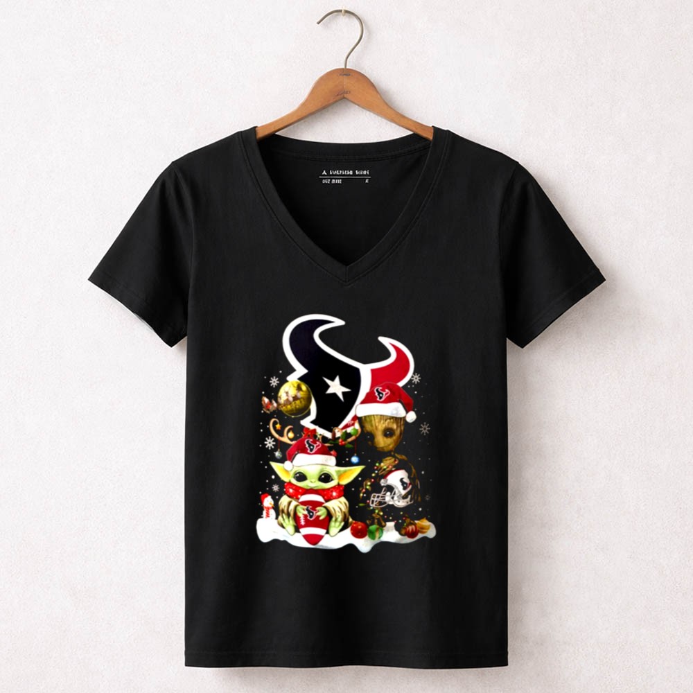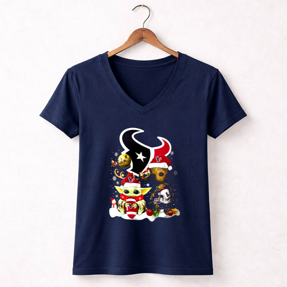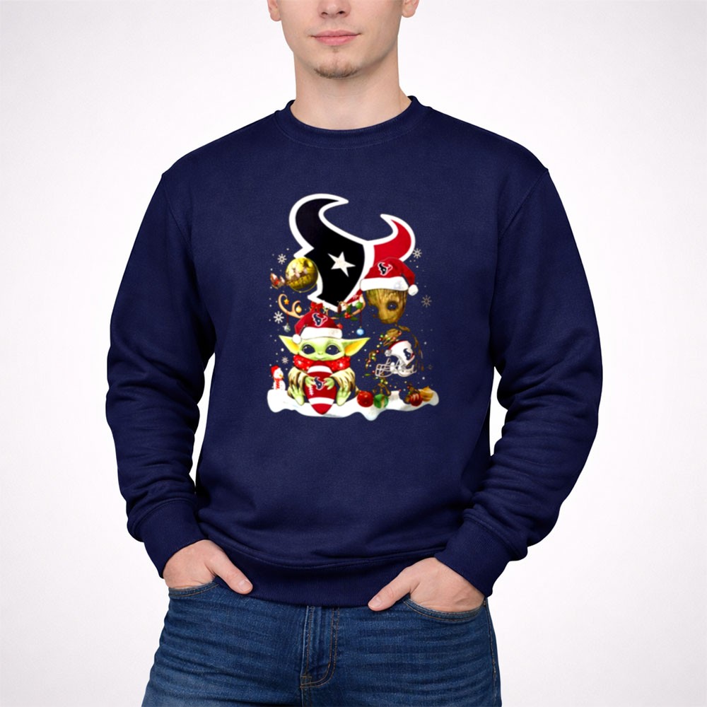 Houston Texans Christmas apparel, Baby Yoda Christmas shirt, Groot holiday design, festive game day tee, holiday spirit for Texans fans, Star Wars mashup, NFL Christmas gift, playful fan gear