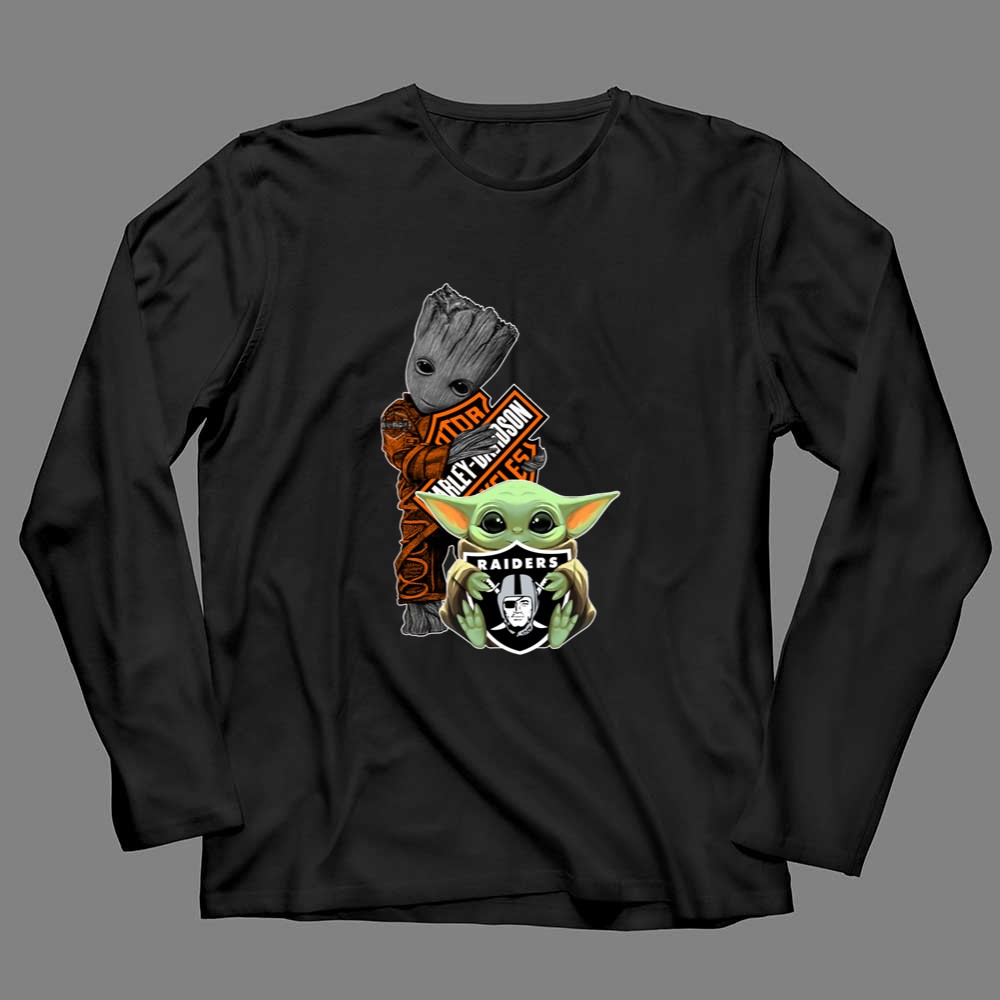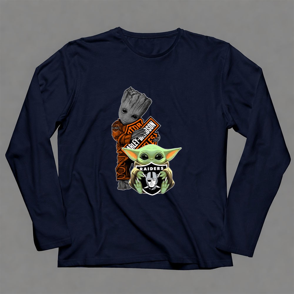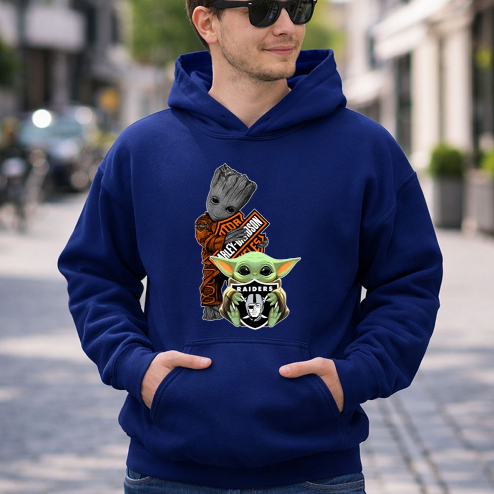 Oakland Raiders pride, Groot and Baby Yoda fans, NFL mashup apparel, pop culture t-shirt, Raiders fandom, playful sportswear, unique fan gear, premium lightweight tee