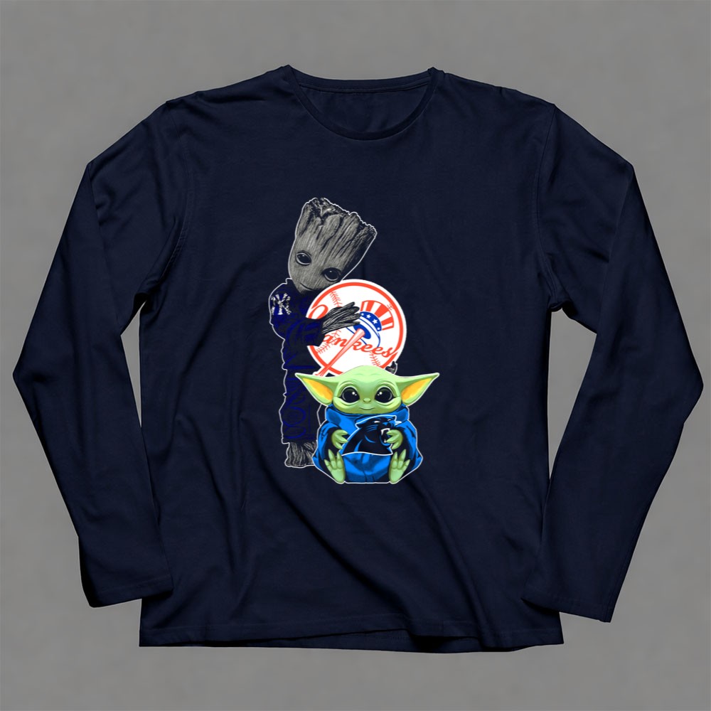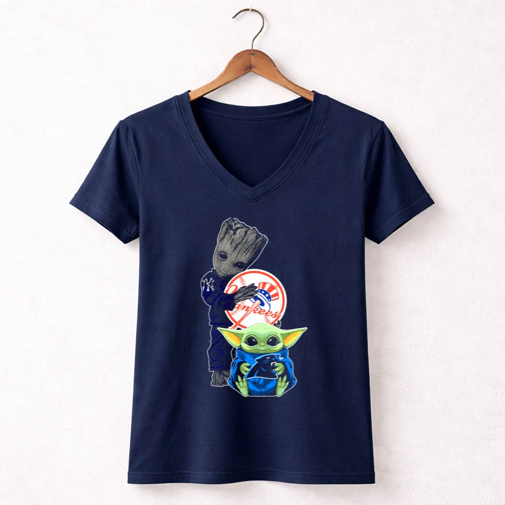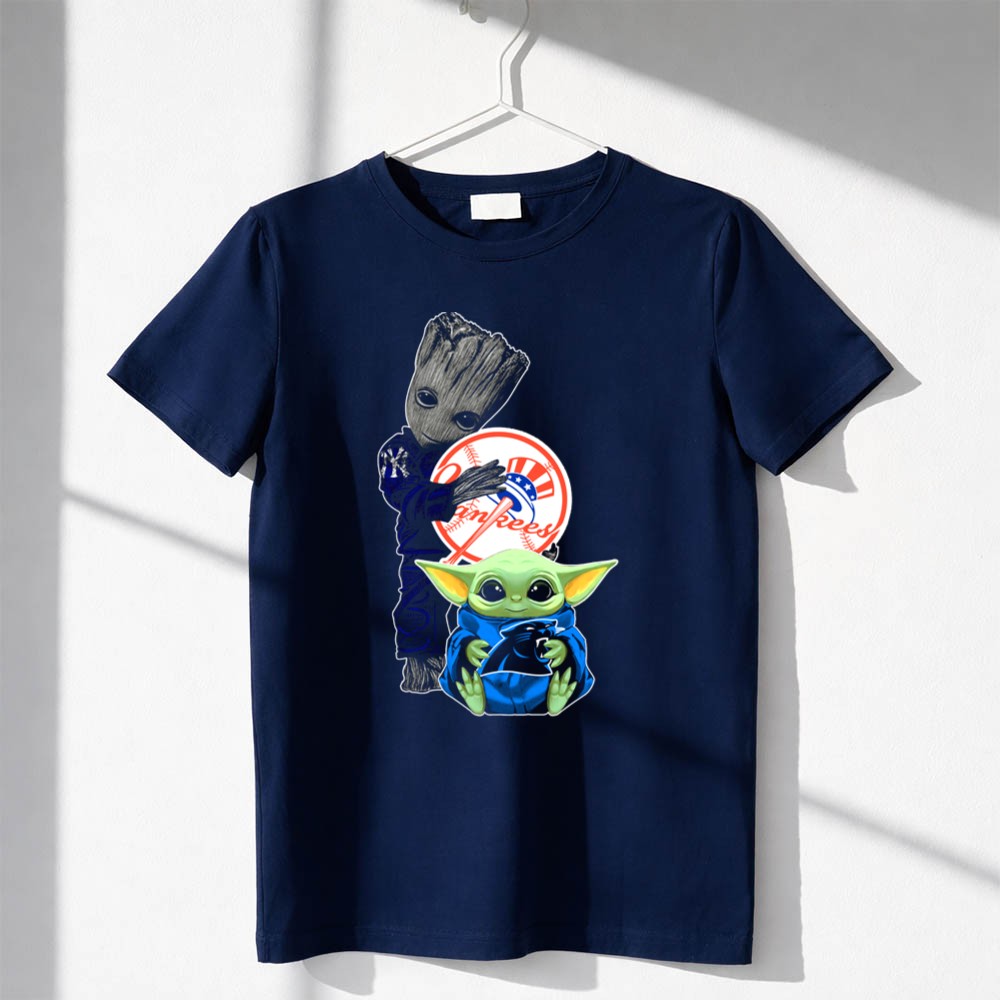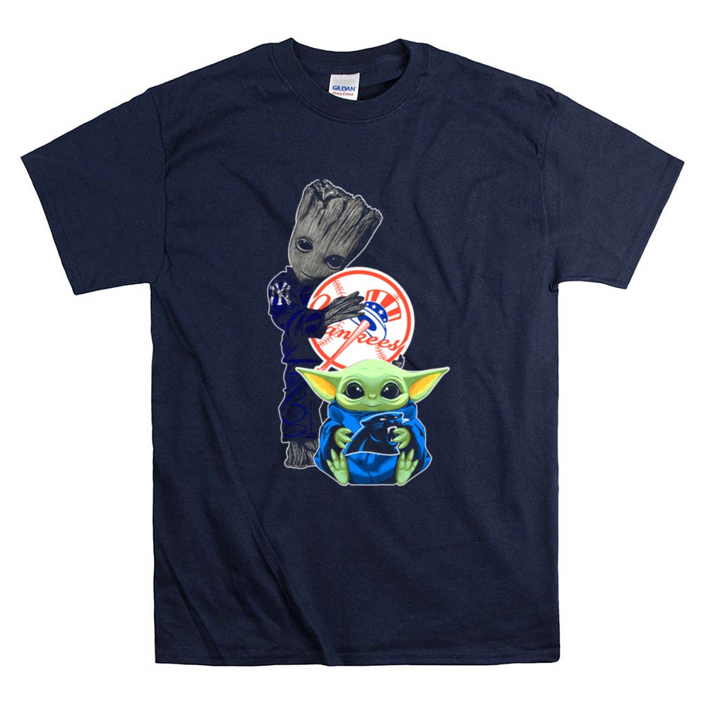 New York Yankees fandom, Groot character merchandise, Baby Yoda apparel, iconic sports mashup, premium cotton t-shirt, baseball culture, pop culture crossover, unique gift for fans