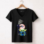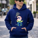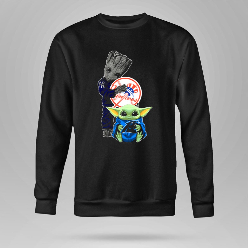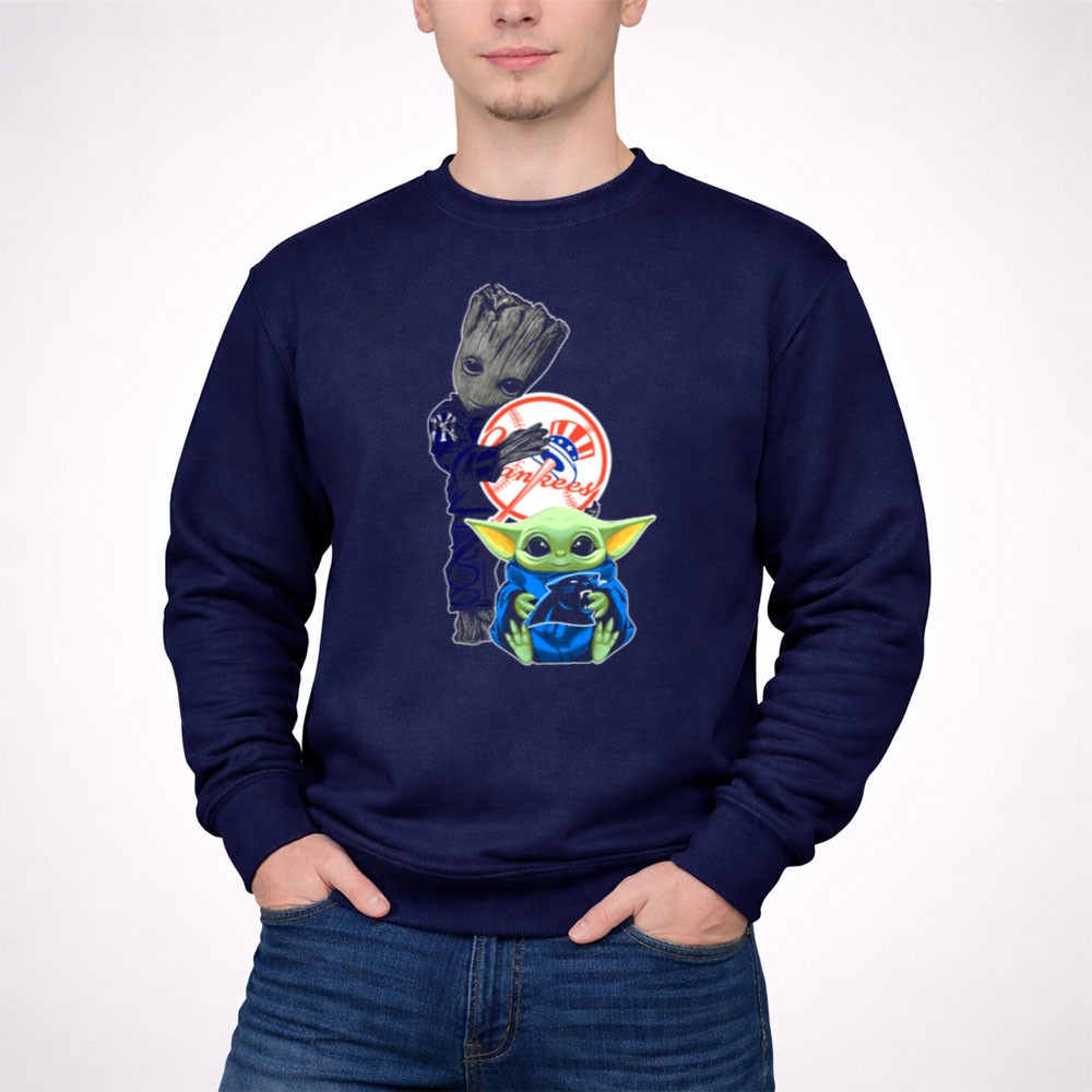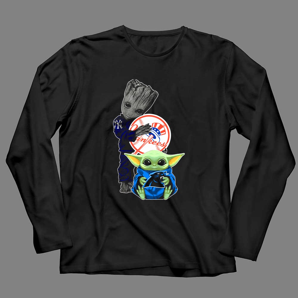 New York Yankees fandom, Groot character merchandise, Baby Yoda apparel, iconic sports mashup, premium cotton t-shirt, baseball culture, pop culture crossover, unique gift for fans