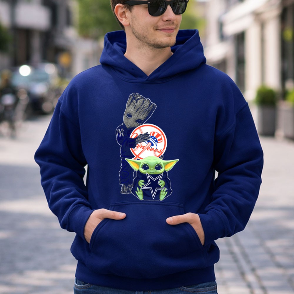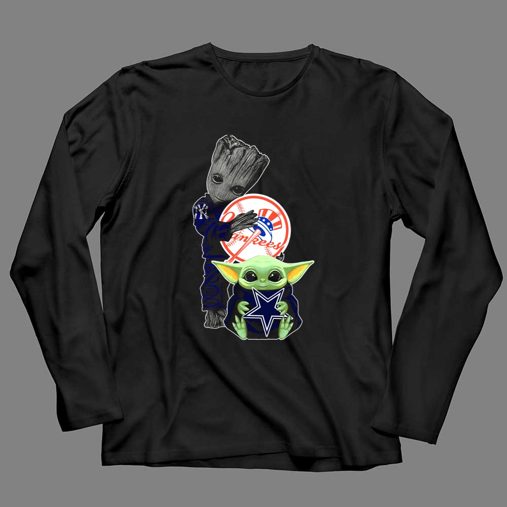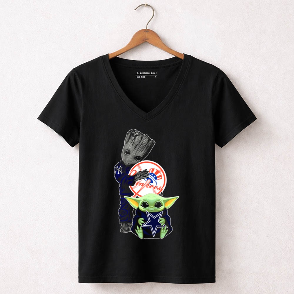 Yankees baseball, Dallas Cowboys football, Baby Groot, Baby Yoda, pop culture apparel, fandom mashup, vintage sports nostalgia, game day t-shirt
