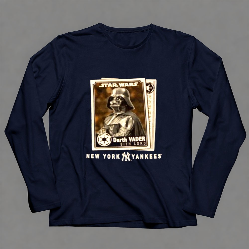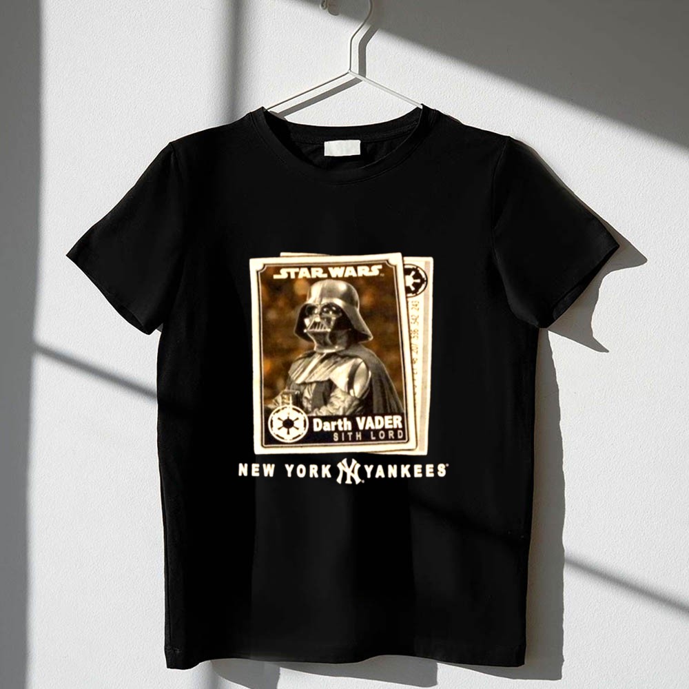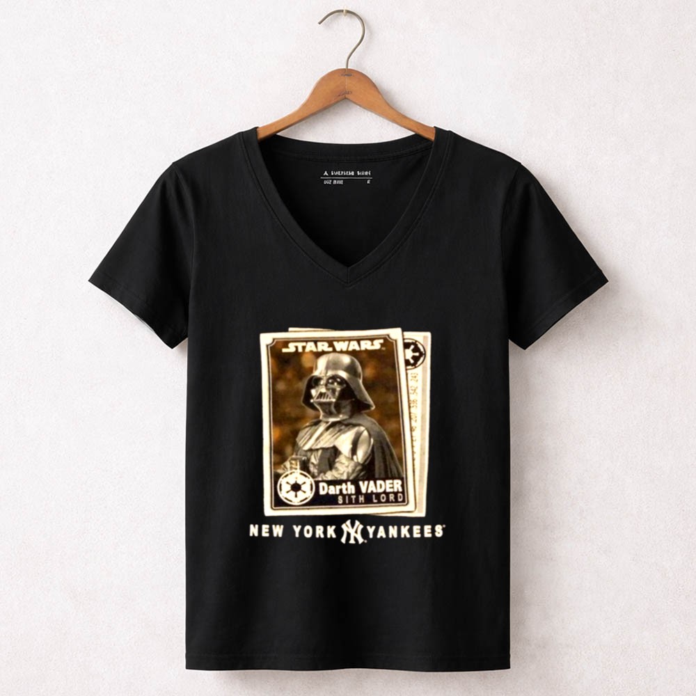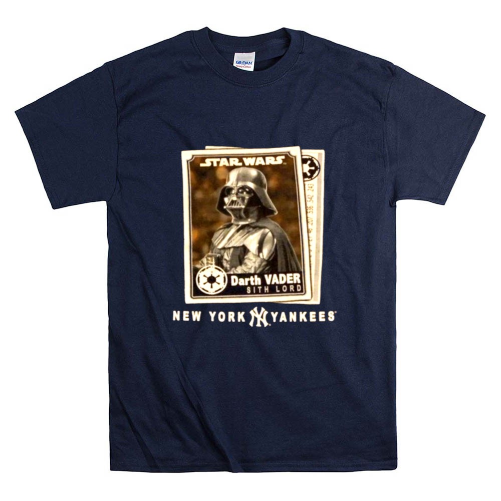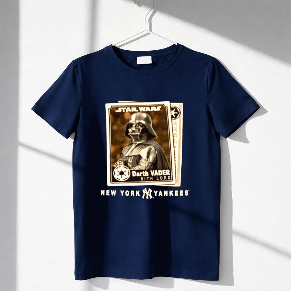 New York Yankees fandom, Star Wars enthusiasts, Darth Vader apparel, Bronx Bombers spirit, iconic sci-fi crossover, game day t-shirt, premium cotton blend, unique gift for fans
