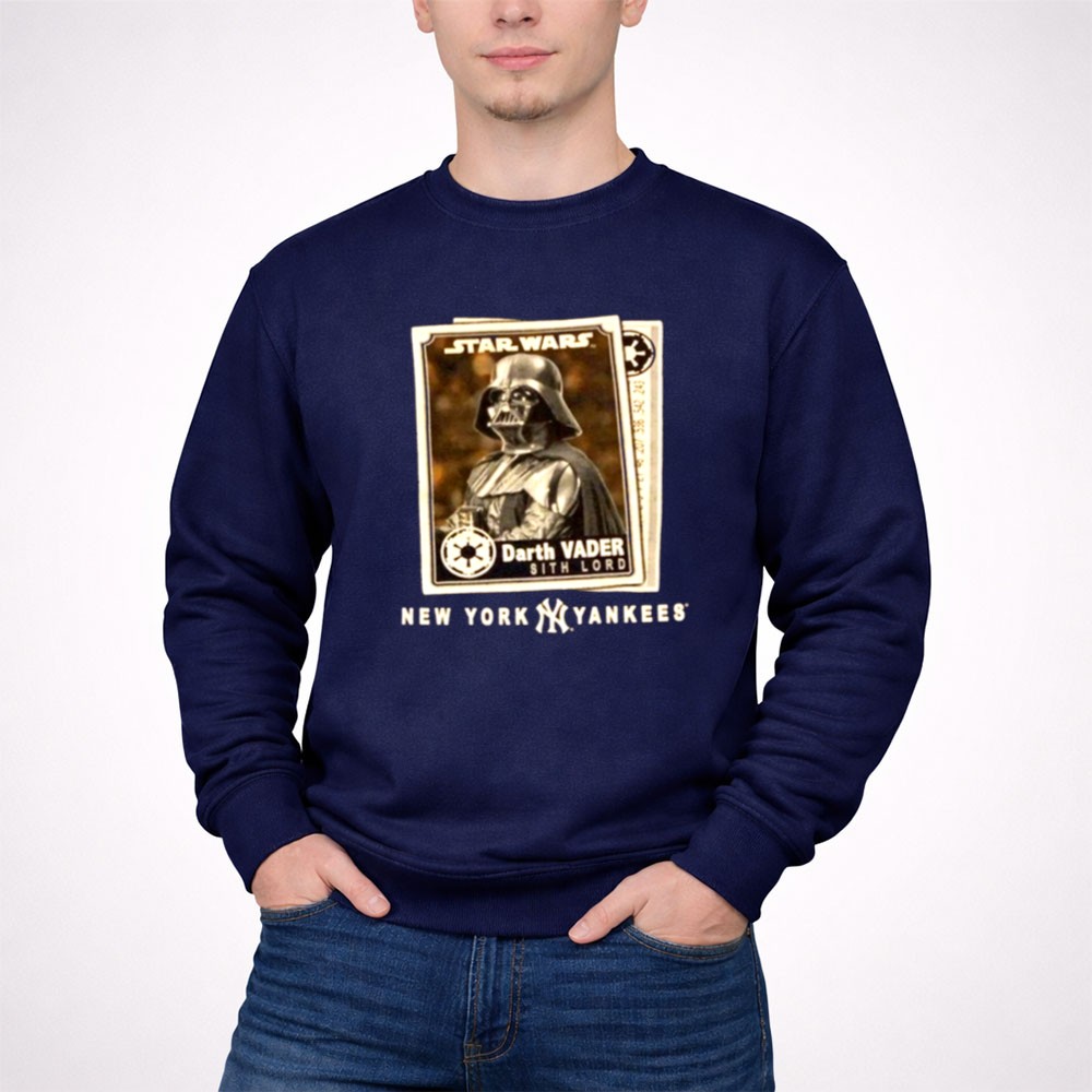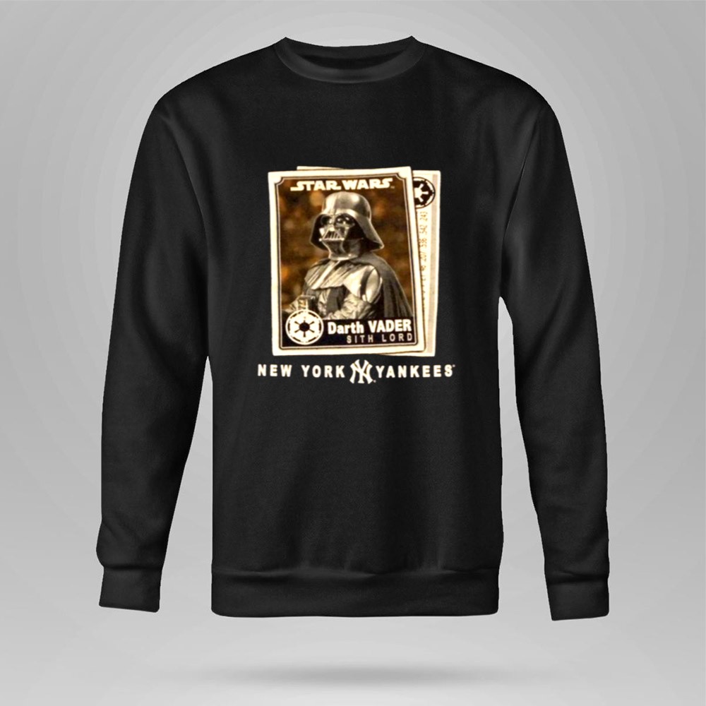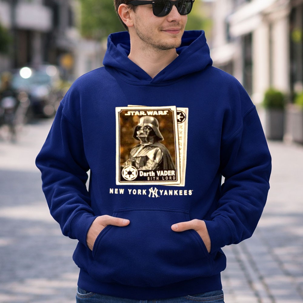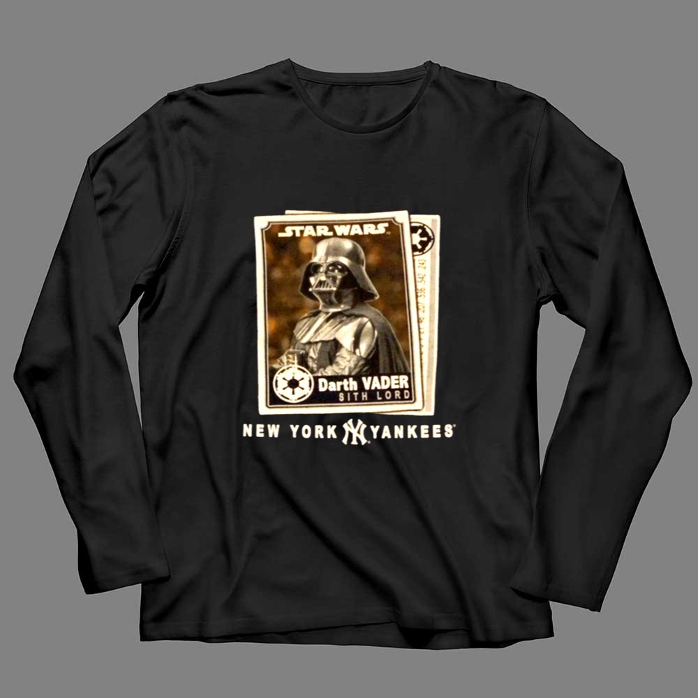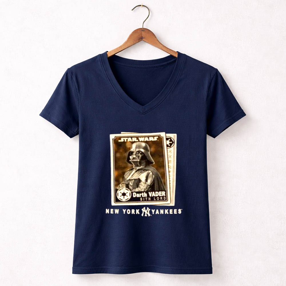 New York Yankees fandom, Star Wars enthusiasts, Darth Vader apparel, Bronx Bombers spirit, iconic sci-fi crossover, game day t-shirt, premium cotton blend, unique gift for fans