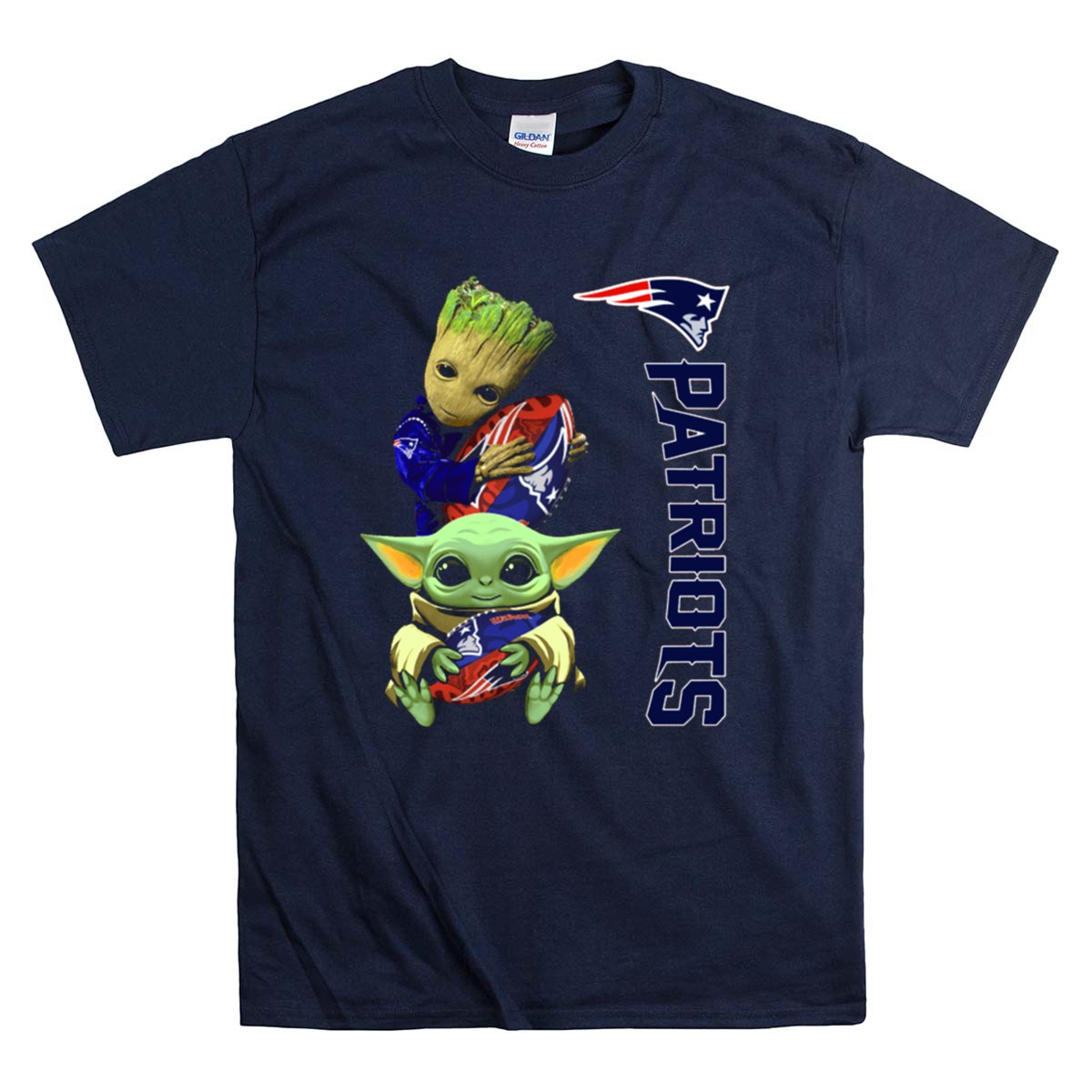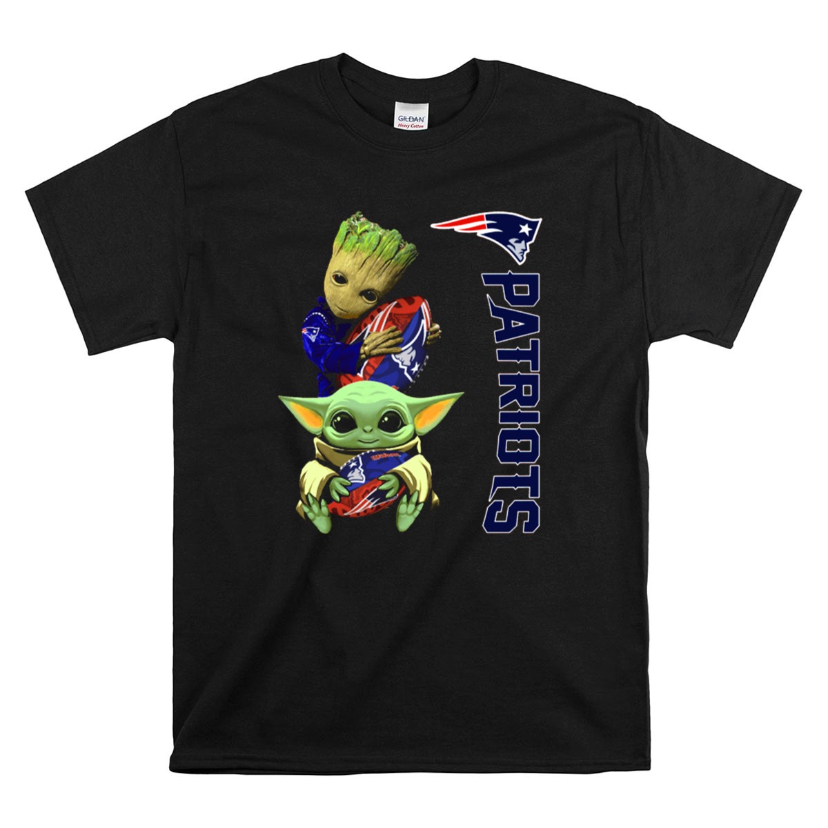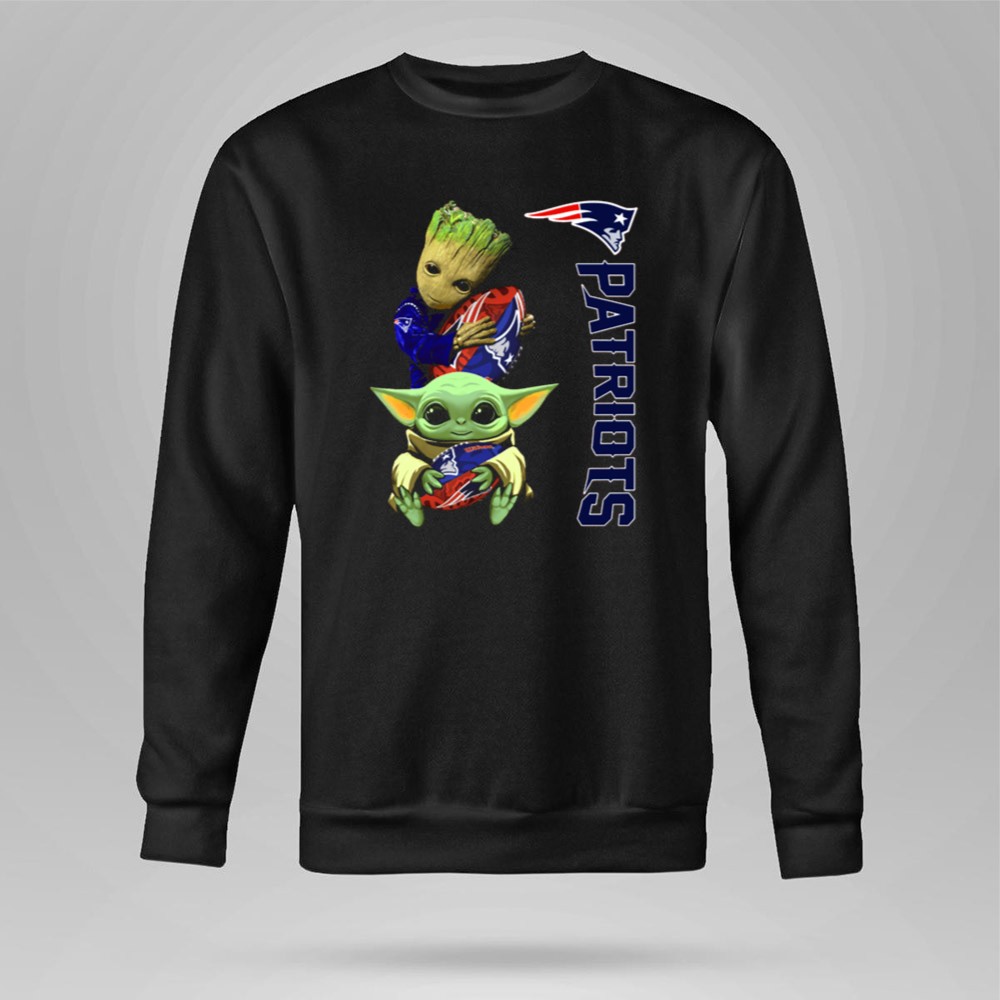 New England Patriots fandom, Groot and Baby Yoda apparel, football season fun, pop culture mashup, game day t-shirt, Boston sports pride, unique fan gear, NFL novelty shirt