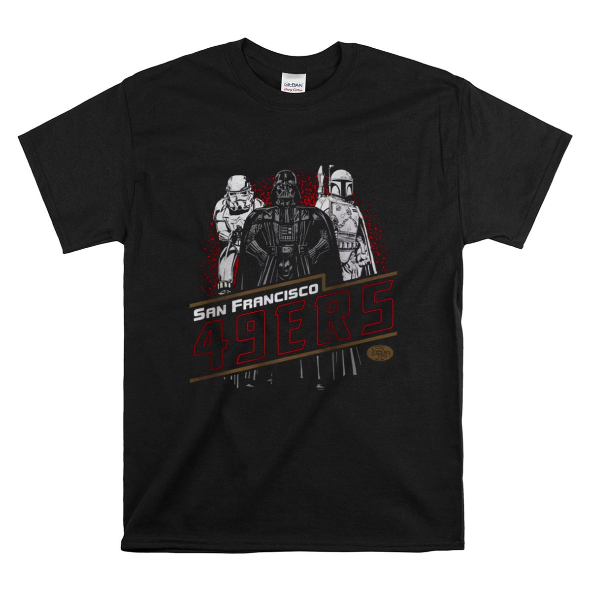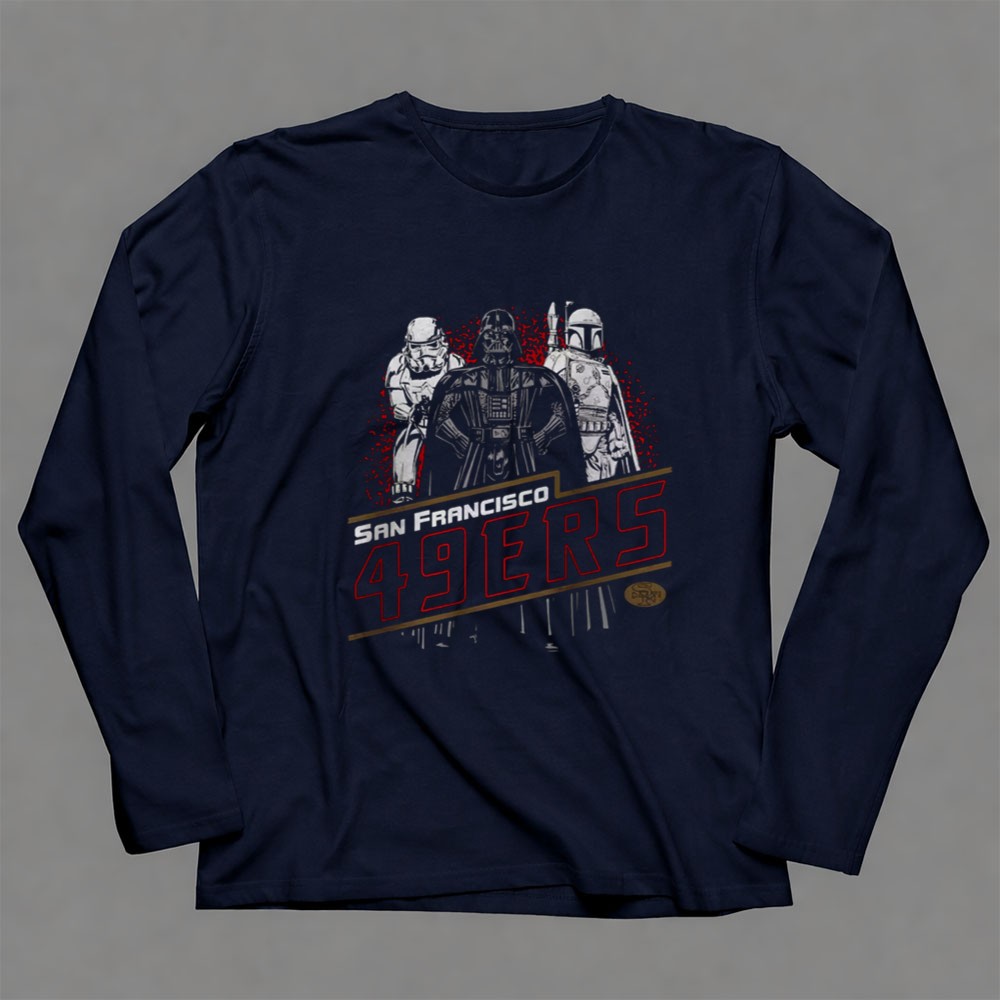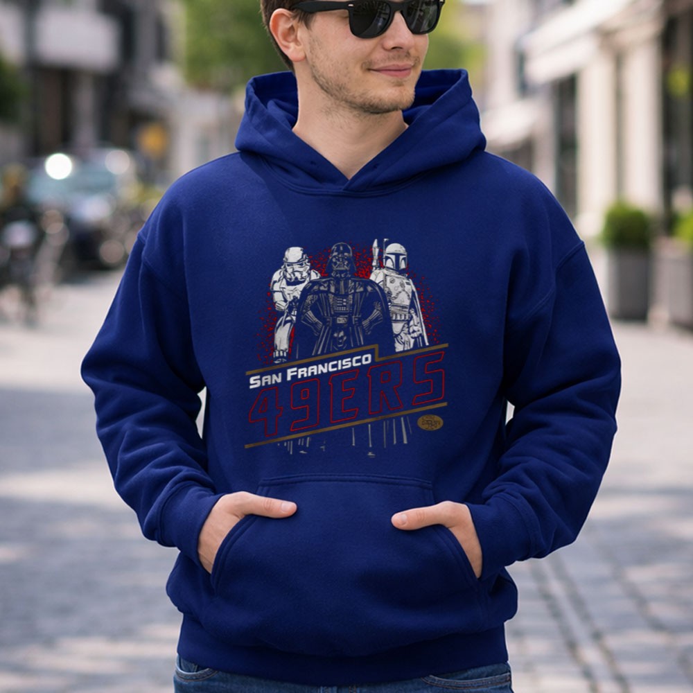 This design captures the spirit of two beloved worlds, intertwining the fierce pride of San Francisco 49ers fans with the timeless allure of Star Wars. Featuring Darth Vader, Stormtrooper, and Boba Fett, it pays tribute to the nostalgia and unity found in both football and legendary film, creating a bold statement piece for any fan’s wardrobe.
