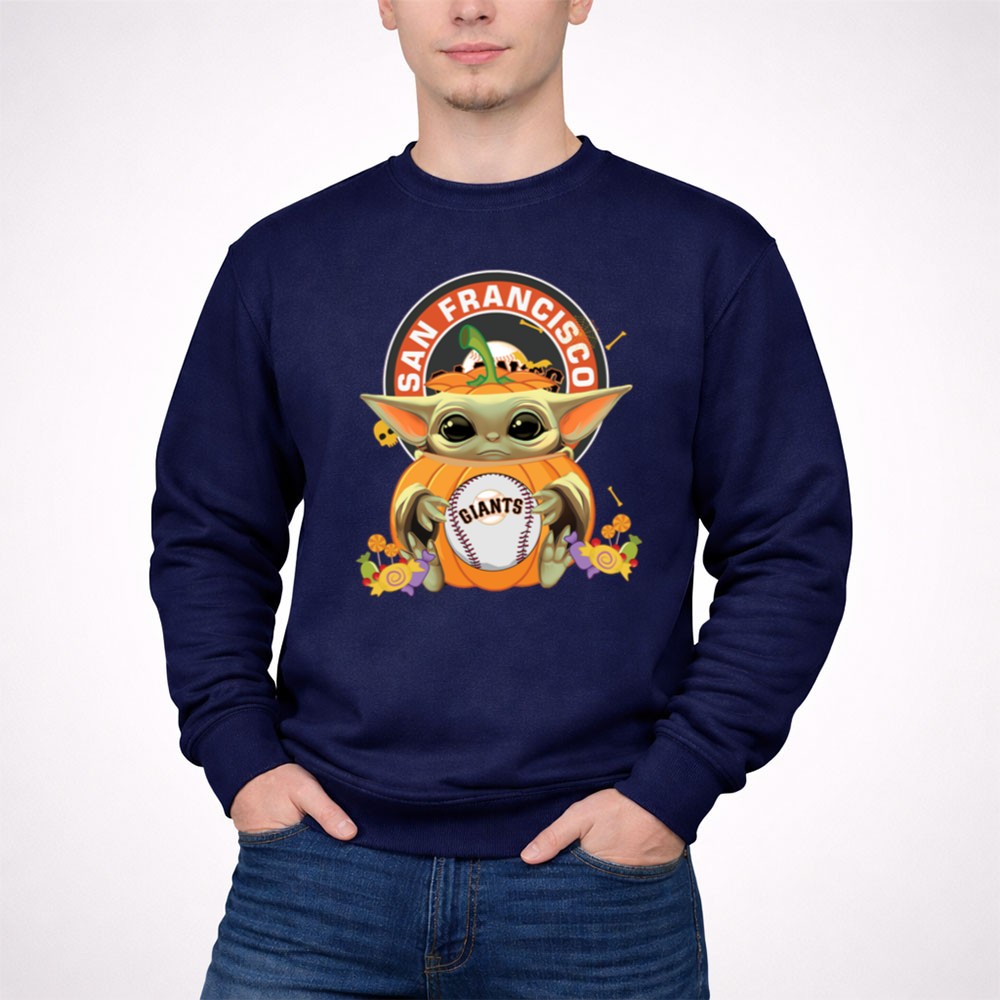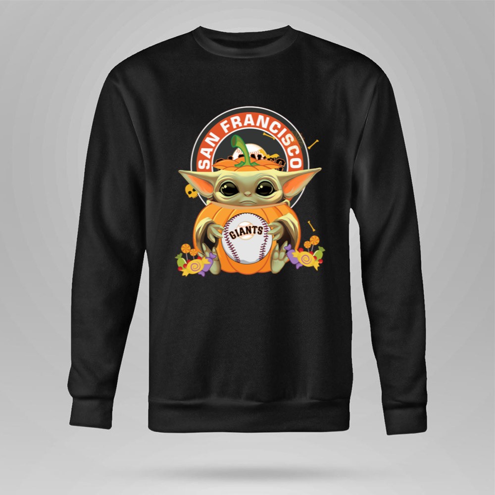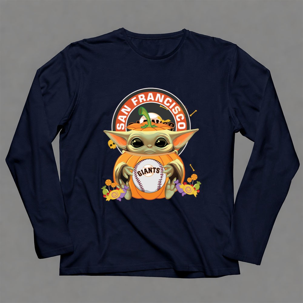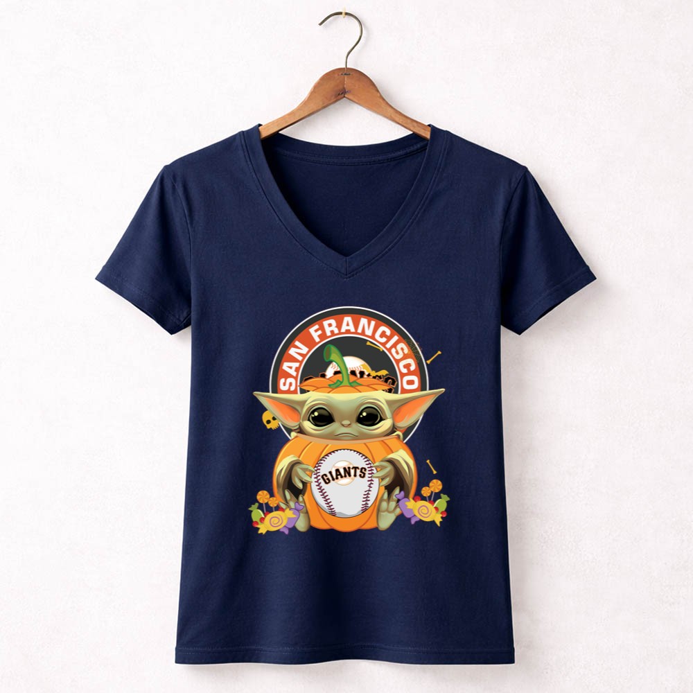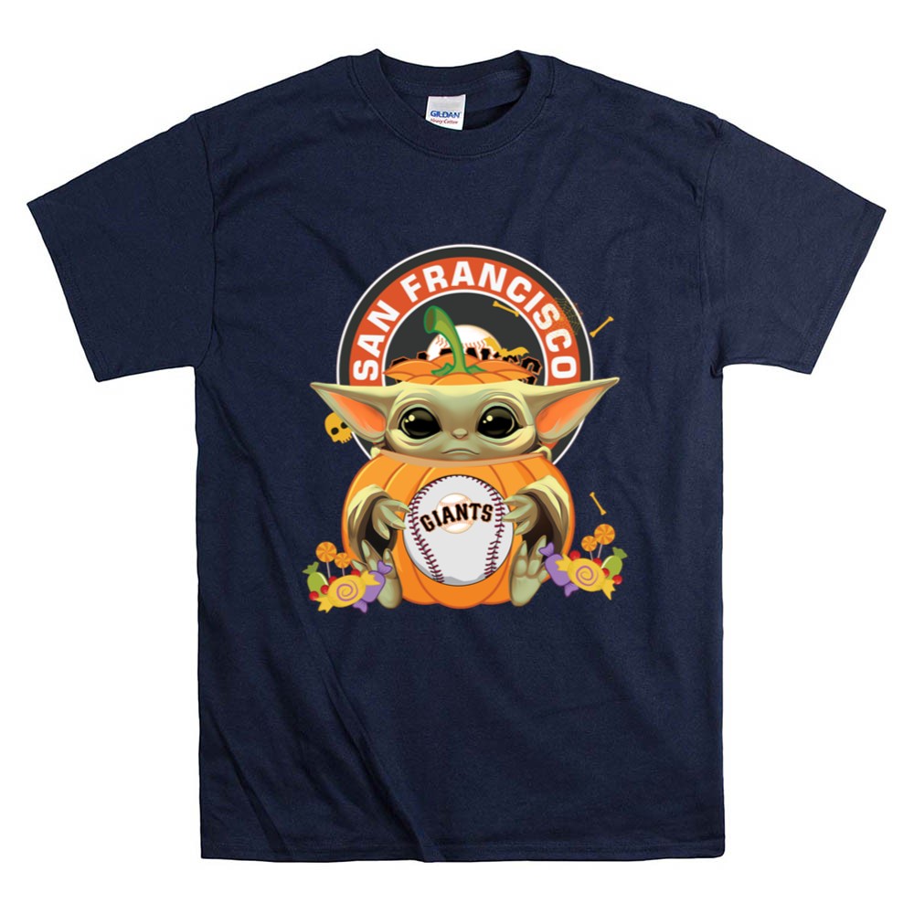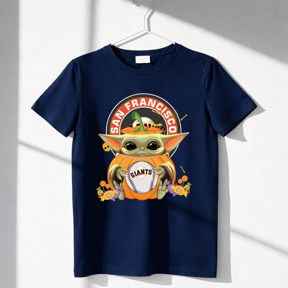 This design beautifully blends the magic of Halloween with the spirit of the San Francisco Giants. Featuring Baby Yoda affectionately hugging a pumpkin while holding a baseball, it captures the joy of fandom and the nostalgia of cherished characters, making it a delightful addition to any fan’s wardrobe during the festive season.
