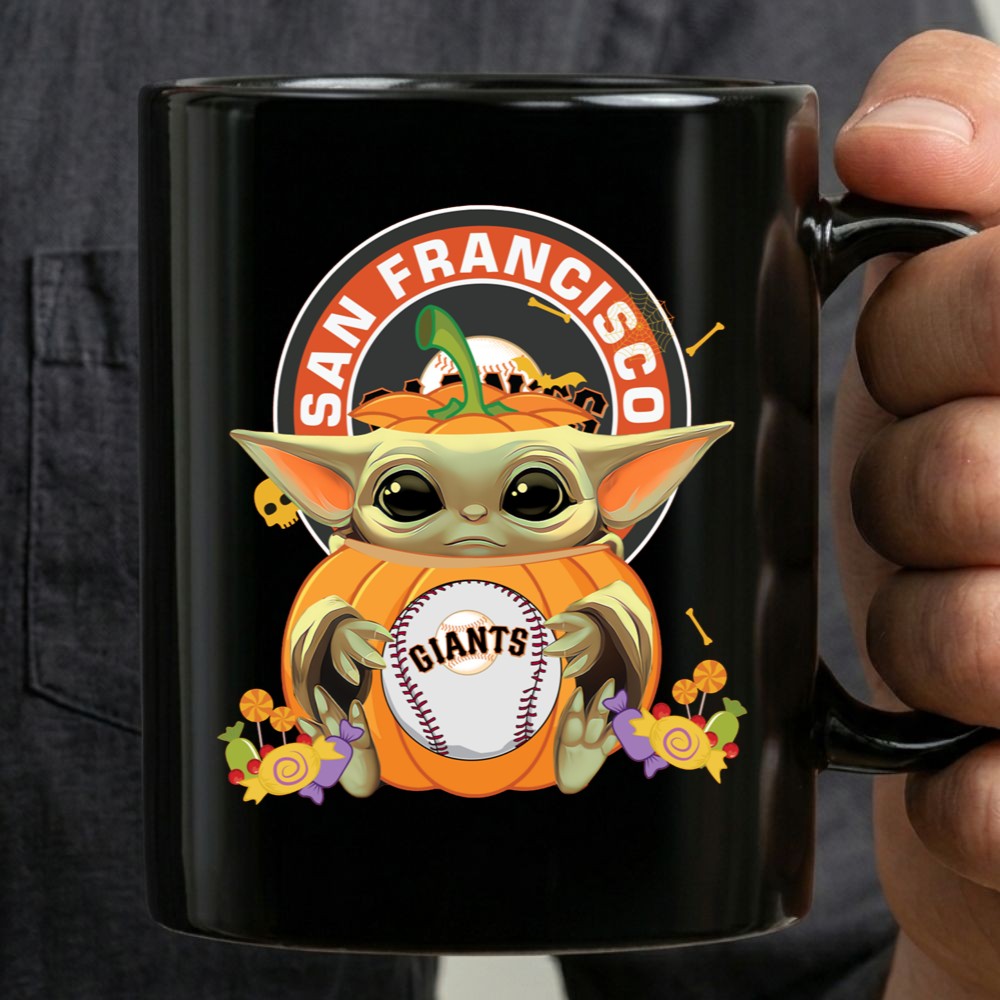 This enchanting design captures the magic of Halloween through the lens of beloved pop culture, showcasing Baby Yoda tenderly hugging a pumpkin adorned with the San Francisco Giants logo. The whimsical illustration evokes a sense of joy and nostalgia, inviting fans to celebrate the spooky season while expressing their team spirit. It’s a heartfelt tribute to the playful nature of both Halloween and baseball.