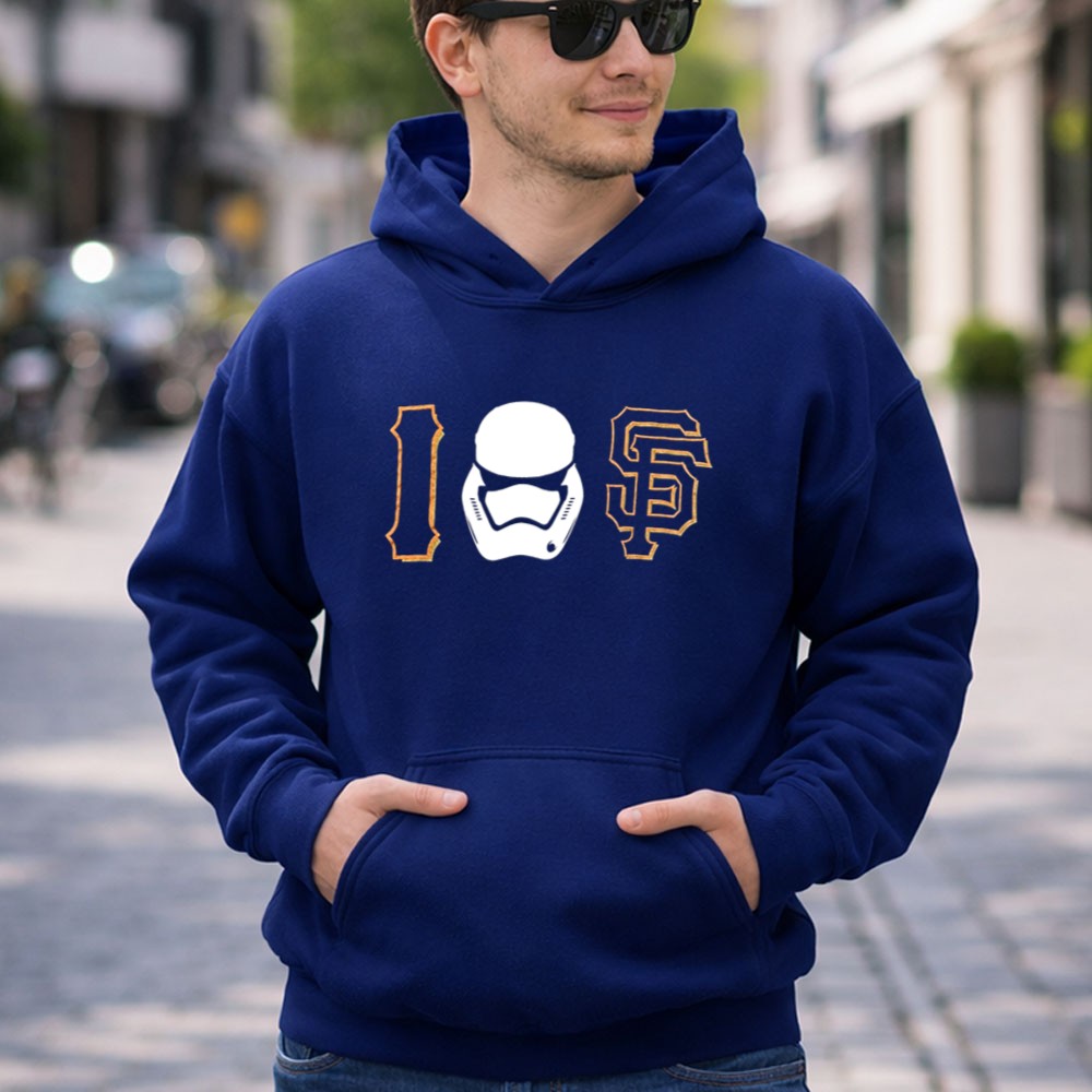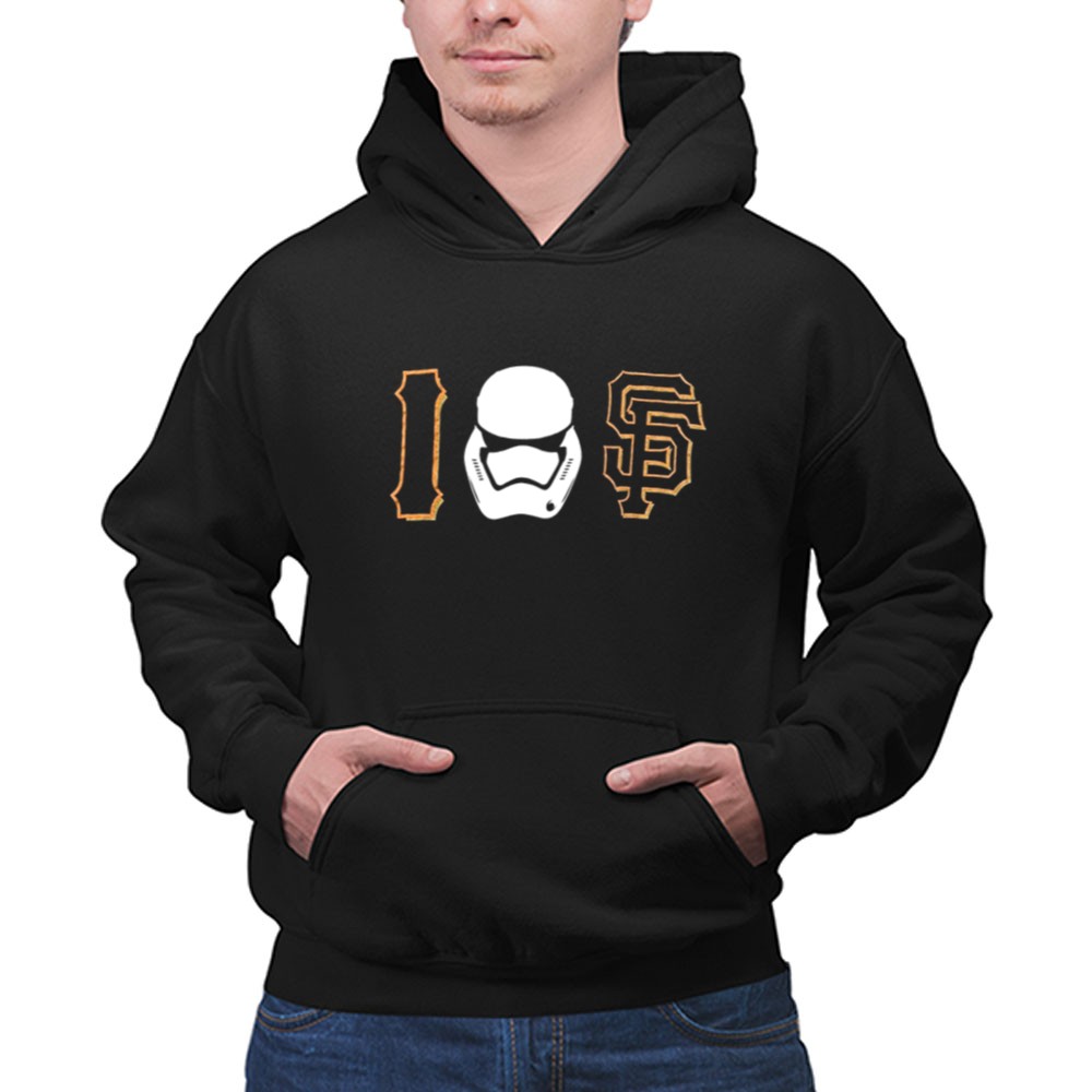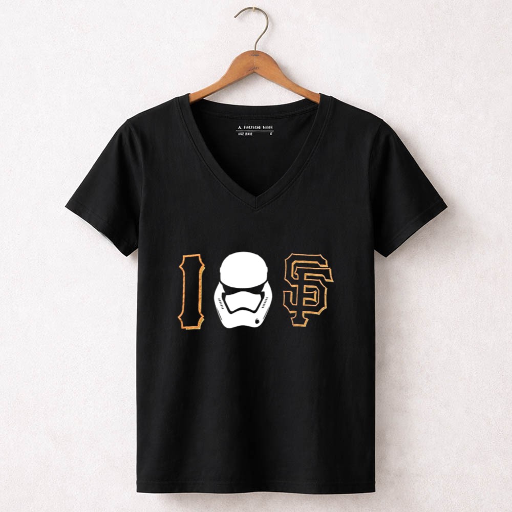 This design captures the playful intersection of sports and pop culture, merging the beloved San Francisco Giants with the iconic imagery of a Stormtrooper. It reflects a celebration of fandom, inviting wearers to embrace their unique identities as both sports enthusiasts and sci-fi lovers, making it a standout piece in urban streetwear.