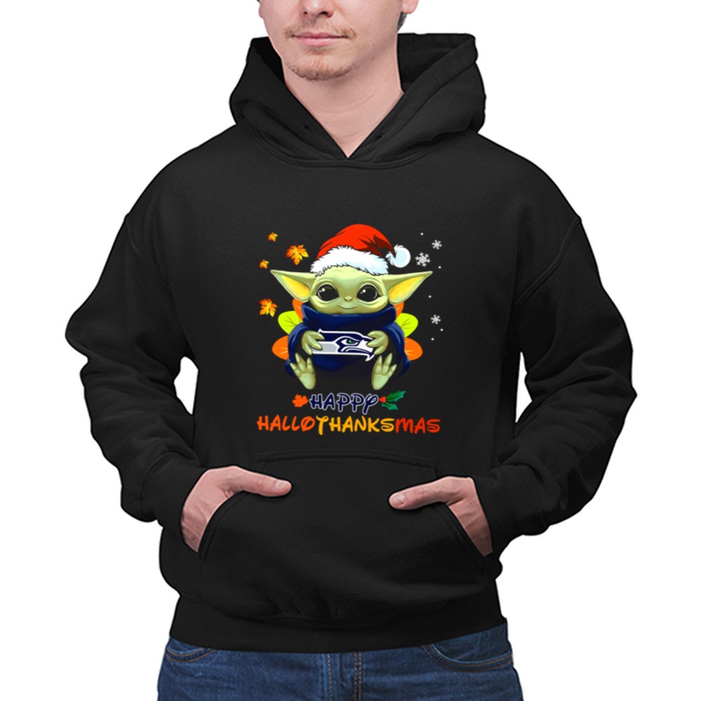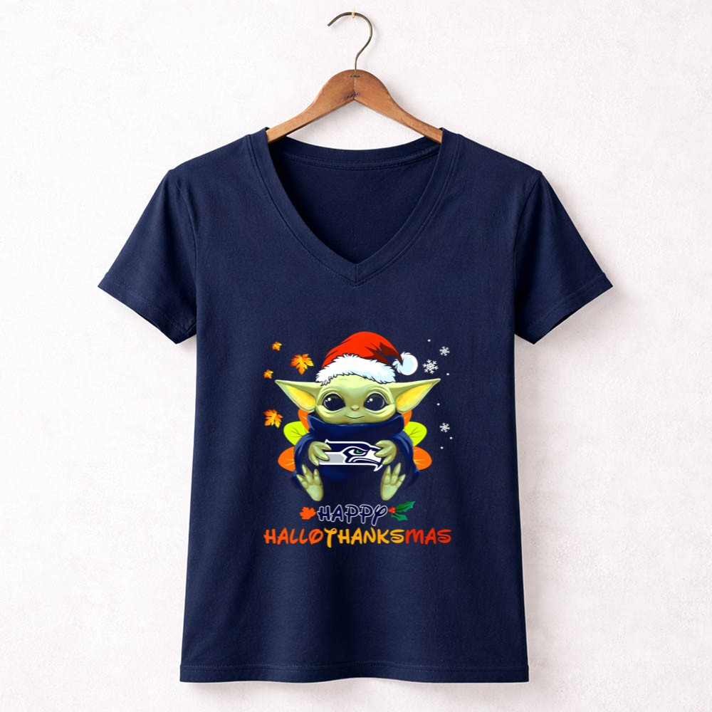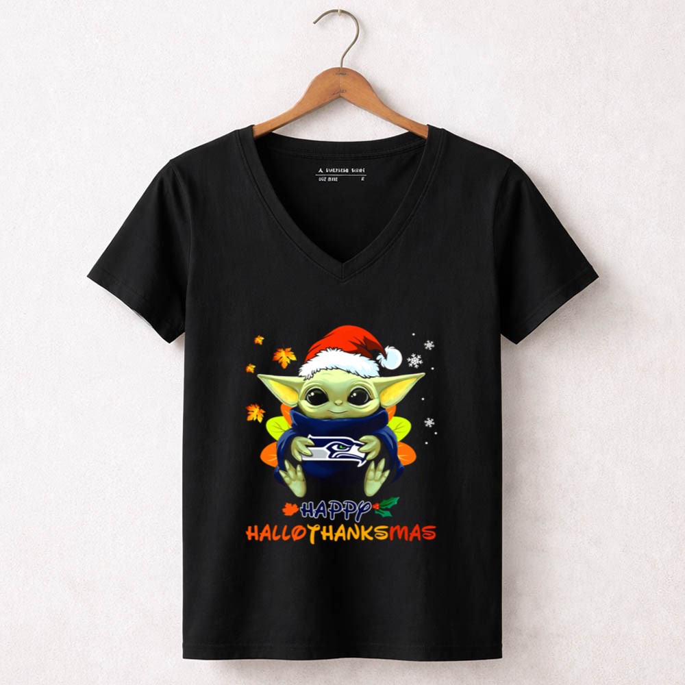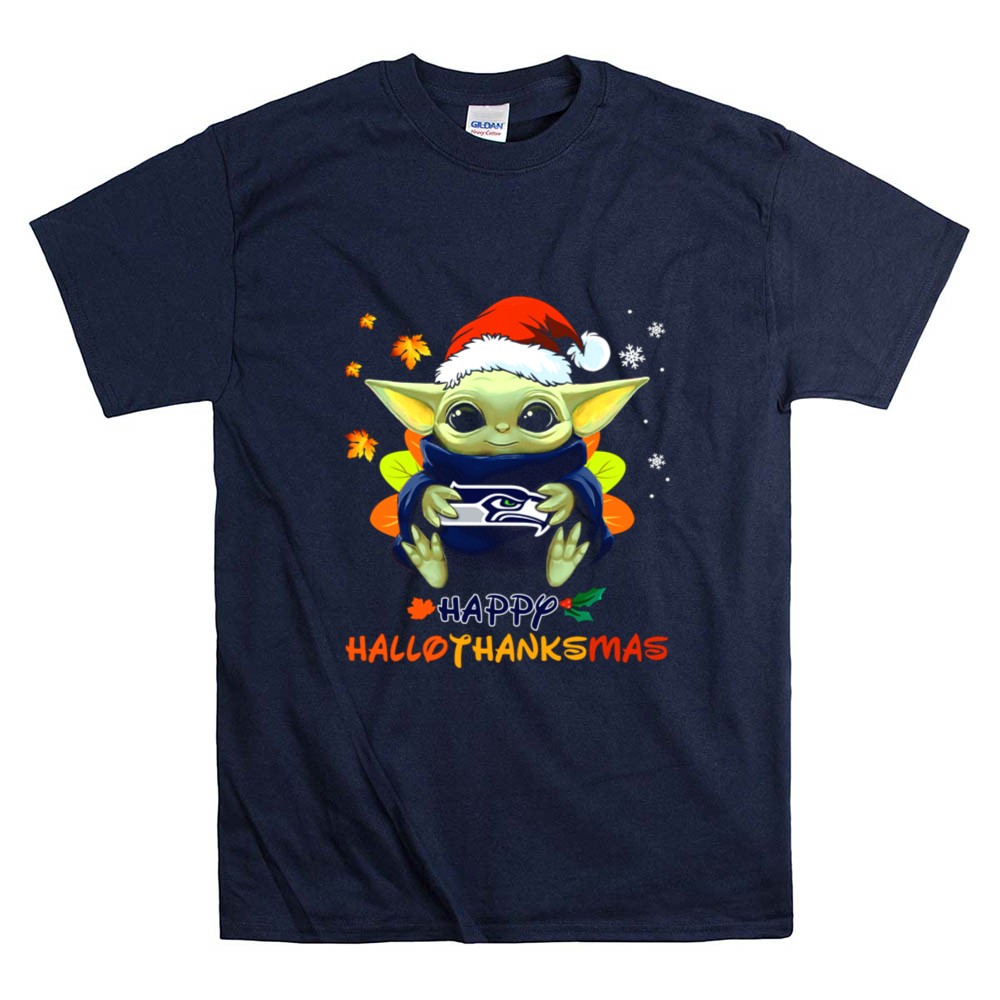 Seattle Seahawks fandom, Baby Yoda holiday spirit, Seahawks fan apparel, Merry Hallothanksmas shirt, festive football gear, pop culture mashup, NFL holiday gifts, Seattle sports pride