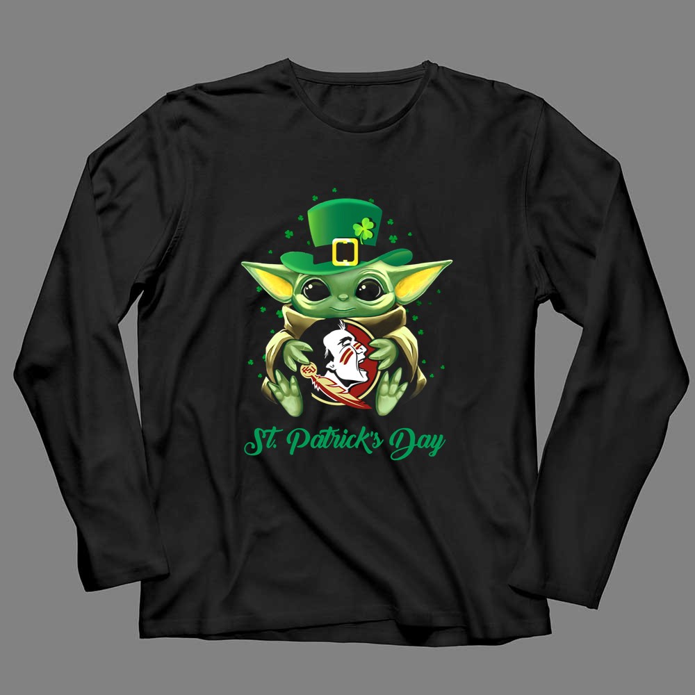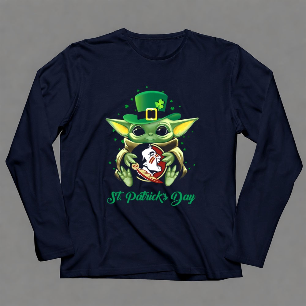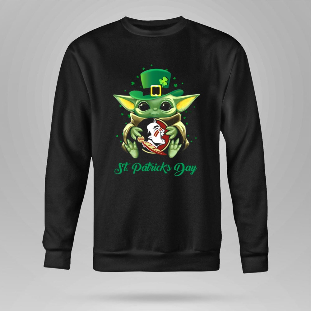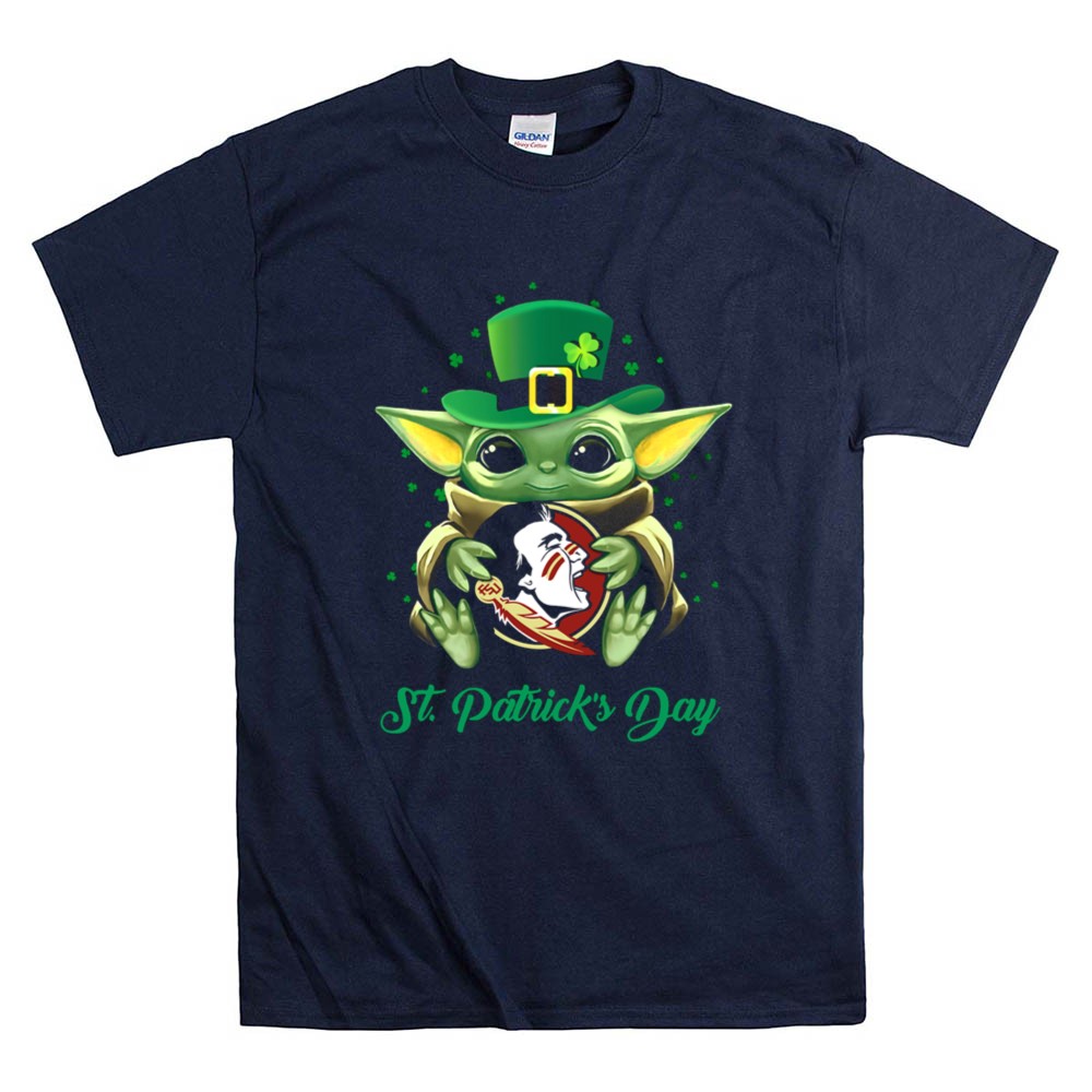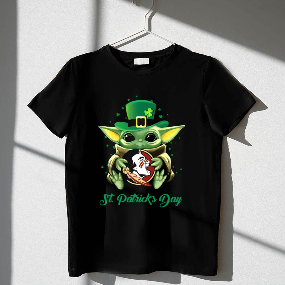 Florida State Seminoles, St. Patrick's Day apparel, Baby Yoda fan gear, college sports pride, festive t-shirt, iconic team mascot, game day style, holiday celebration clothing