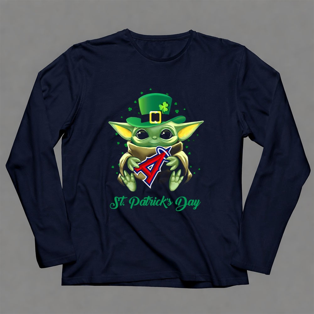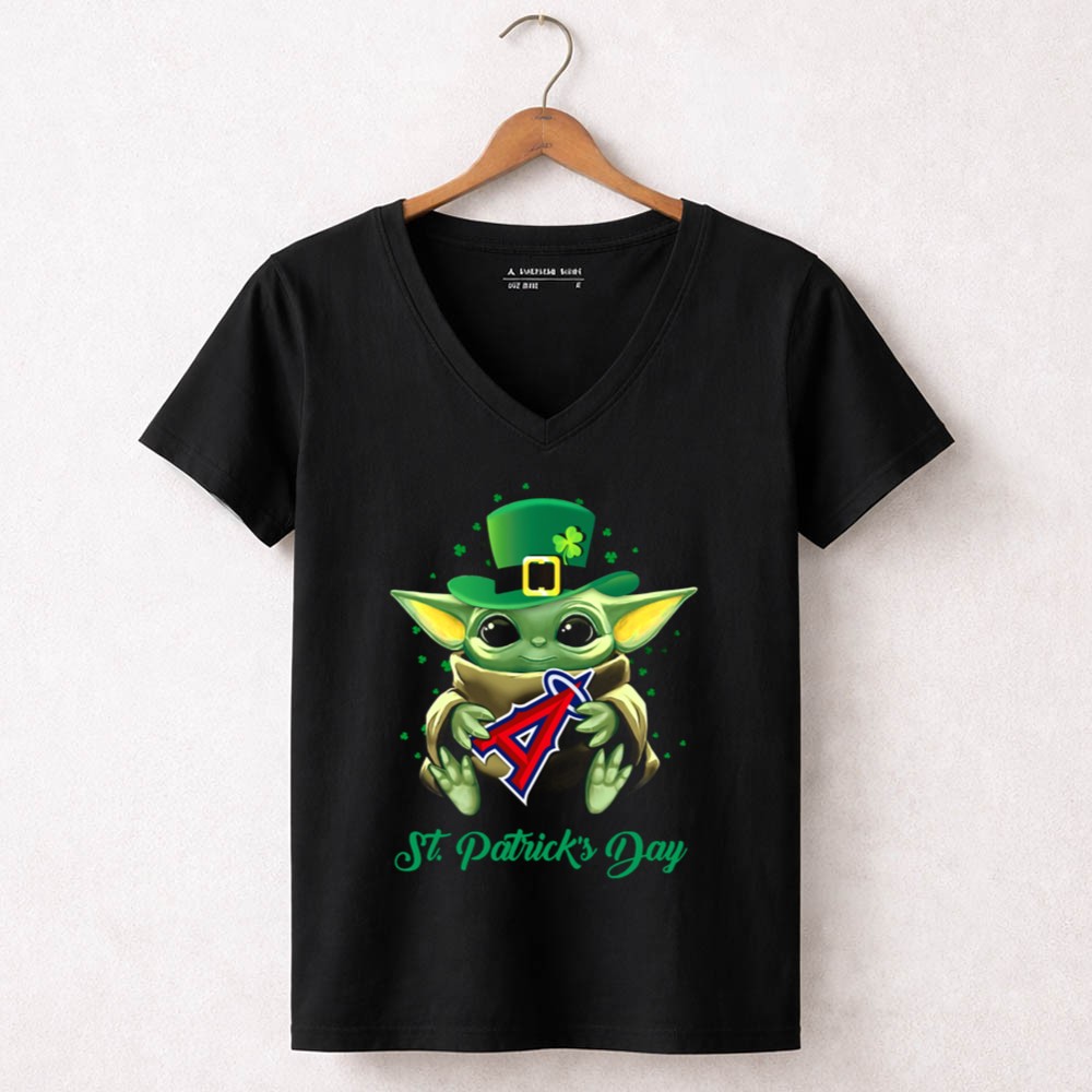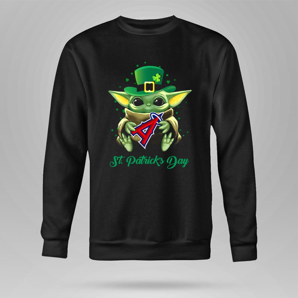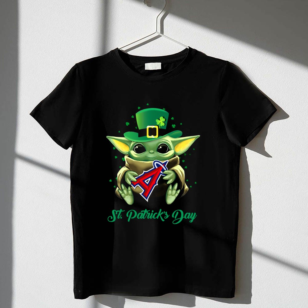 Los Angeles Angels gear, Baby Yoda merchandise, St. Patrick's Day apparel, fan favorite character, MLB pride, playful holiday shirt, festive sportswear, perfect for Angels fans