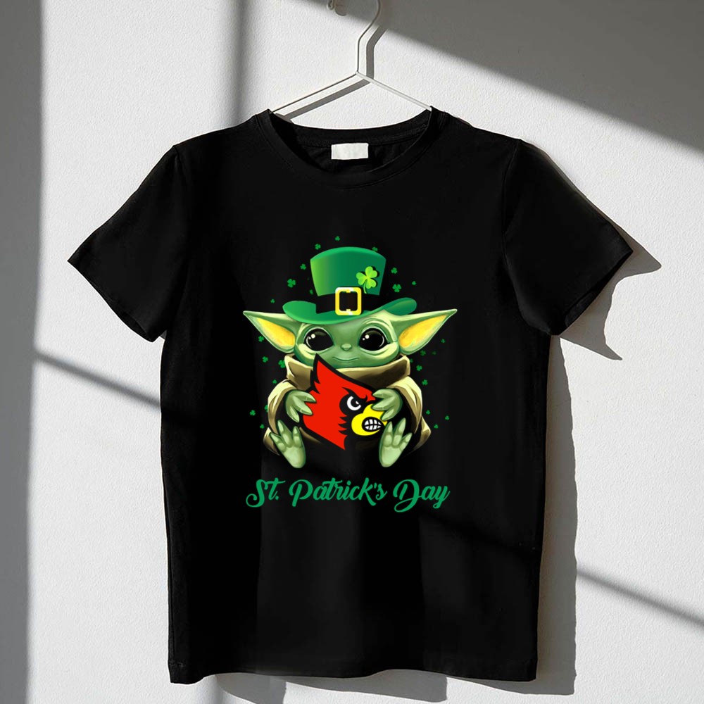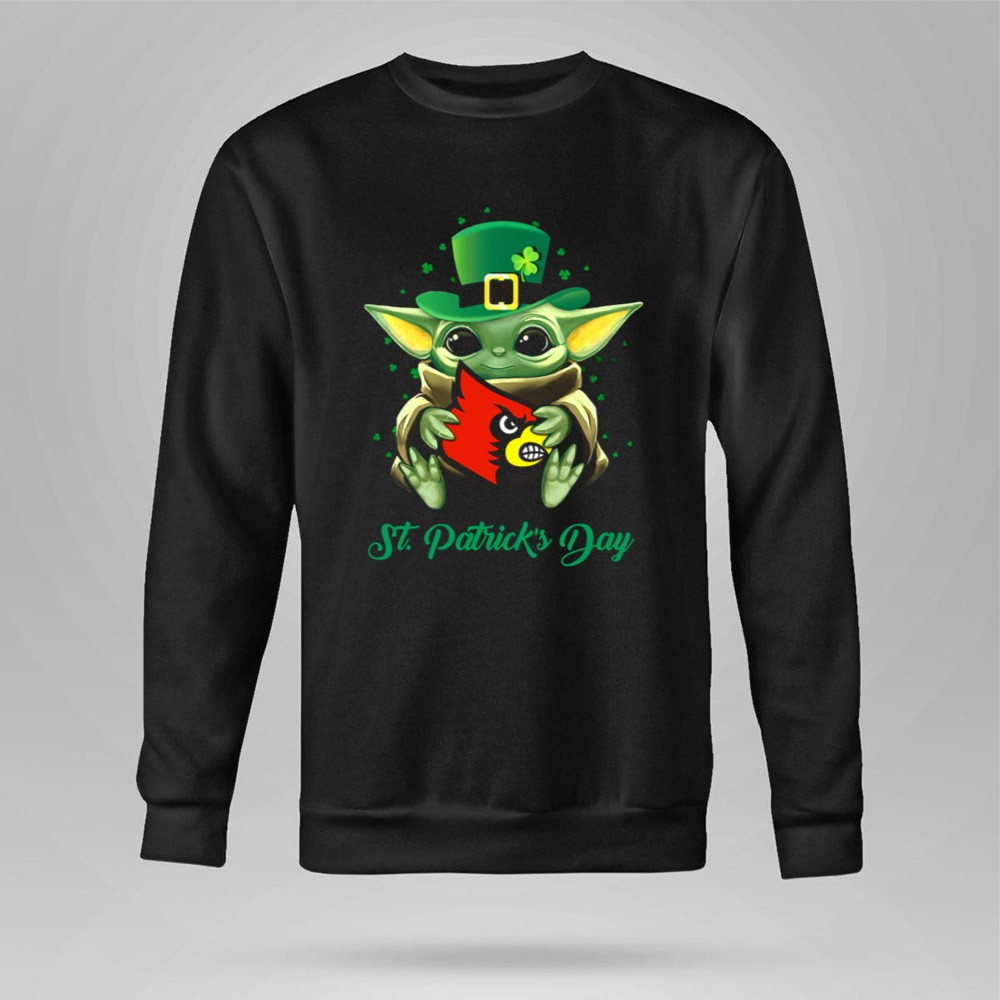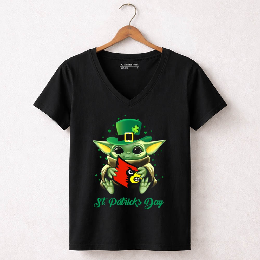 Louisville Cardinals, Baby Yoda, St. Patrick's Day apparel, holiday spirit, sports fandom, University of Louisville pride, unique gifts, playful fan gear