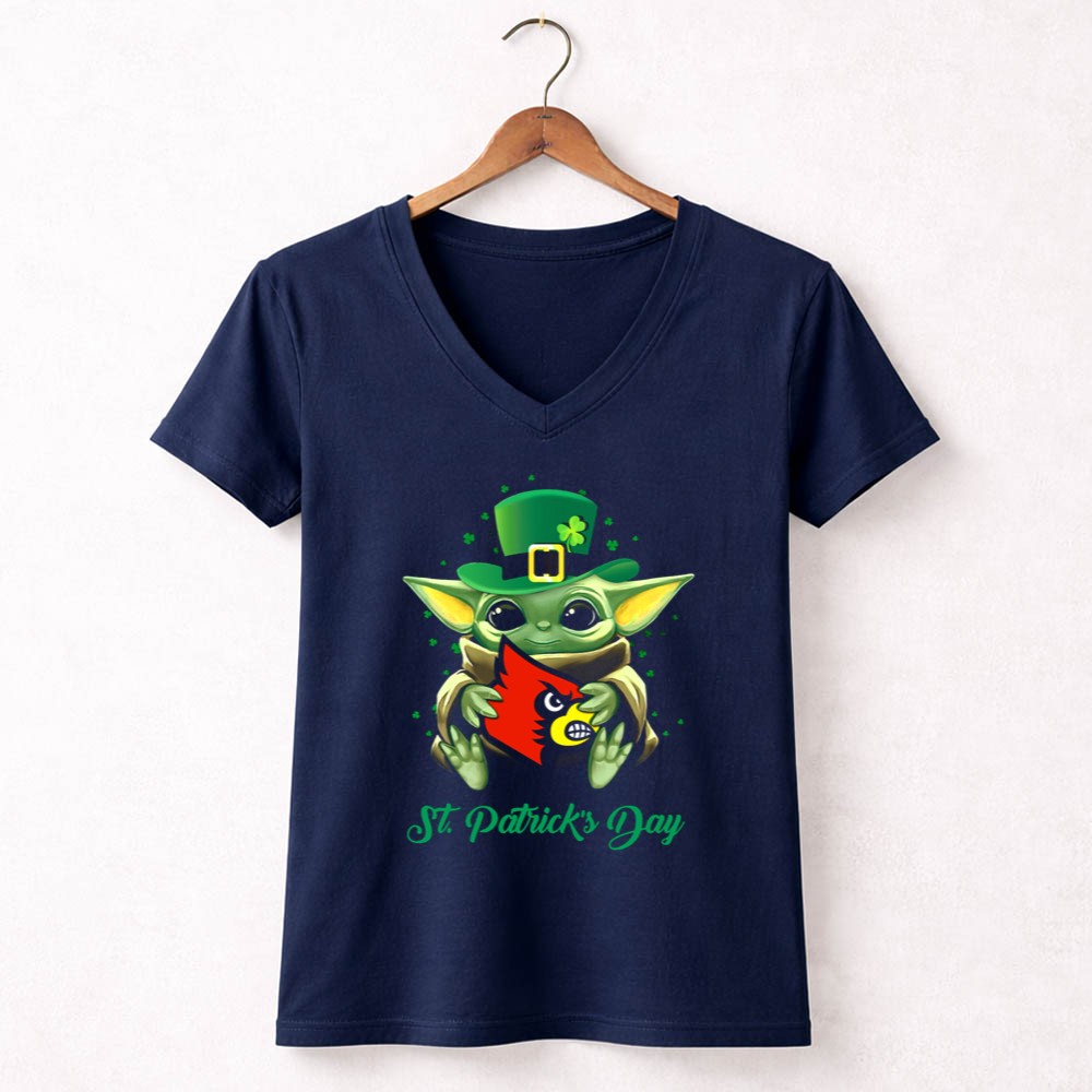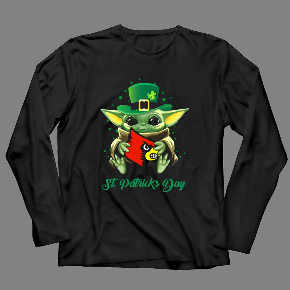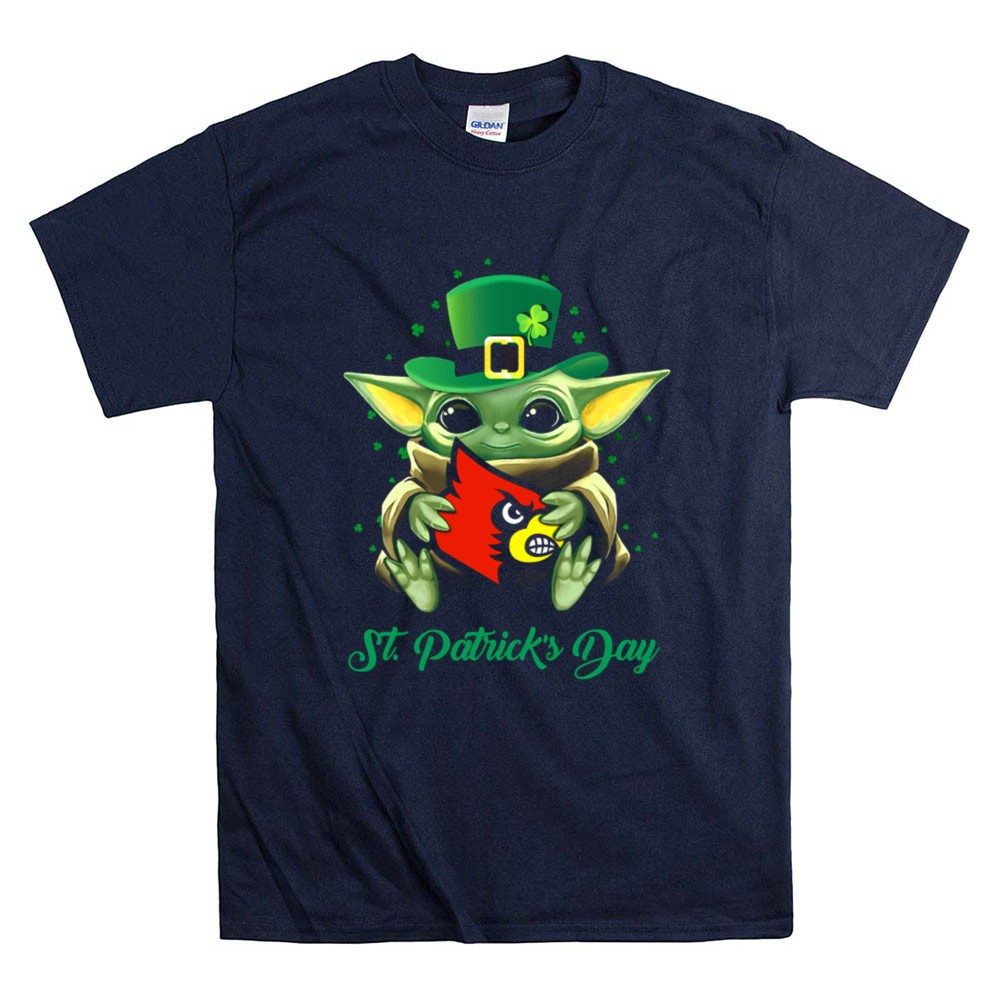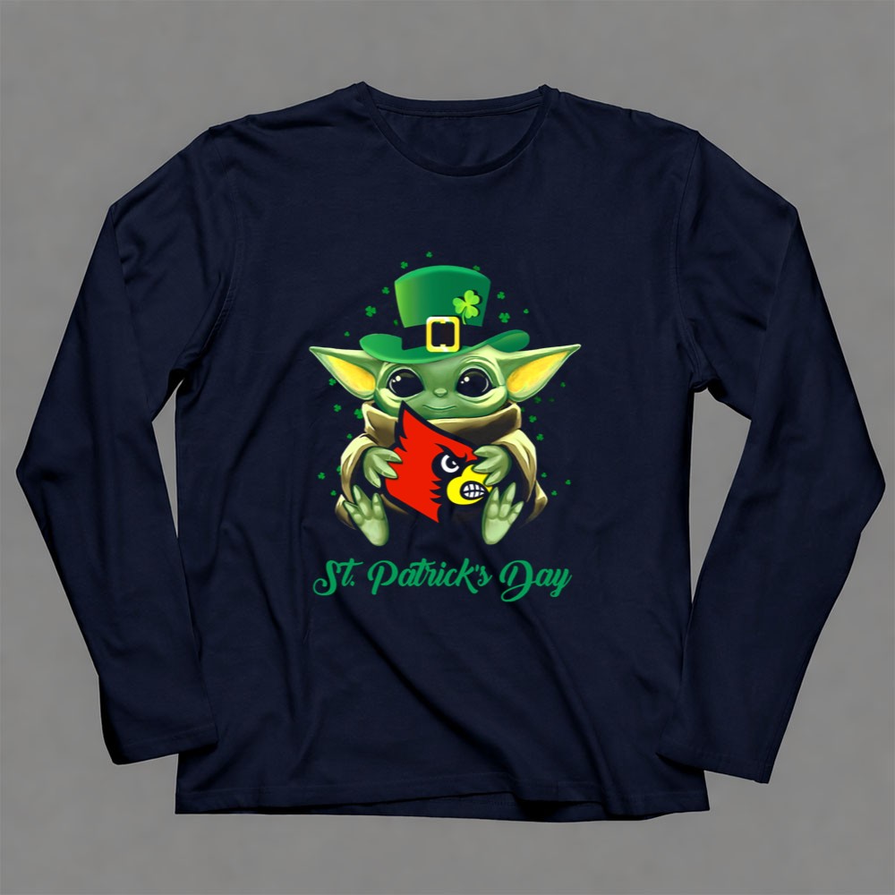 Louisville Cardinals, Baby Yoda, St. Patrick's Day apparel, holiday spirit, sports fandom, University of Louisville pride, unique gifts, playful fan gear