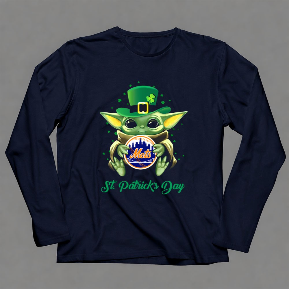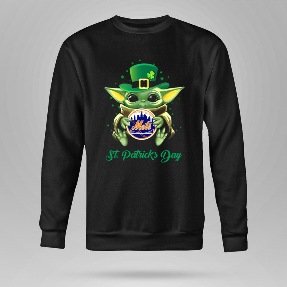 New York Mets St. Patrick's Day apparel, Baby Yoda fan gear, MLB holiday t-shirt, Mets green leprechaun shirt, festive baseball outfit, pop culture sports fusion, lucky charm for fans, premium cotton tee