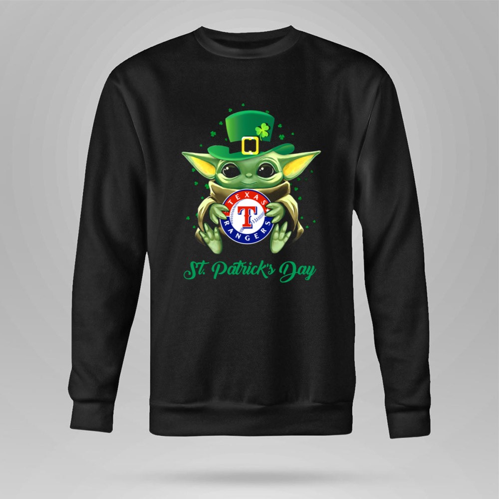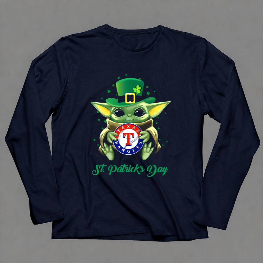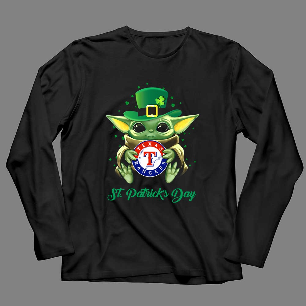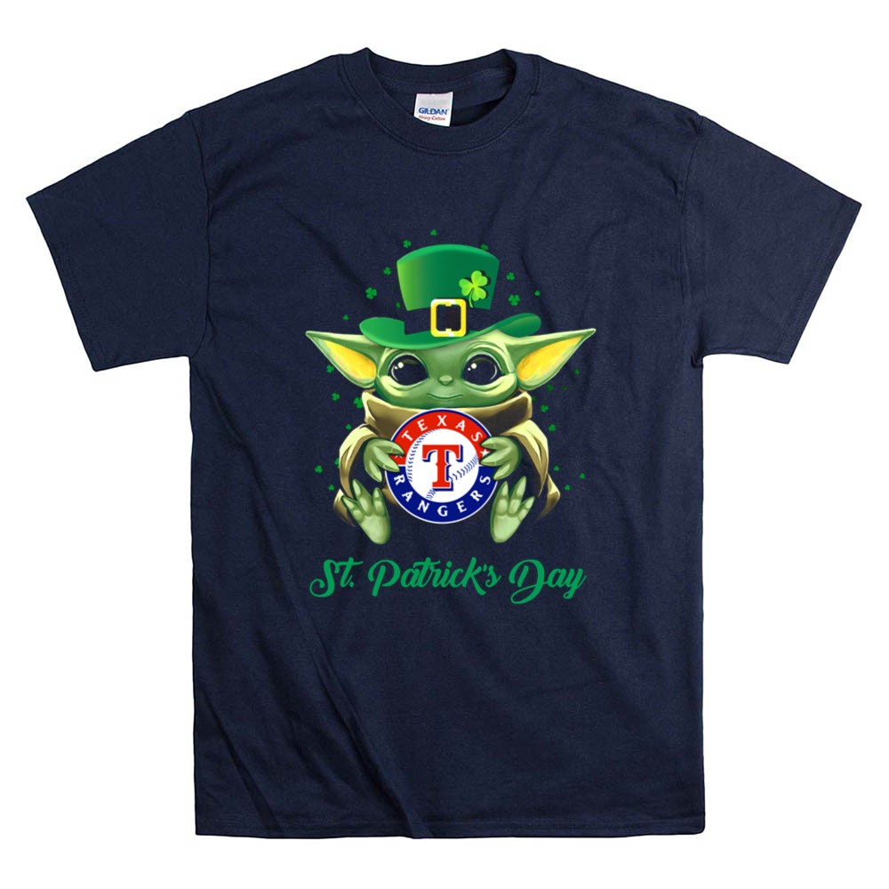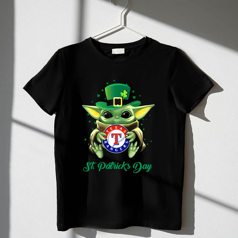 Texas Rangers, Baby Yoda, St. Patrick's Day apparel, MLB fan gear, cute sports shirt, festive baseball t-shirt, Texas pride, playful holiday wear