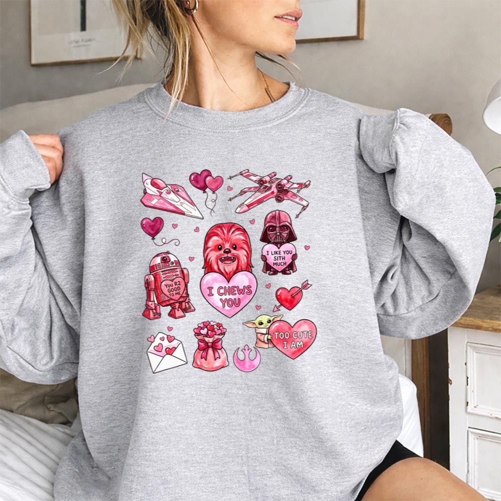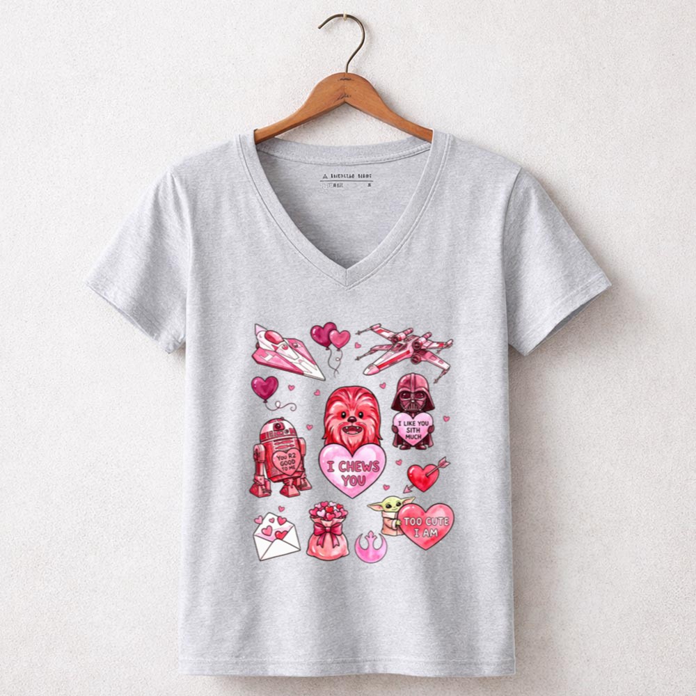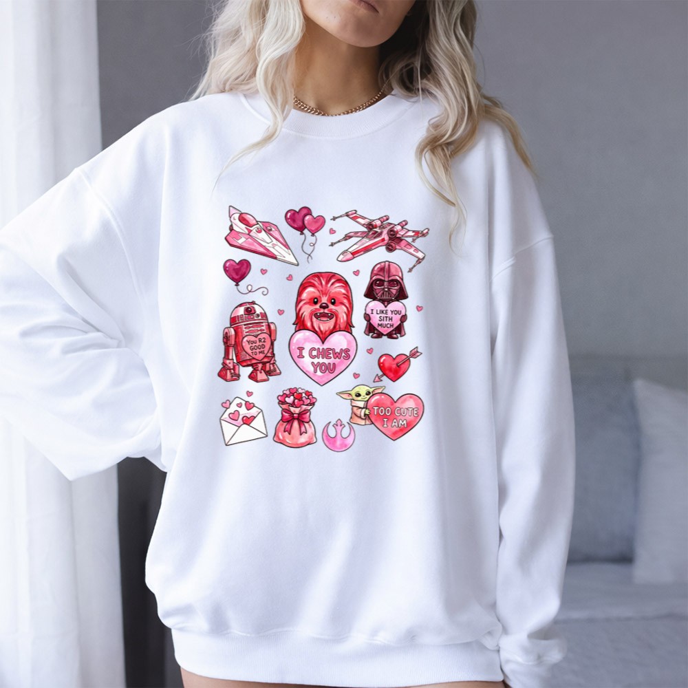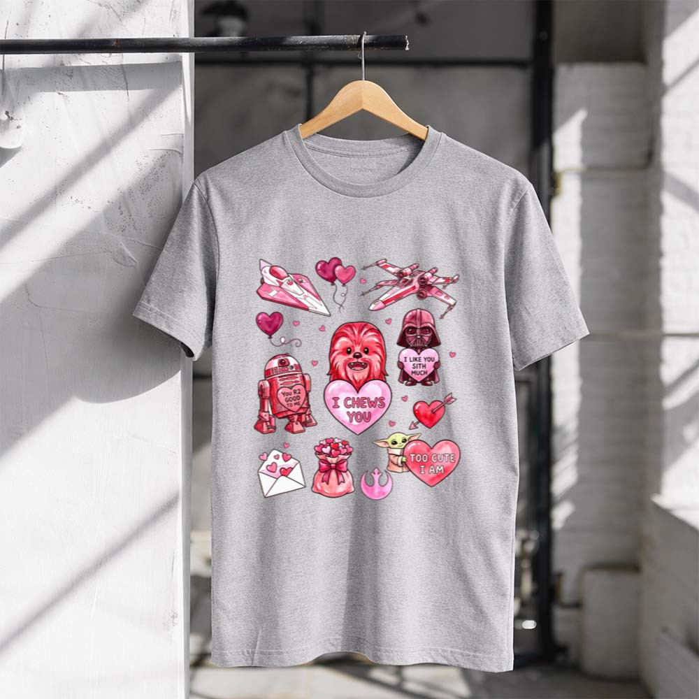This design captures the playful spirit of Valentine’s Day while celebrating the cherished bonds formed through the Star Wars saga. With Chewbacca, R2-D2, and Darth Vader coming together in a vibrant, cartoonish style, it warmly conveys affection and nostalgia, making it a delightful expression of love for both the galaxy and that special someone.