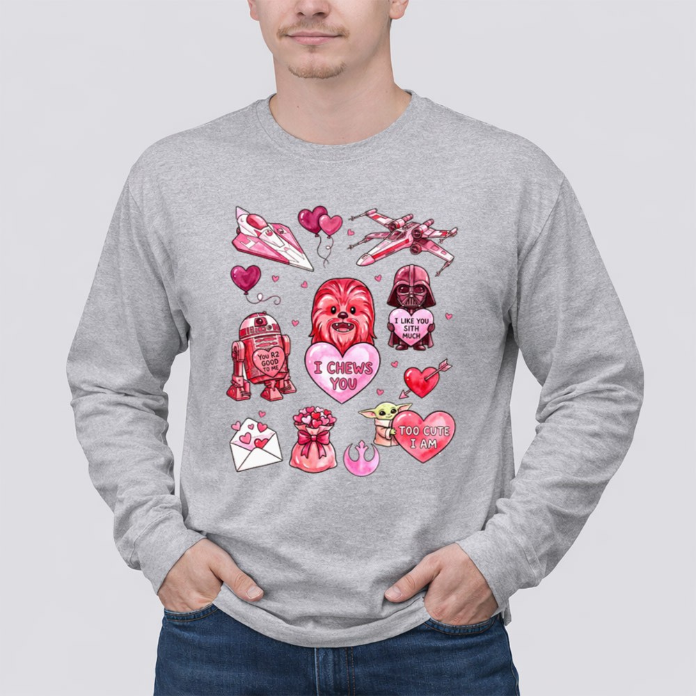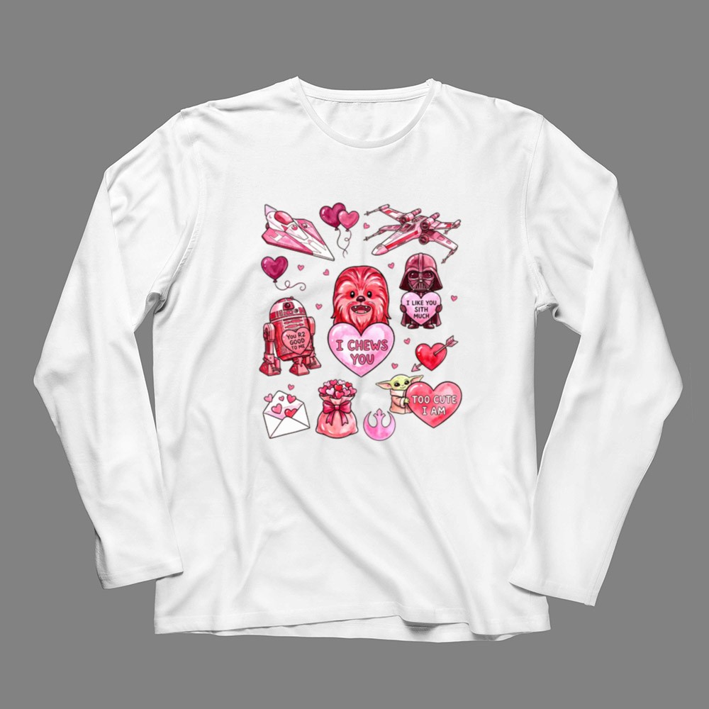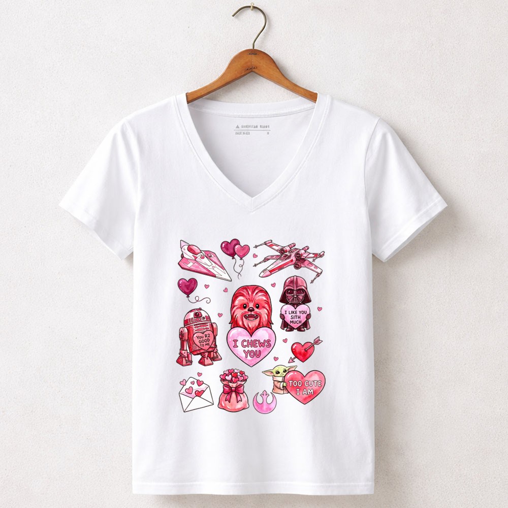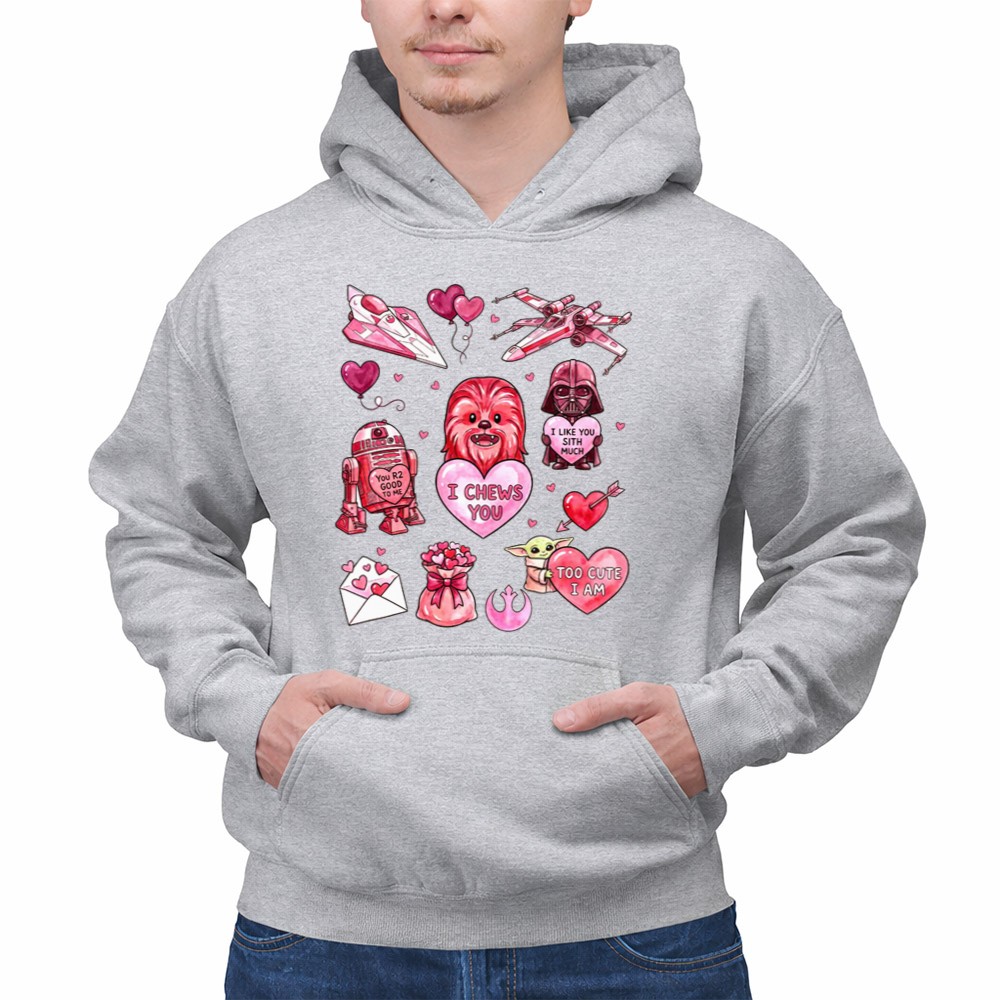 This design captures the playful spirit of Valentine’s Day while celebrating the cherished bonds formed through the Star Wars saga. With Chewbacca, R2-D2, and Darth Vader coming together in a vibrant, cartoonish style, it warmly conveys affection and nostalgia, making it a delightful expression of love for both the galaxy and that special someone.