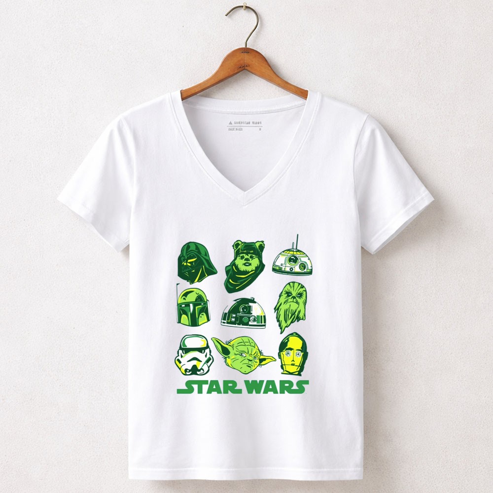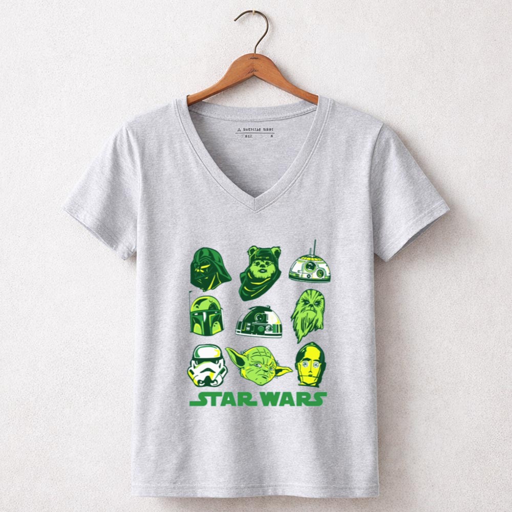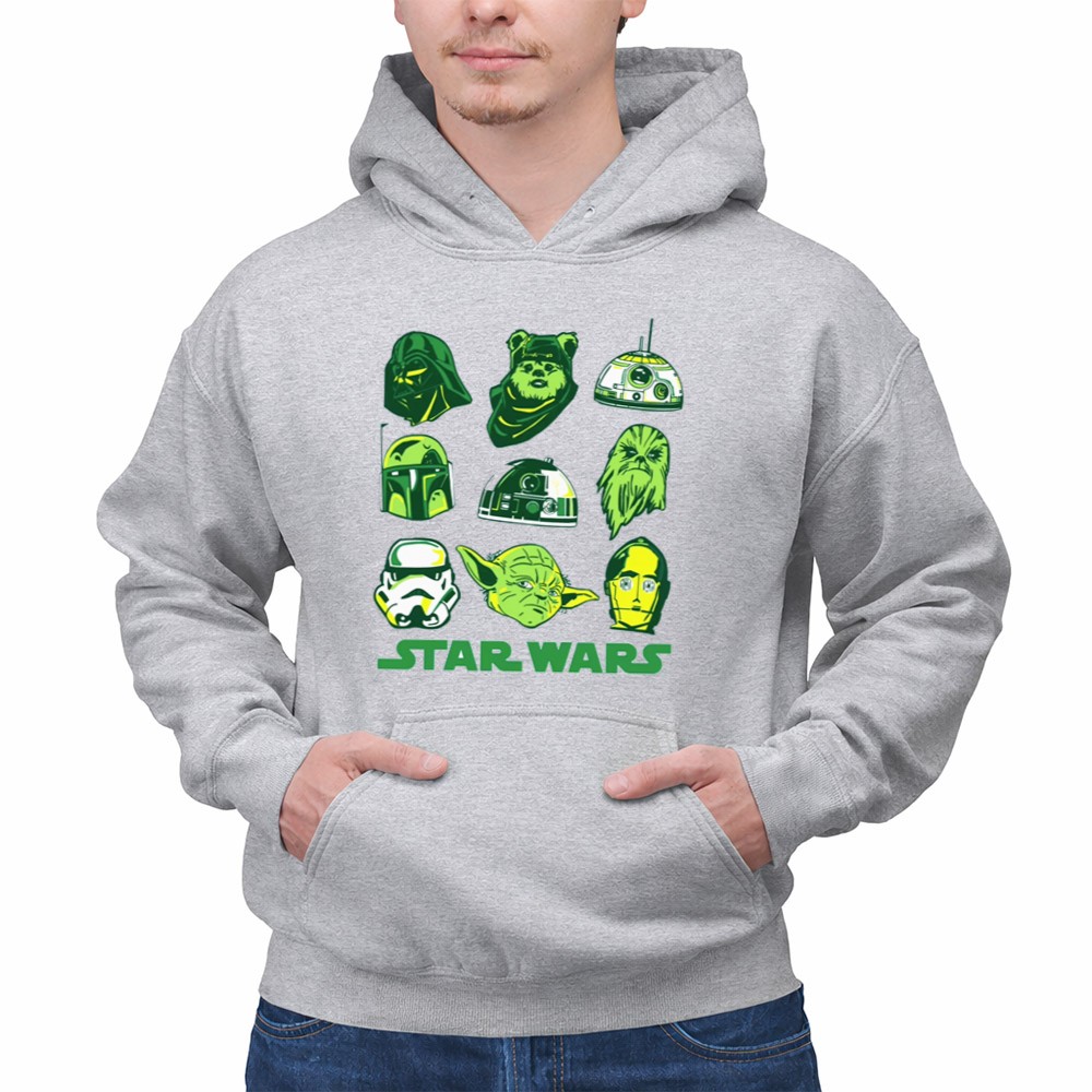 St. Patrick's Day Star Wars apparel, Yoda fan gear, Darth Vader t-shirt, whimsical character mashup, holiday spirit attire, green-themed clothing, Star Wars collectibles, fun gifts for fans