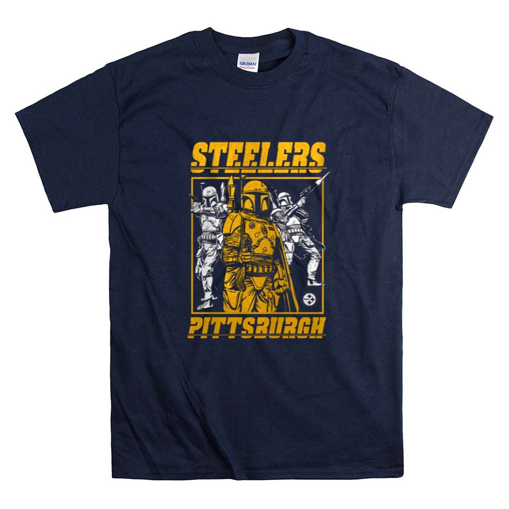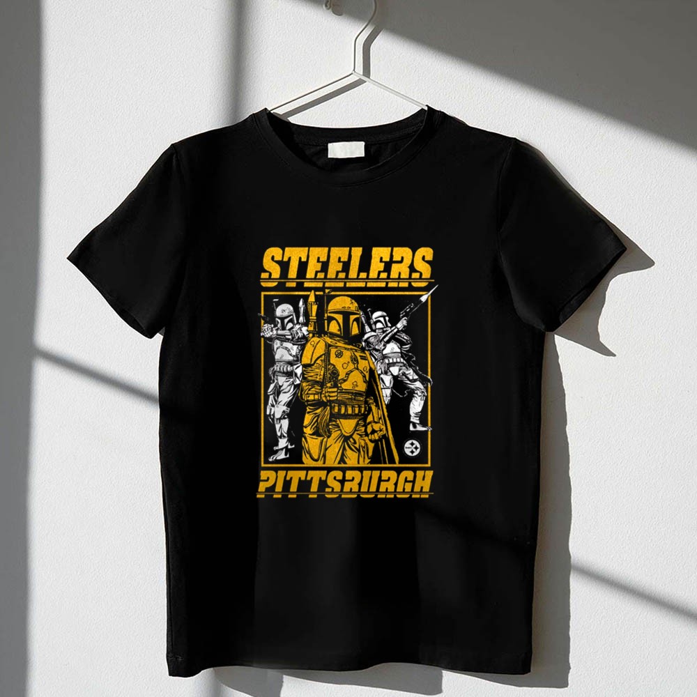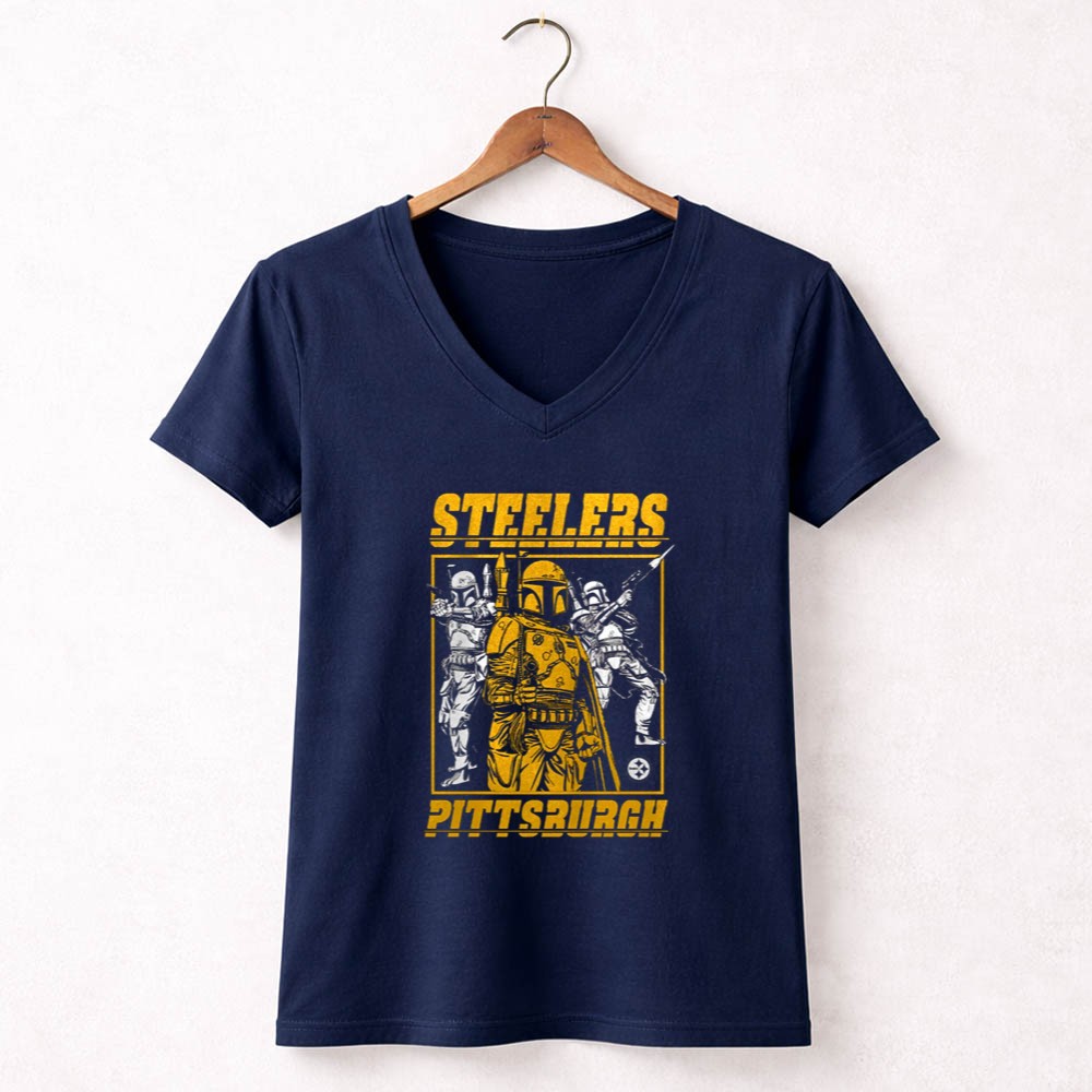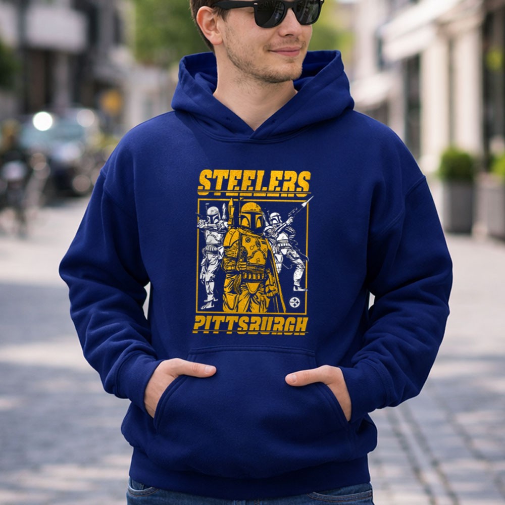 This design captures the essence of adventure and loyalty, merging the iconic Pittsburgh Steelers with the legendary Boba Fett and Stormtroopers. It reflects a unique sci-fi sports mashup, celebrating the shared passion of fans for both beloved franchises. Wear it as a bold statement of pride for the Steel City and its vibrant culture.