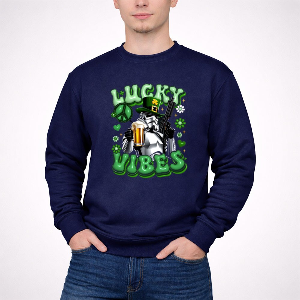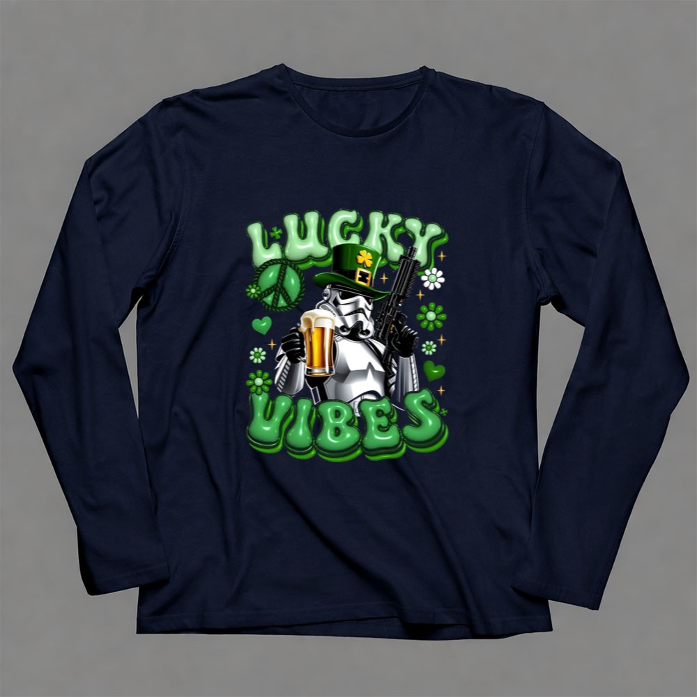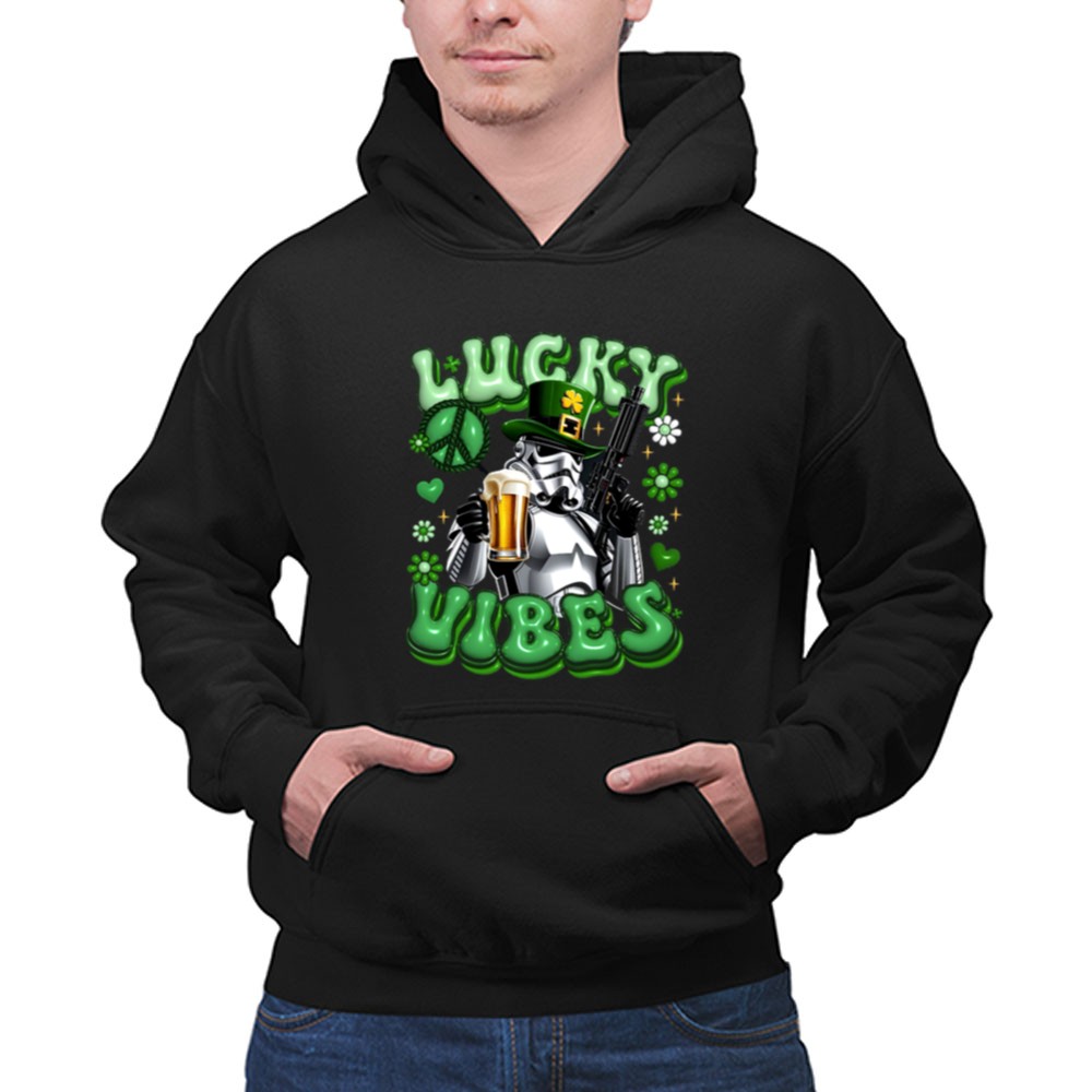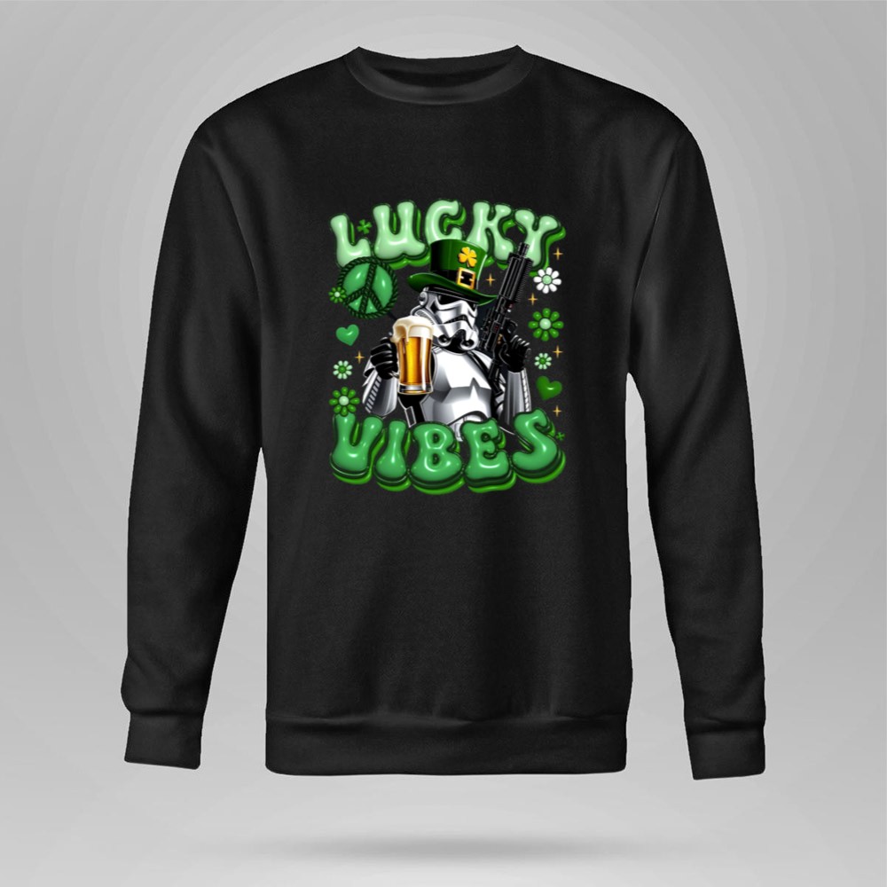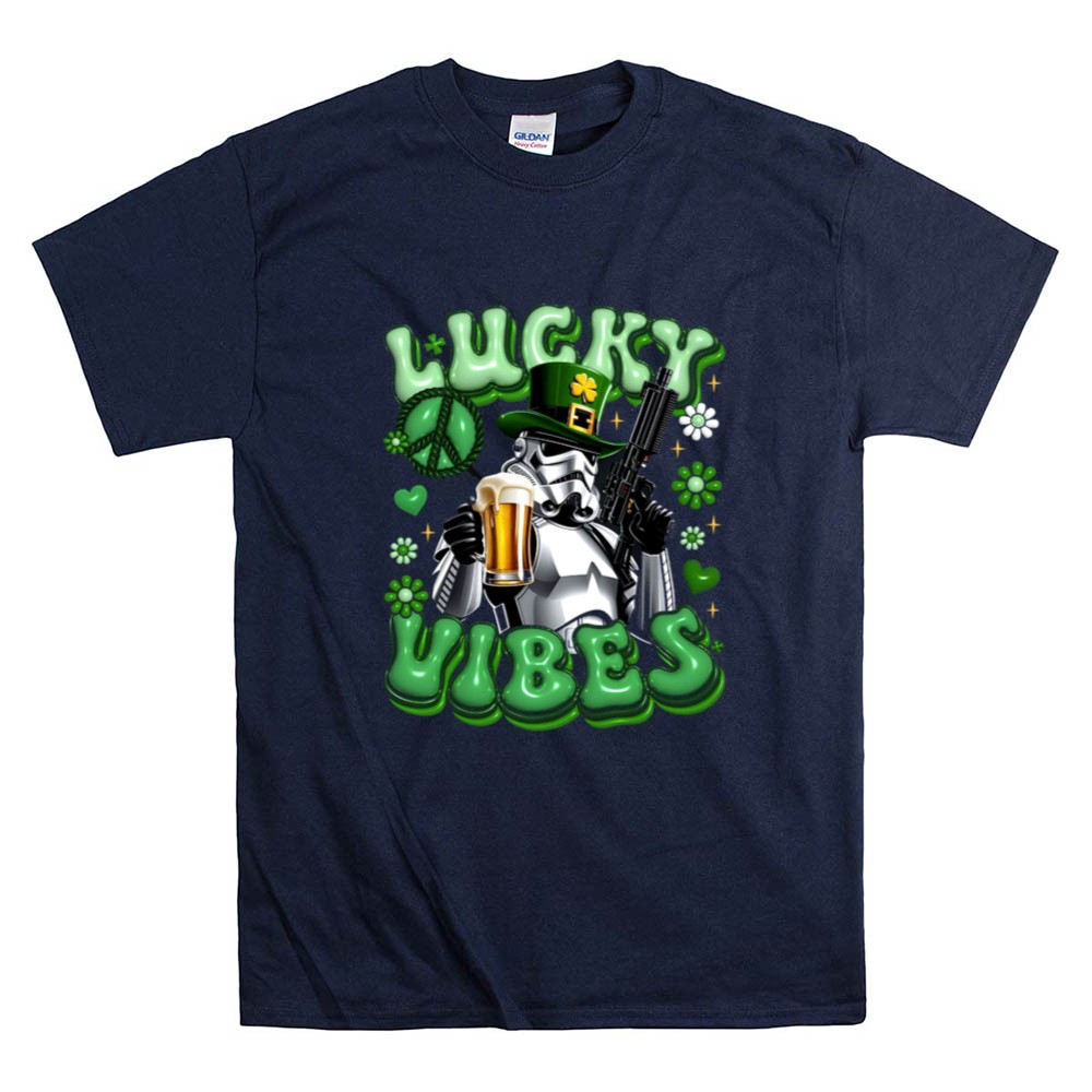 St. Patrick's Day apparel, Stormtrooper fan gear, lucky vibes t-shirt, beer celebration, pop culture mashup, humorous holiday shirt, shamrock graphics, festive party wear