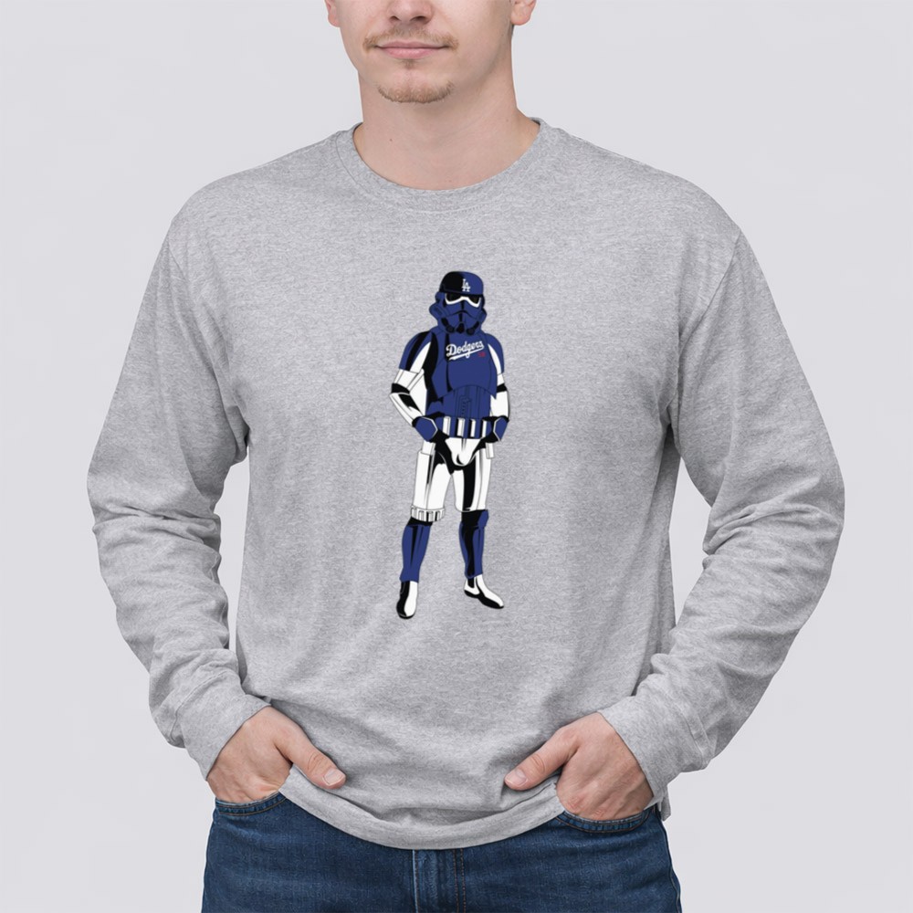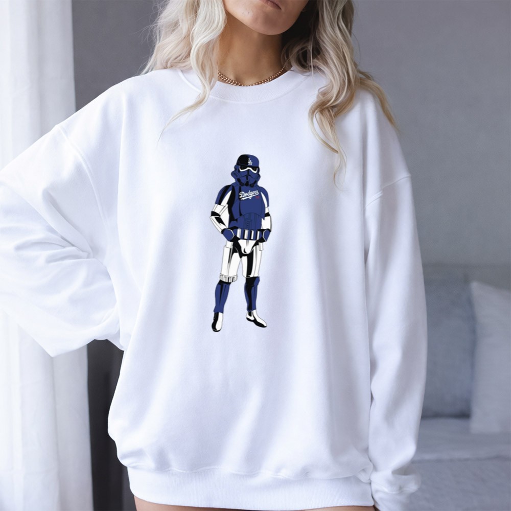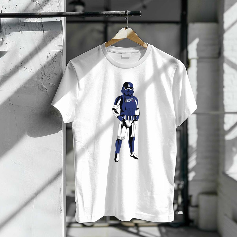 This design captures the essence of two iconic worlds collidingâimagine a Stormtrooper donning a blue Dodgers jersey and cap, symbolizing camaraderie among fans of baseball and the galaxy far, far away. Itâs a joyful tribute that evokes nostalgia while celebrating the shared spirit of sports and sci-fi culture.